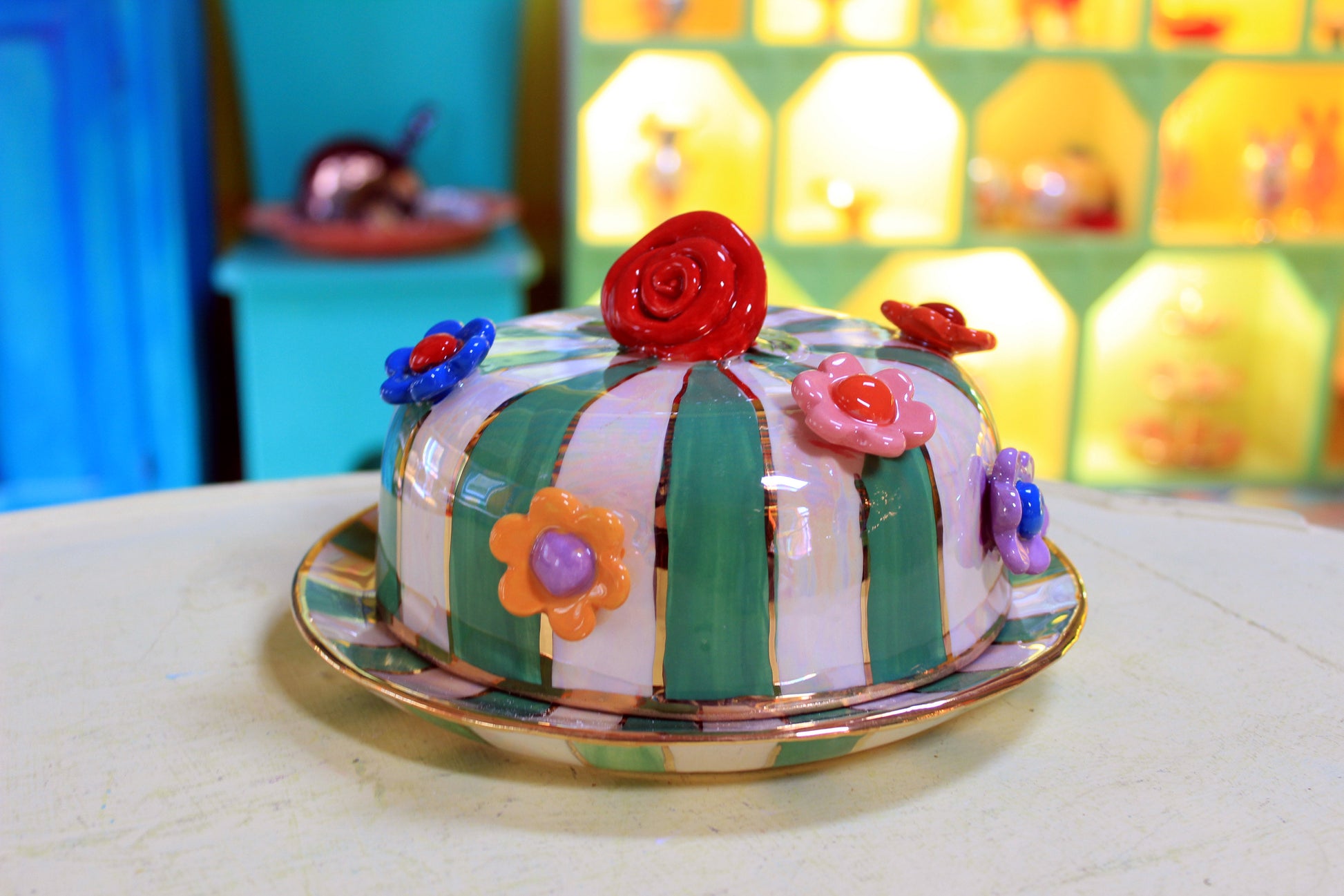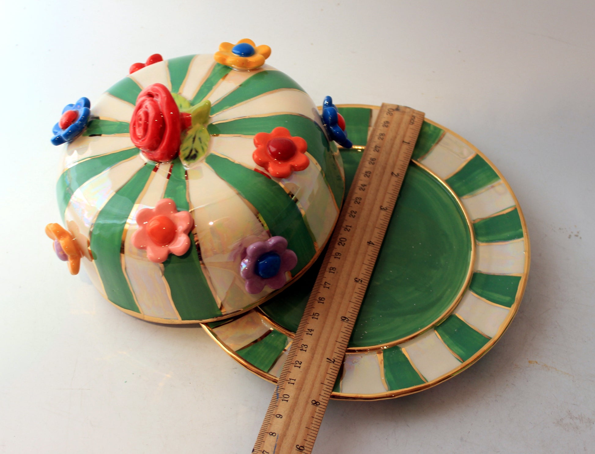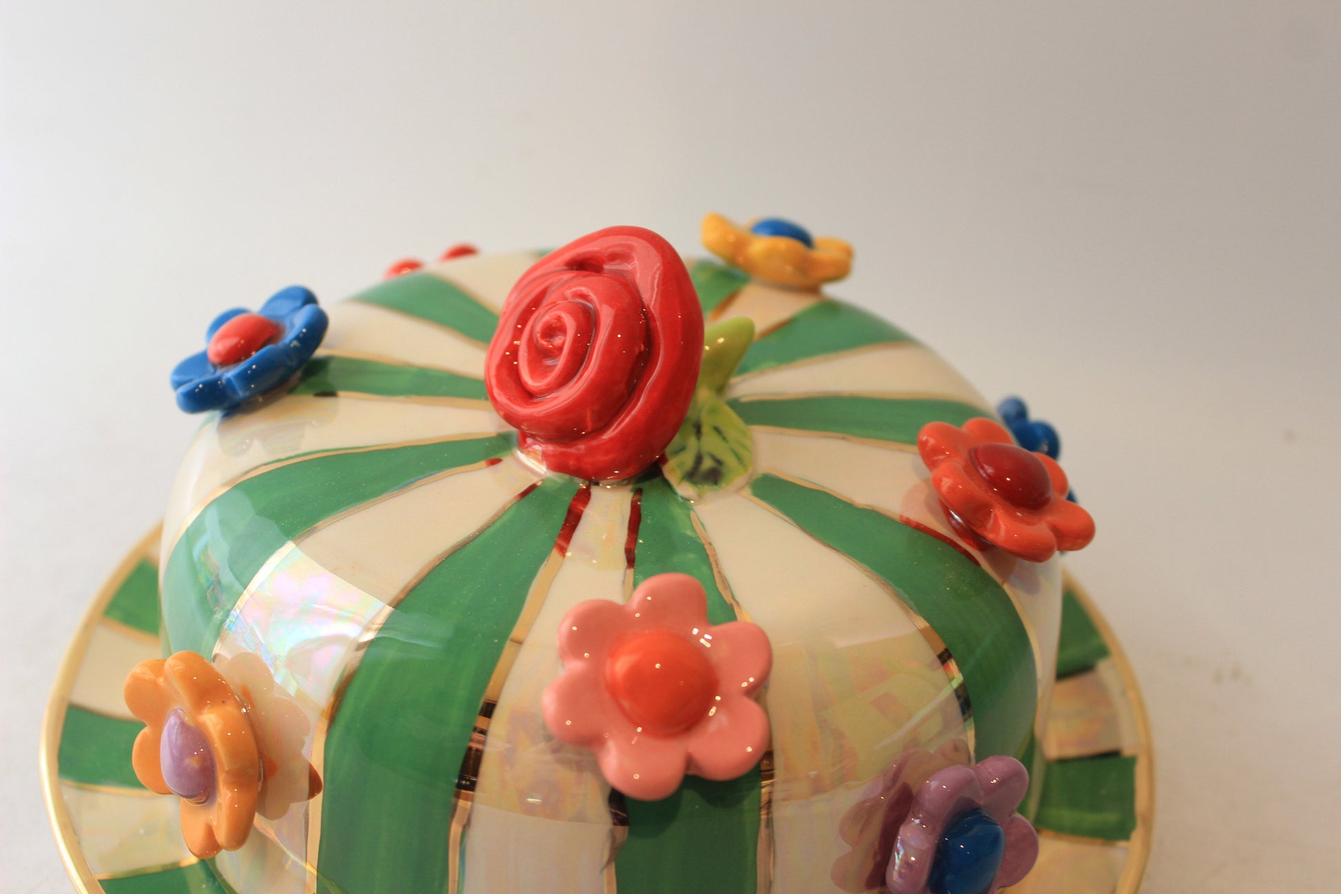 Multiflower Studded Butter Dish Green and White Stripe