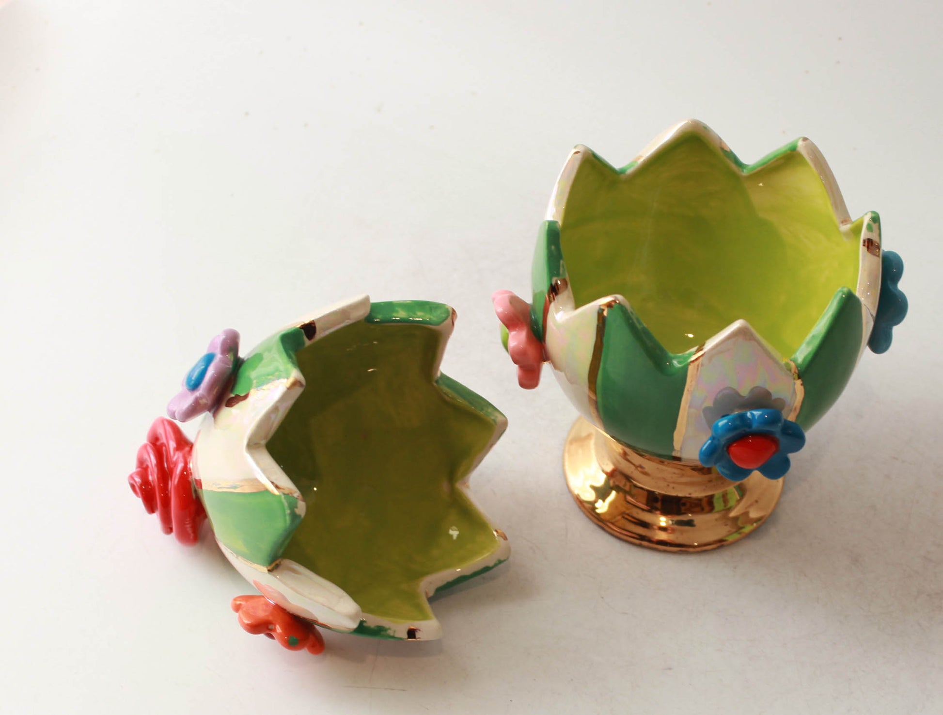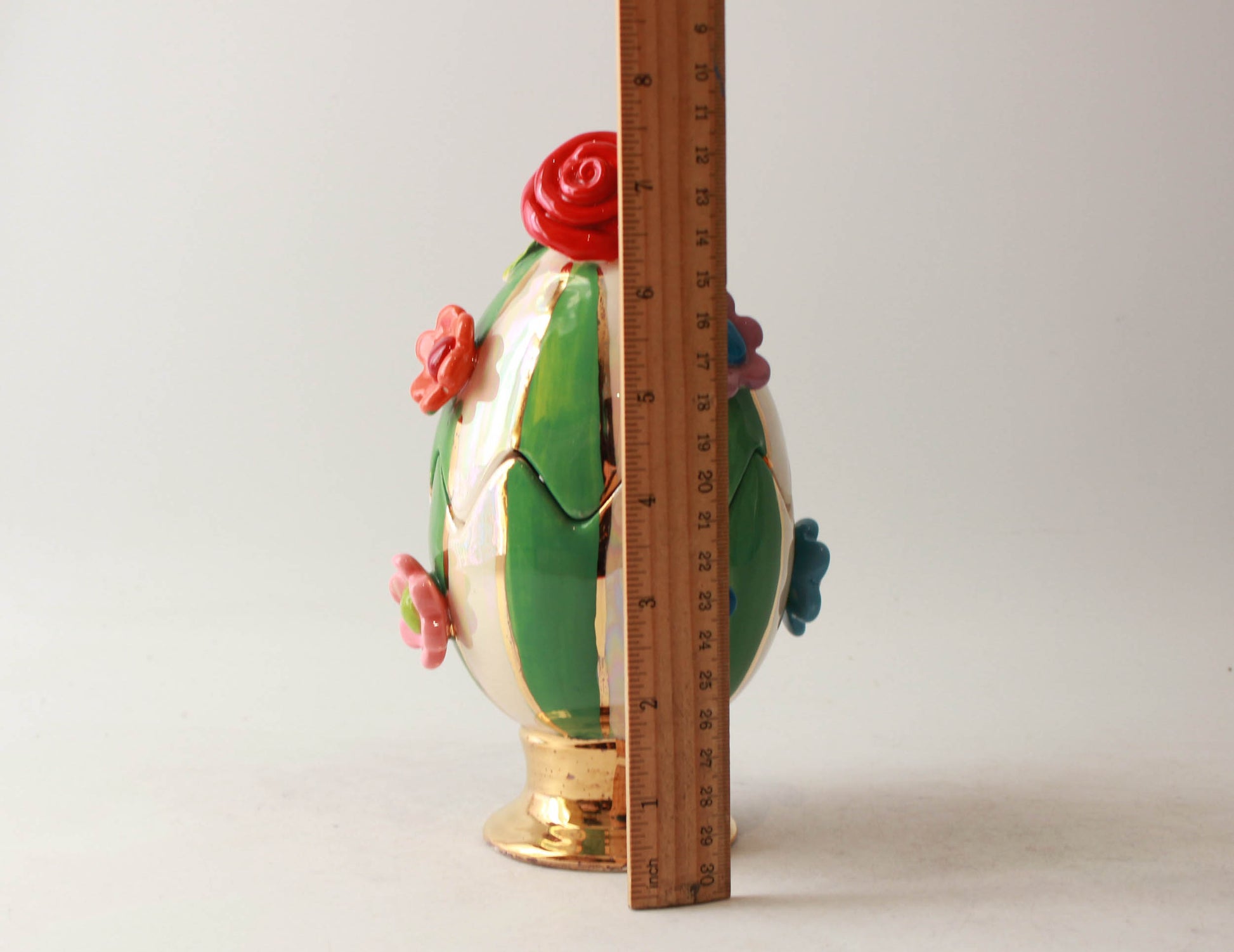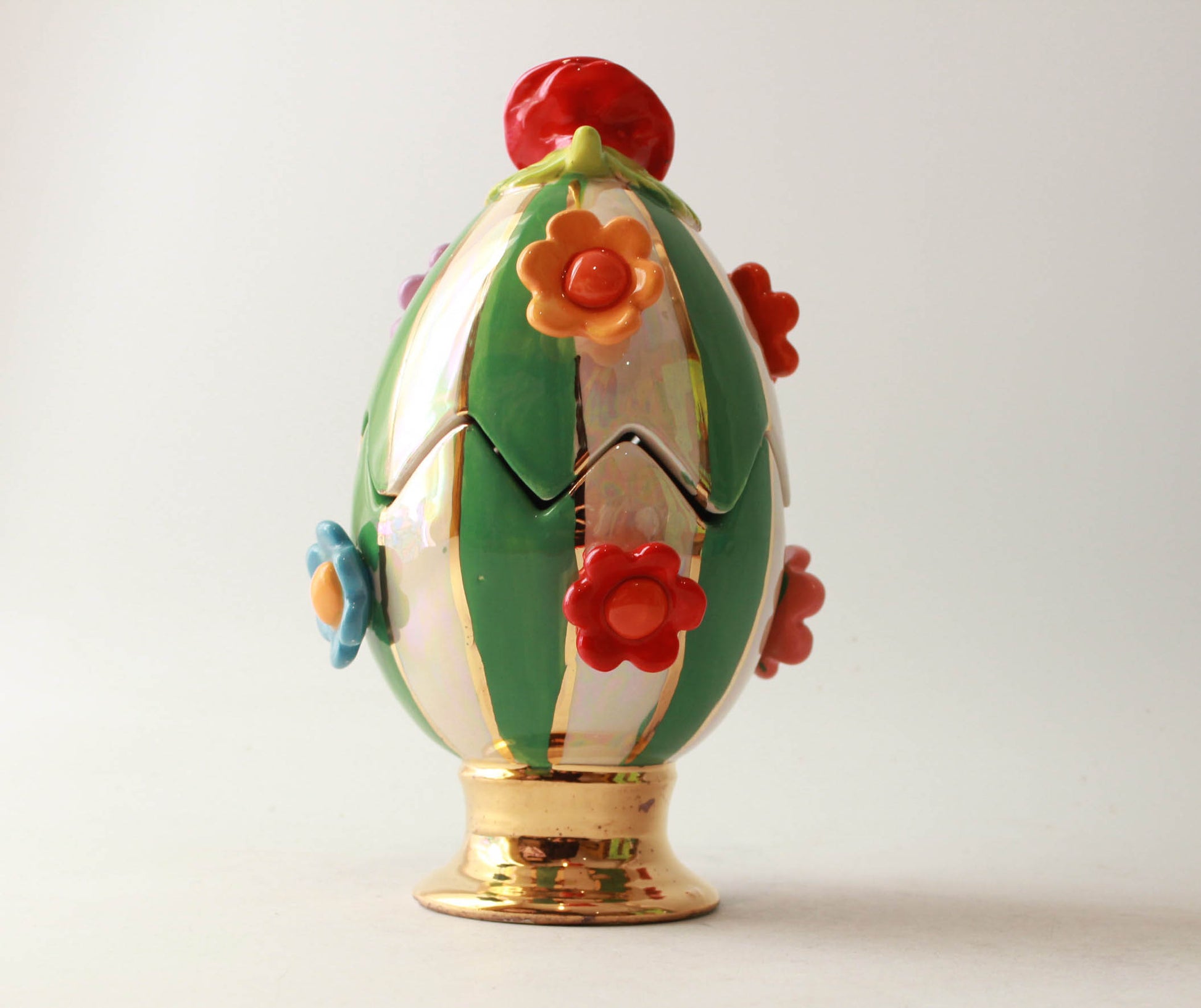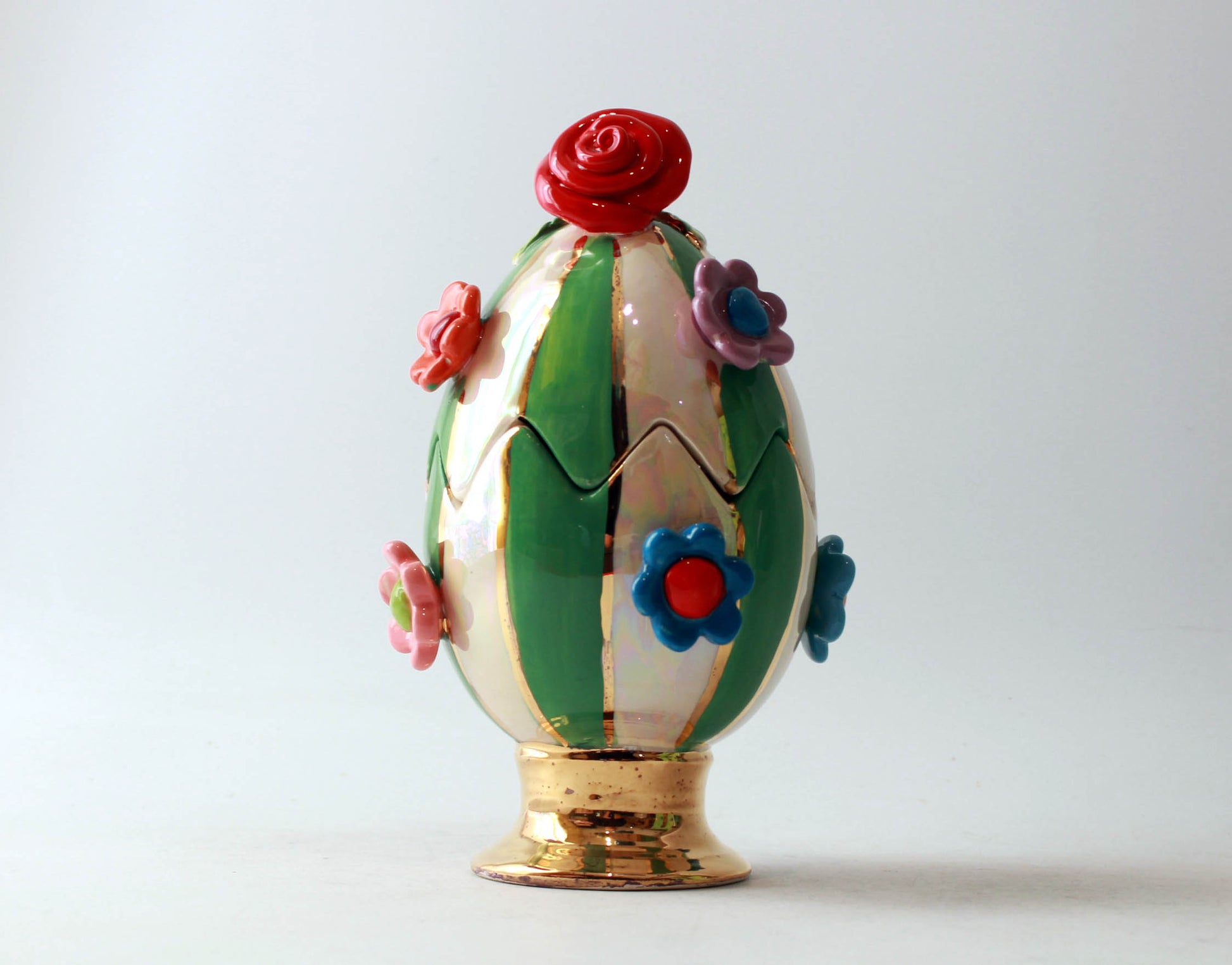 Easter coincides with unfortunate events in the life of Jesus....but it's also our celebration of the coming of spring, so Mary Rose has painted green and white stripes to mirror the fast growing plants, and a host of colourful flowers to remind us of nature's glory. This beautiful ceramic egg is a most eclectic souvenir of spring.