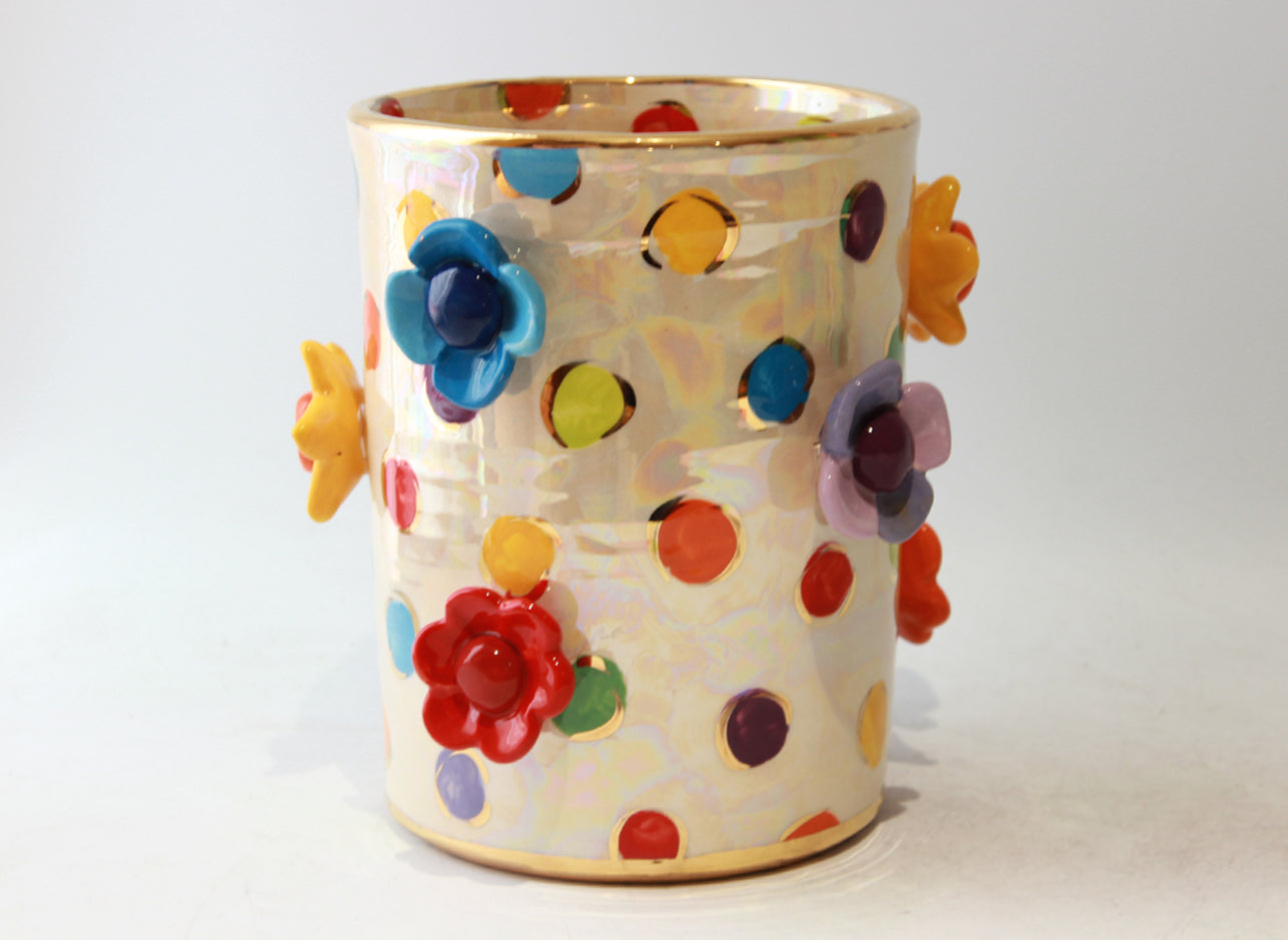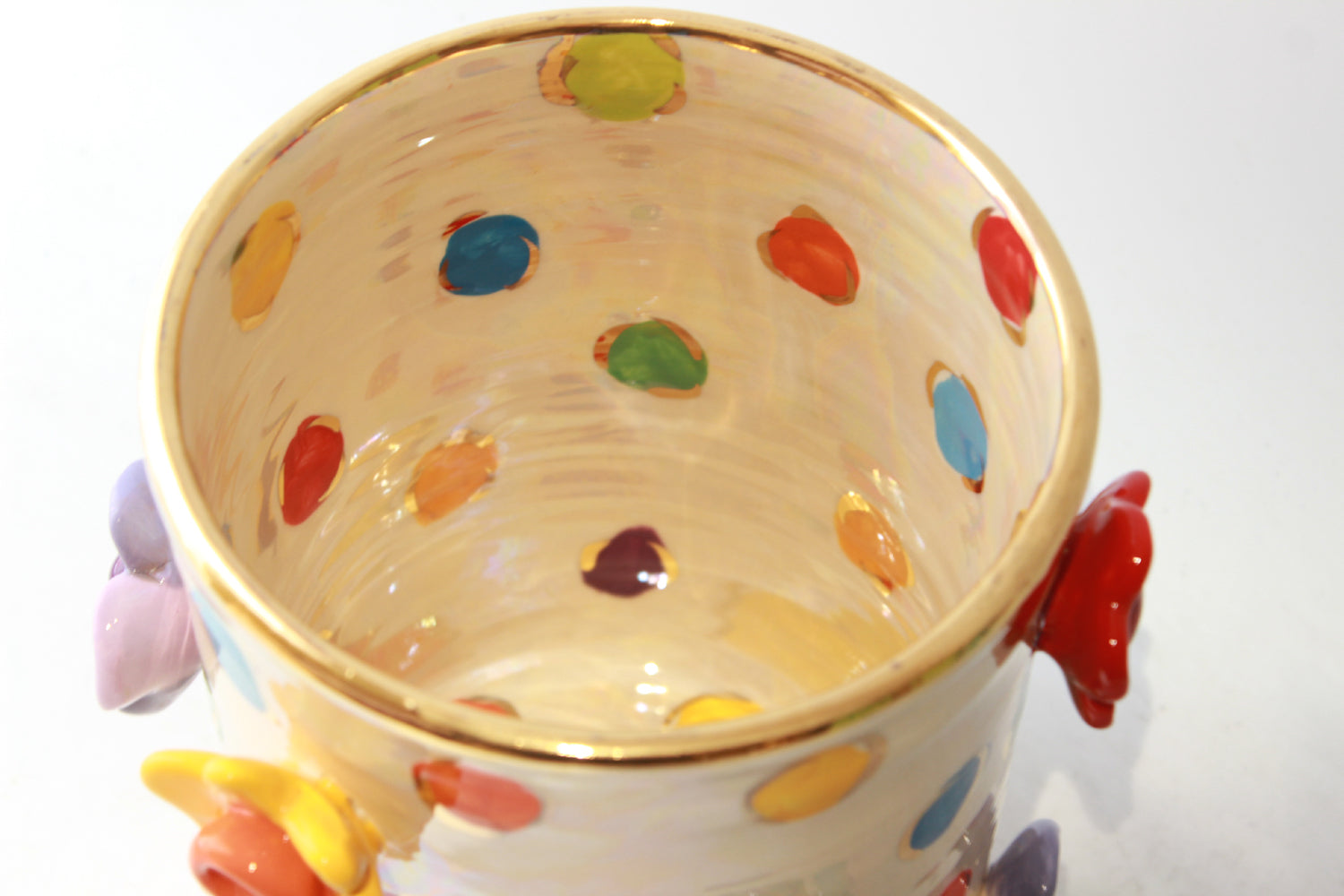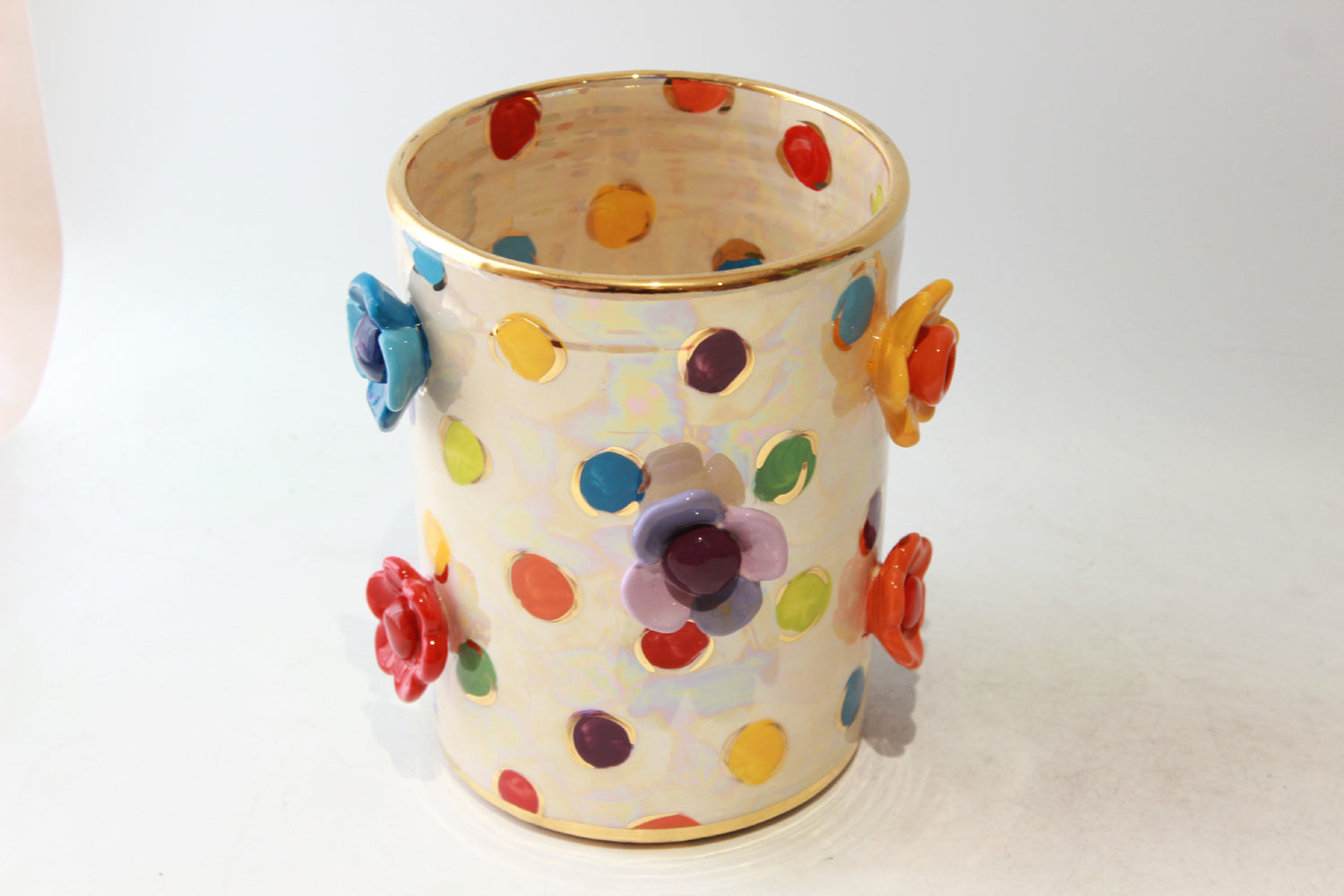 The perfect home for your assortment of Can Openers, Ladles, Wooden Spoons and Whisks, or how to bring order to chaos and perhaps make the whole thing look pretty too. It's just under 8 inches high and about 6 inches diameter and is decorated fetchingly in Coloured Dot design with the brightest shiniest 3D flowers sprouting out between the dots