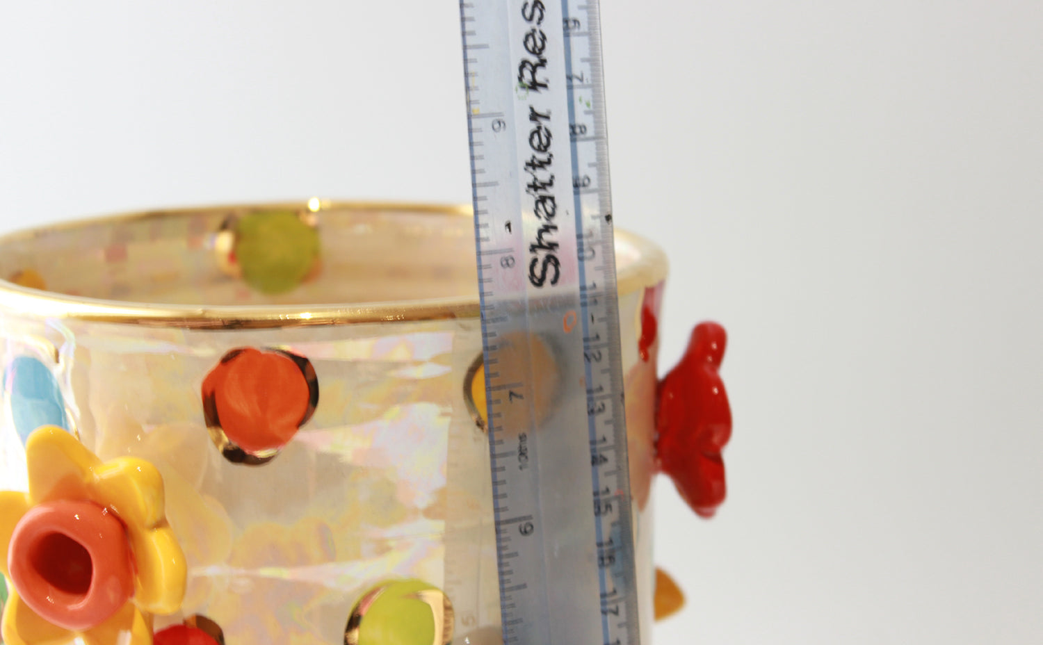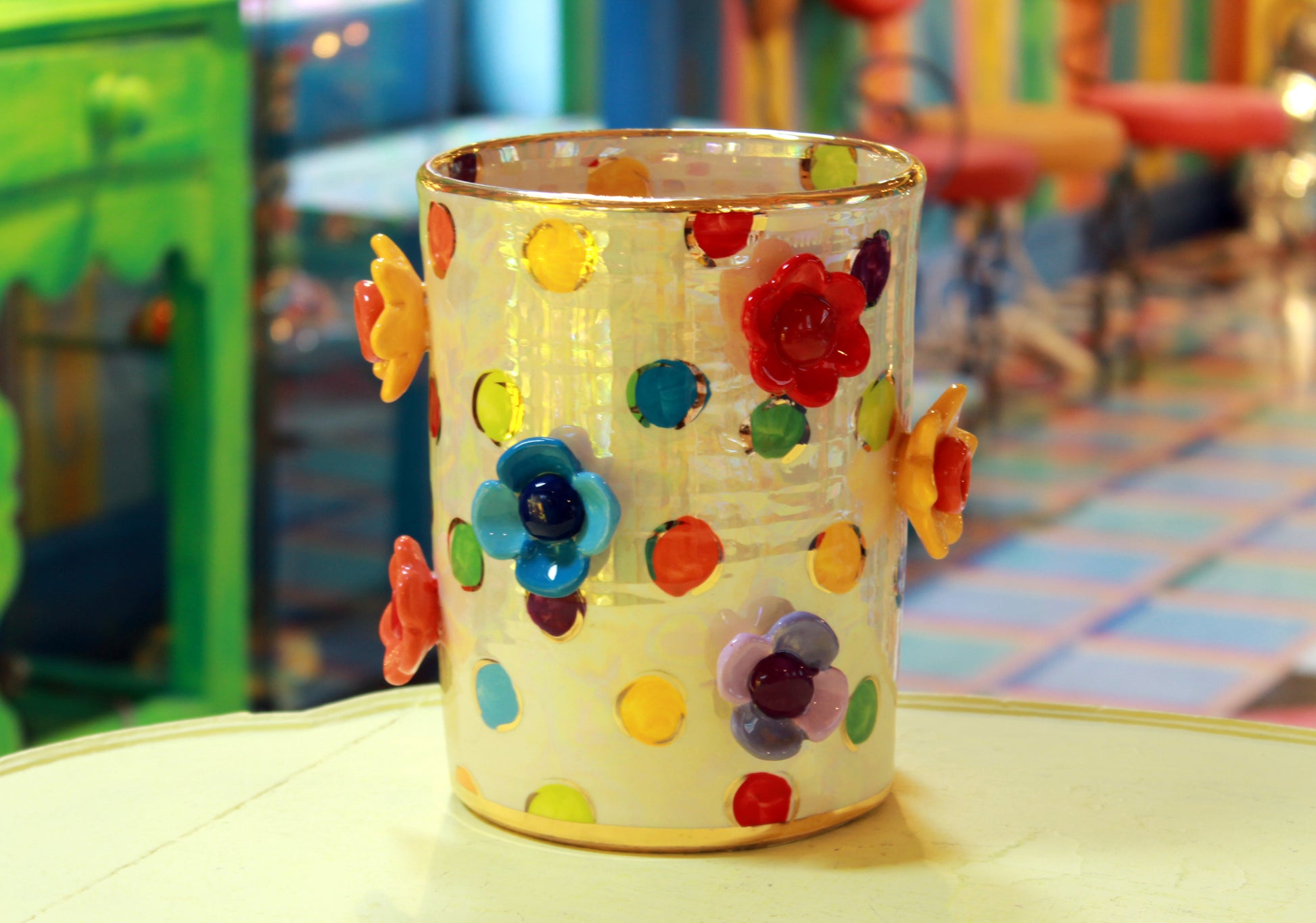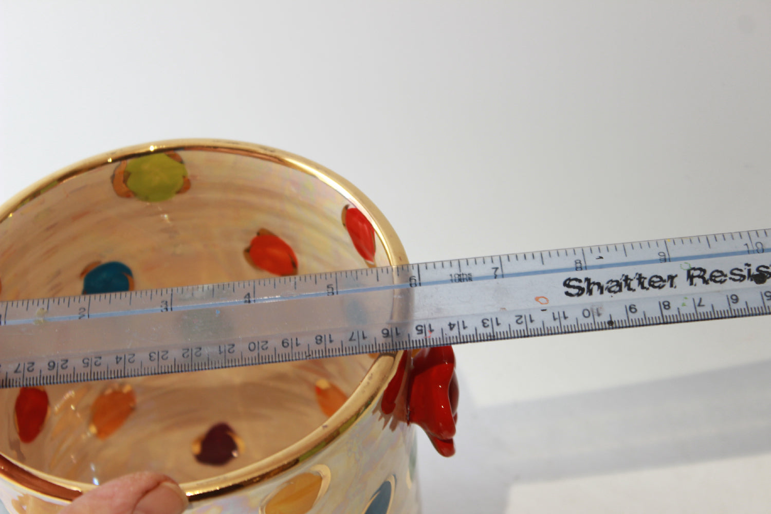The perfect home for your assortment of Can Openers, Ladles, Wooden Spoons and Whisks, or how to bring order to chaos and perhaps make the whole thing look pretty too. It's just under 8 inches high and about 6 inches diameter and is decorated fetchingly in Coloured Dot design with the brightest shiniest 3D flowers sprouting out between the dots
