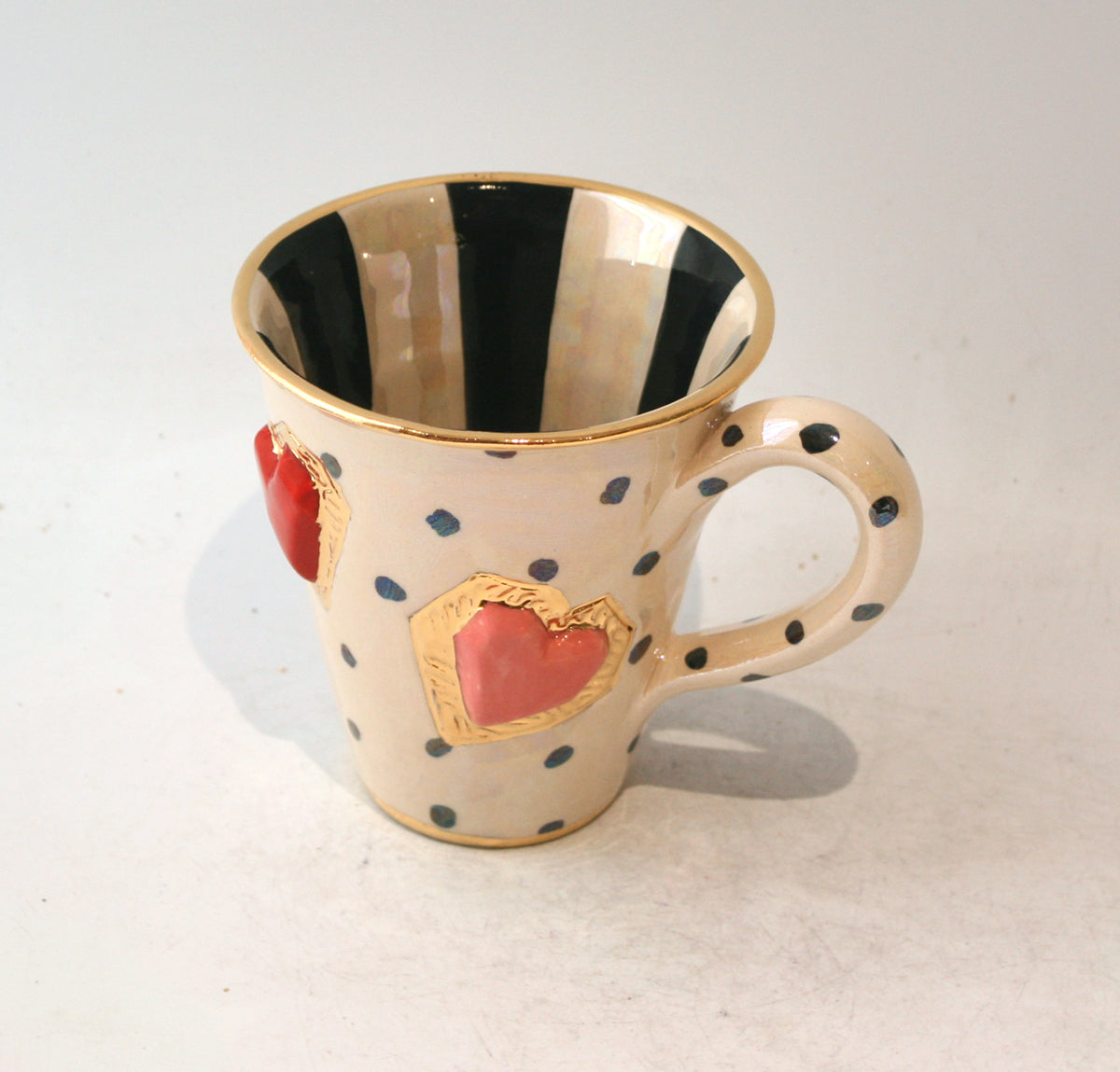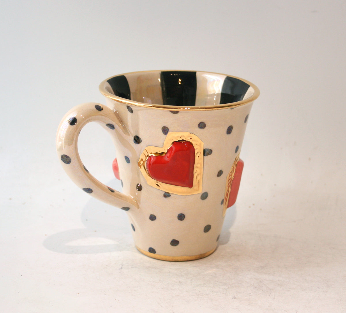 What better display of love can there be than this romantic Mary Rose Young Mug? A New Shape Large Mug made by Mary Rose measures around 4.25 inches in height, and this one has pink and red hearts stuck all over a background of Polka Dots on iridescence...the inside is black and white stripes, and the Mug is completed by accents of 24 carat gold!