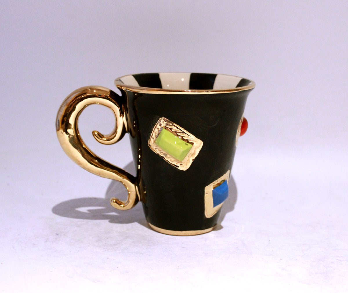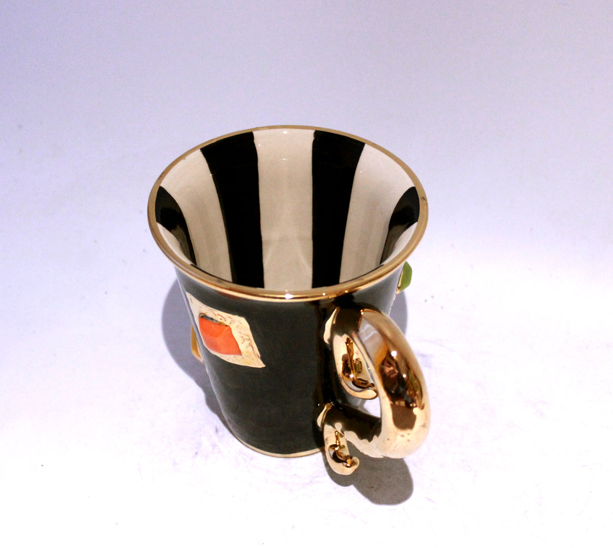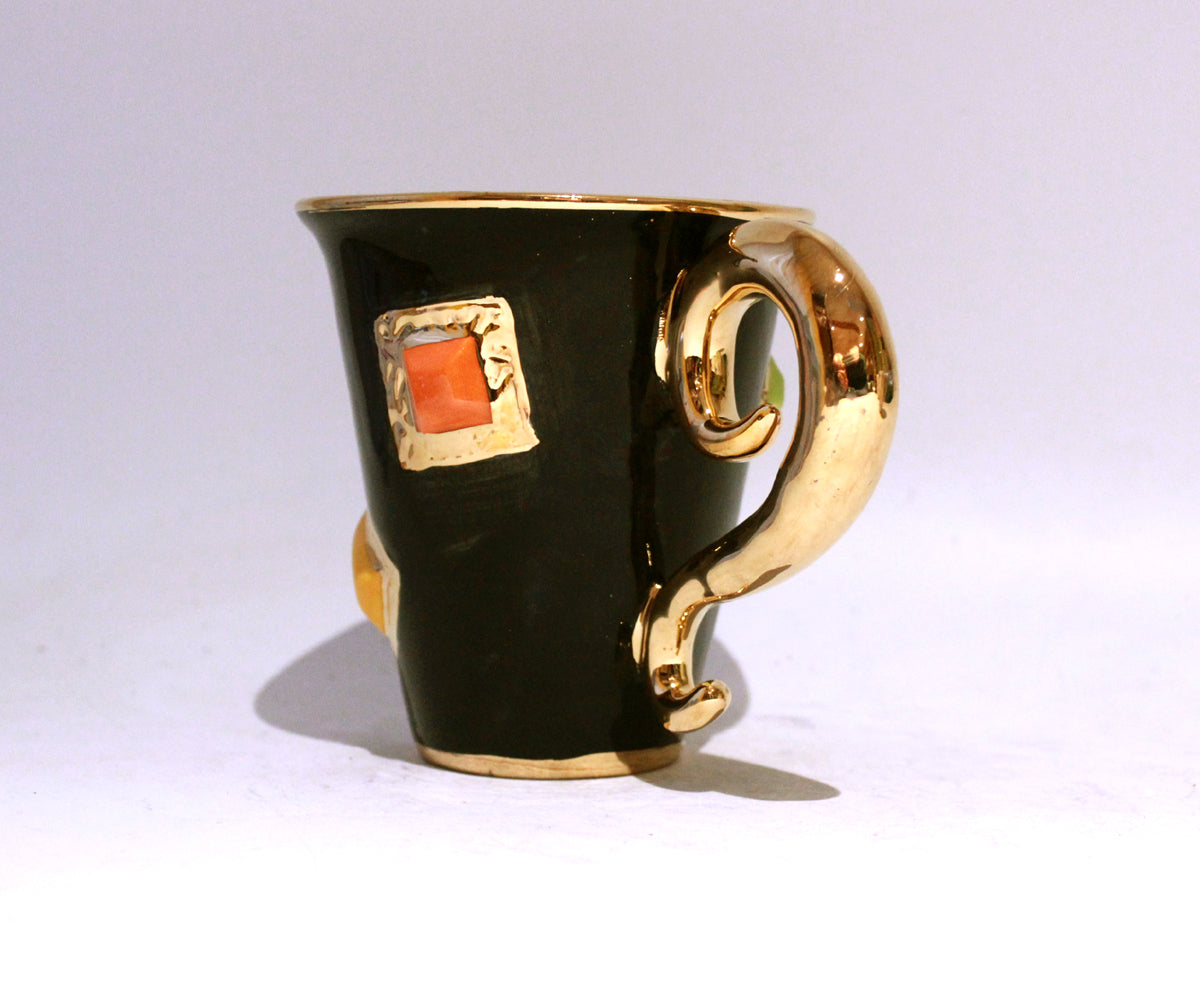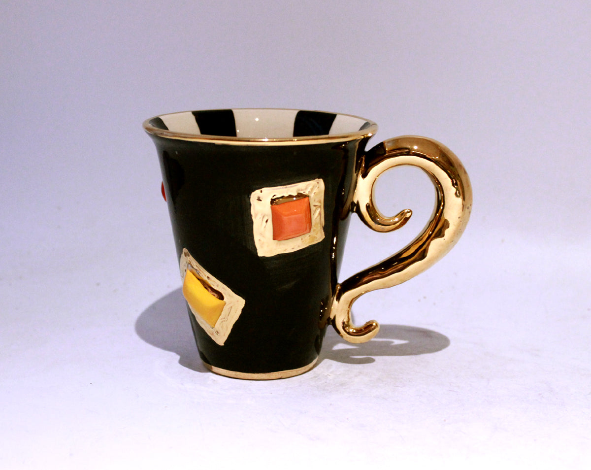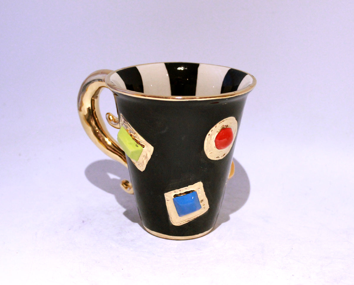New Shape Large Mugs are the perfect size for a good helping of any beverage! This one is looking rather regal indeed...it is painted in black with a monochrome striped inside, and has had handmade ceramic jewels stuck all over its surface bordered by accents of 24 carat gold...it also features a "Lady Gaga Handle"; lavishly painted in 24 carat gold and adding a level of glamour one might expect from the residents of Buckingham Palace!