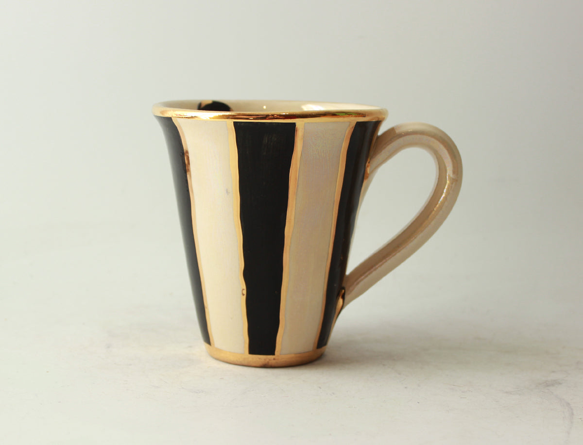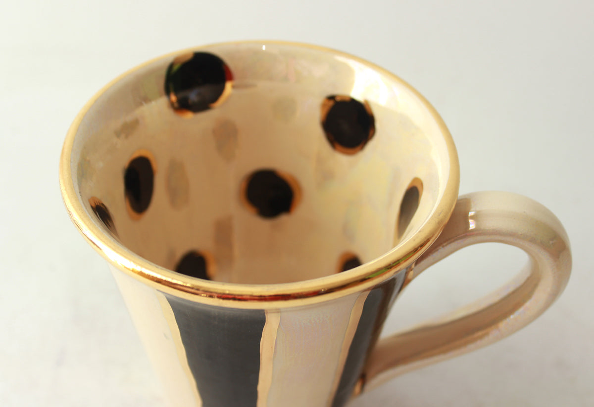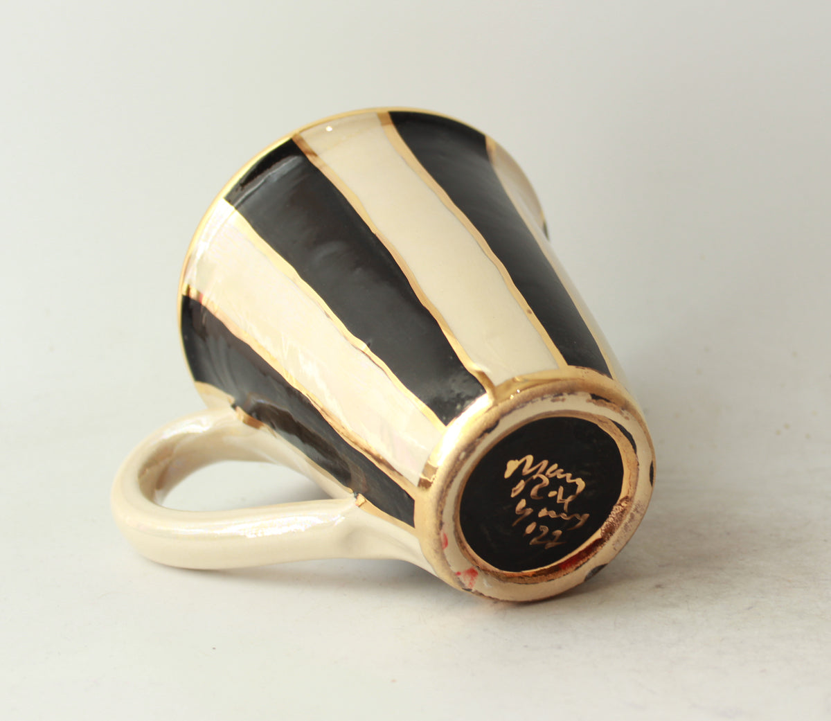 Mary Rose's New Shape Large Mugs stand around 4.25 inches tall and make excellent canvases for her designs...this one is painted in "Black and White Stripe" outside with "Polka" inside, finished with Mother of Pearl and accents of 24 carat gold