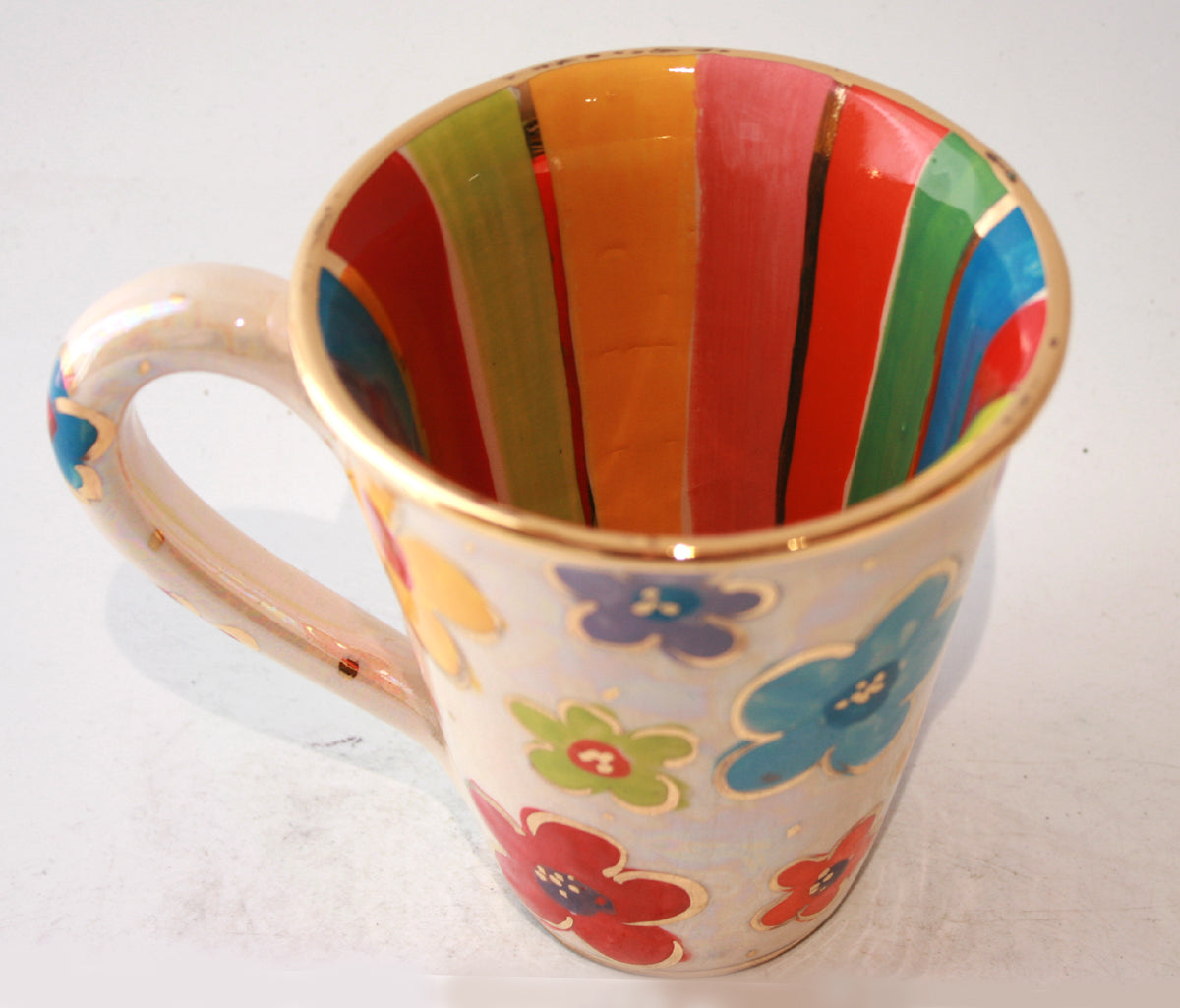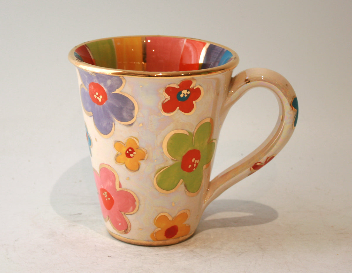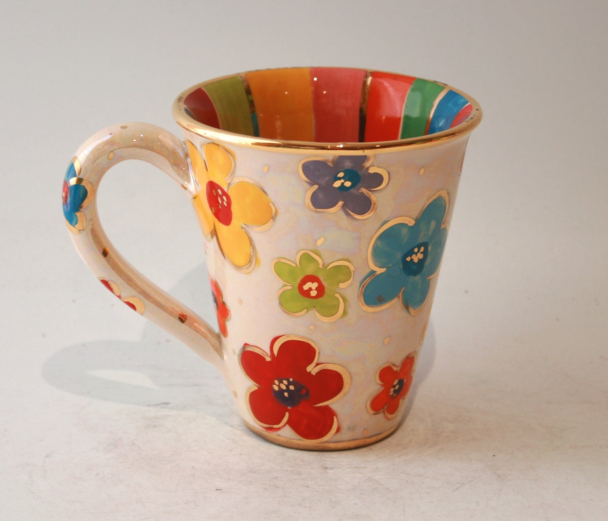 Mary Rose's New Shape Large Mugs stand around 4.25 inches tall, and are perfect for your beverage of choice...this one is painted in "Daisy" design with colourful stripes on the inside...