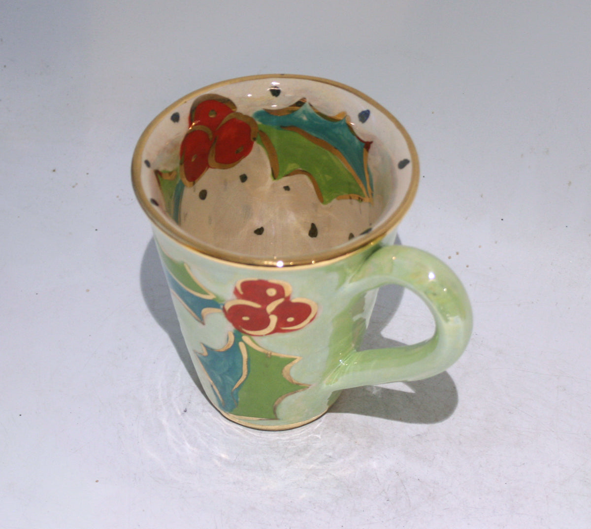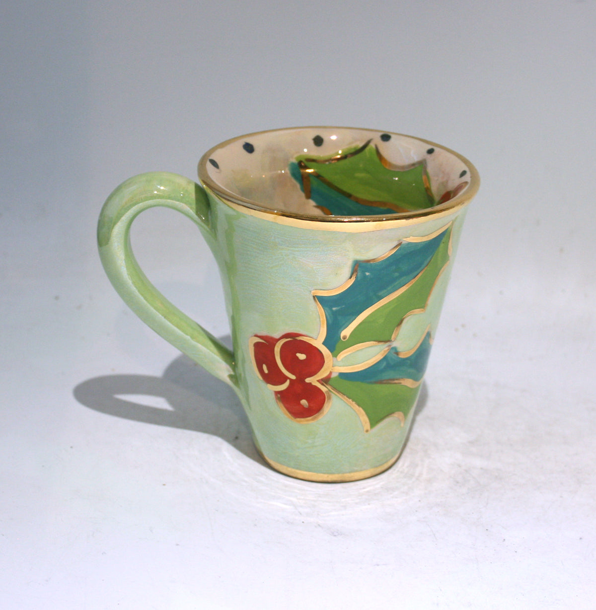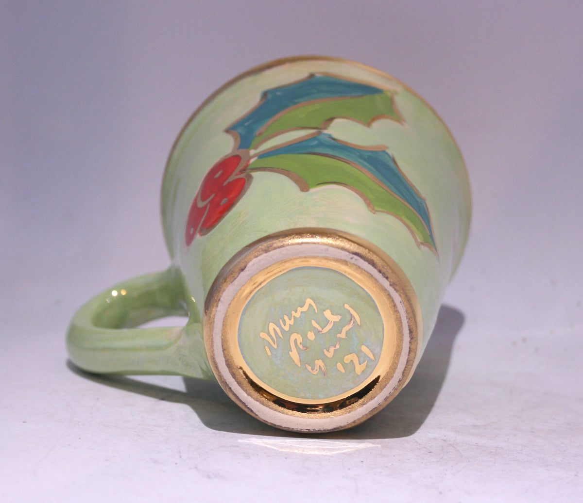 Another perfect companion for your Tea or Coffee routine! Mary Rose's New Shape Large Mugs measure around 4.25 inches in height, and this one is painted in a new version of "Holly" design with a layer of iridescent green surrounding the pretty flowers...accents of 24 carat gold complete the piece, and it can form part of a wonderful set if you so wish!