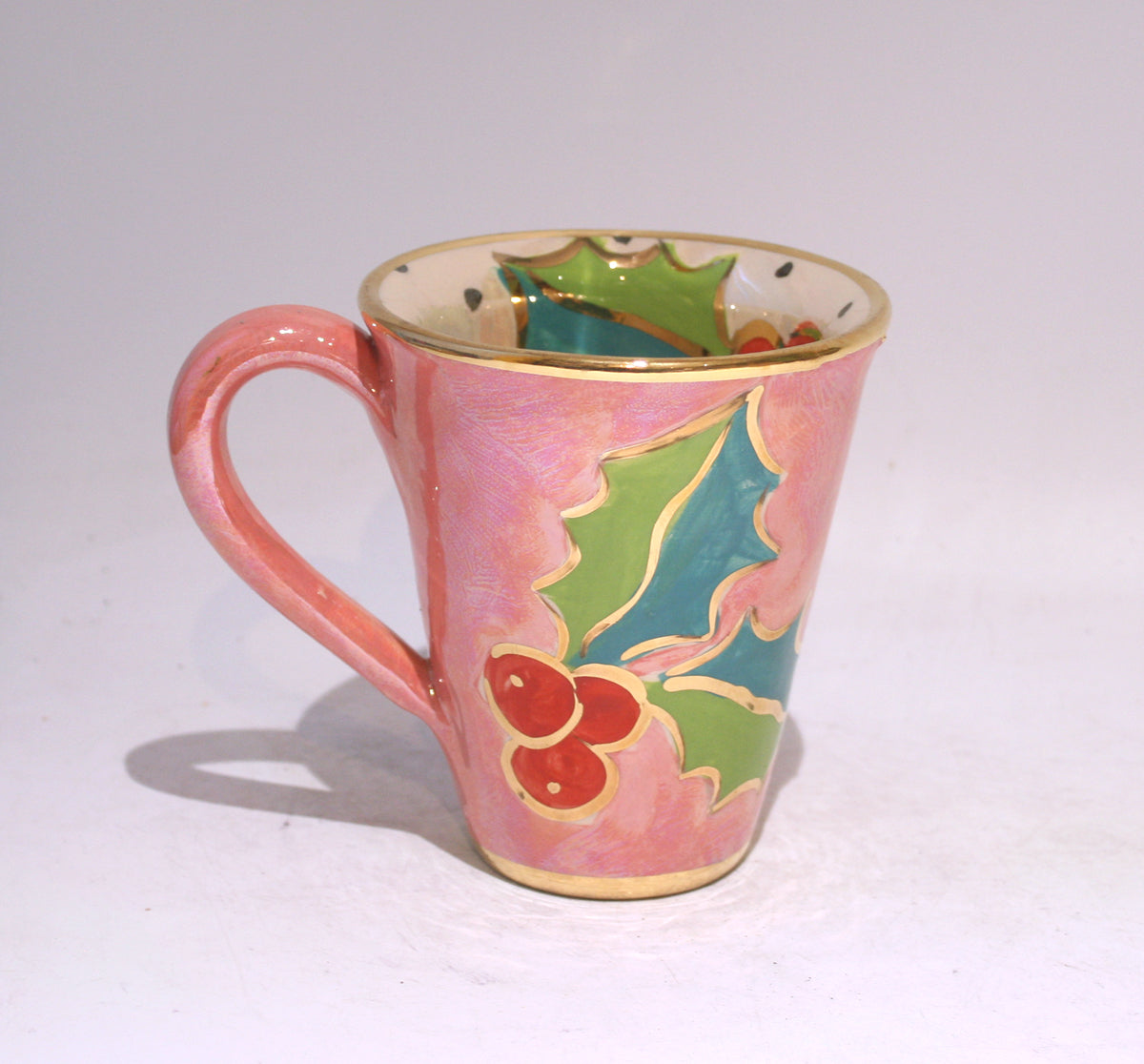 Another perfect companion for your Tea or Coffee routine! Mary Rose's New Shape Large Mugs measure around 4.25 inches in height, and this one is painted in a new version of the "Holly" design with a layer of iridescent pink surrounding the pretty flowers...accents of 24 carat gold complete the piece, which can also form part of a wonderful set if you so wish!