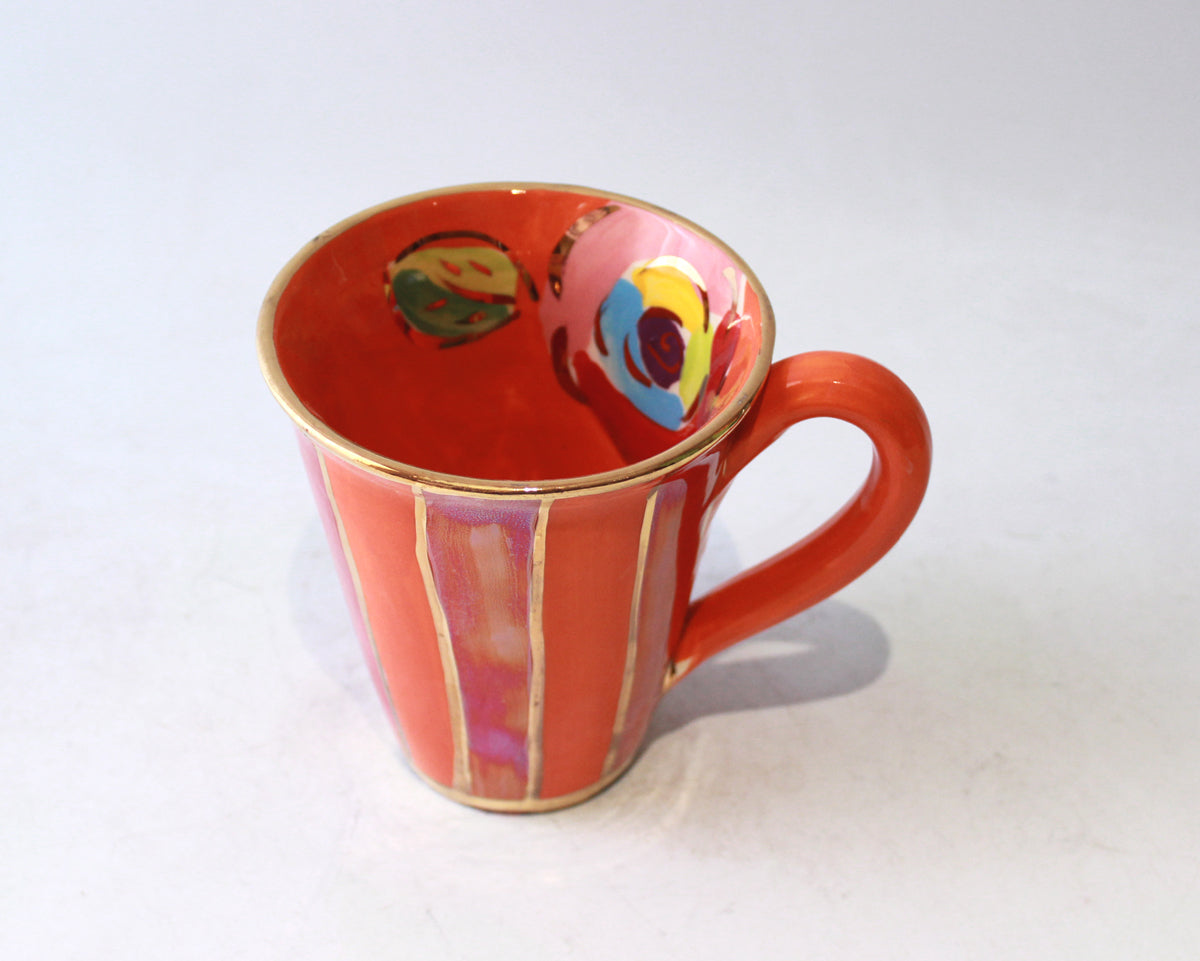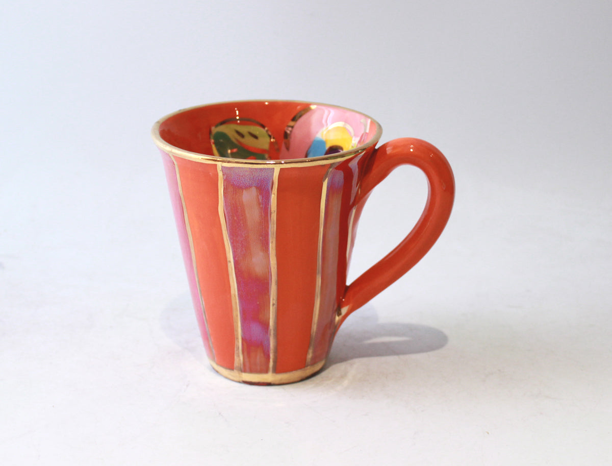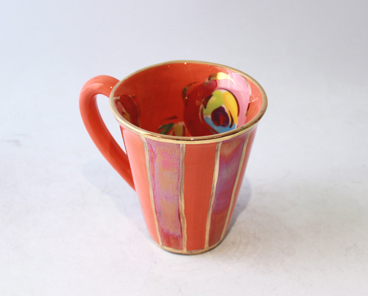 Mary Rose's Tea Mugs stand around 4.25 inches in height and are a great size for a good helping of any beverage...this particular one is painted in the very striking "Orange and Red Stripe" design, where orange stripes interlock with iridescent red ones outside the cup, and "Gold New Rose" design sits on a background of bright orange inside!