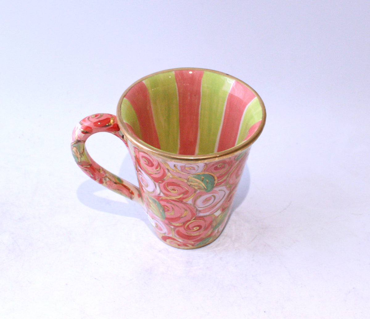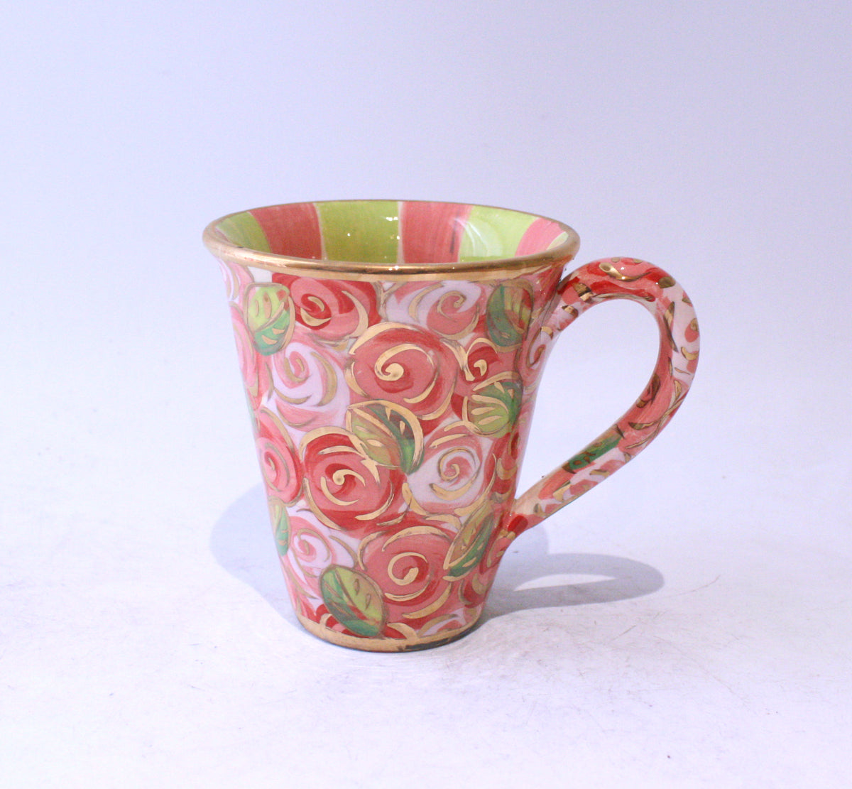 This New Shape Large Mug is painted in a pretty "Pink Rosebush" design on its outer edges, with contrasting green and pink stripes inside...it is completed with 24 carat gold and stands around 4.25 inches tall!