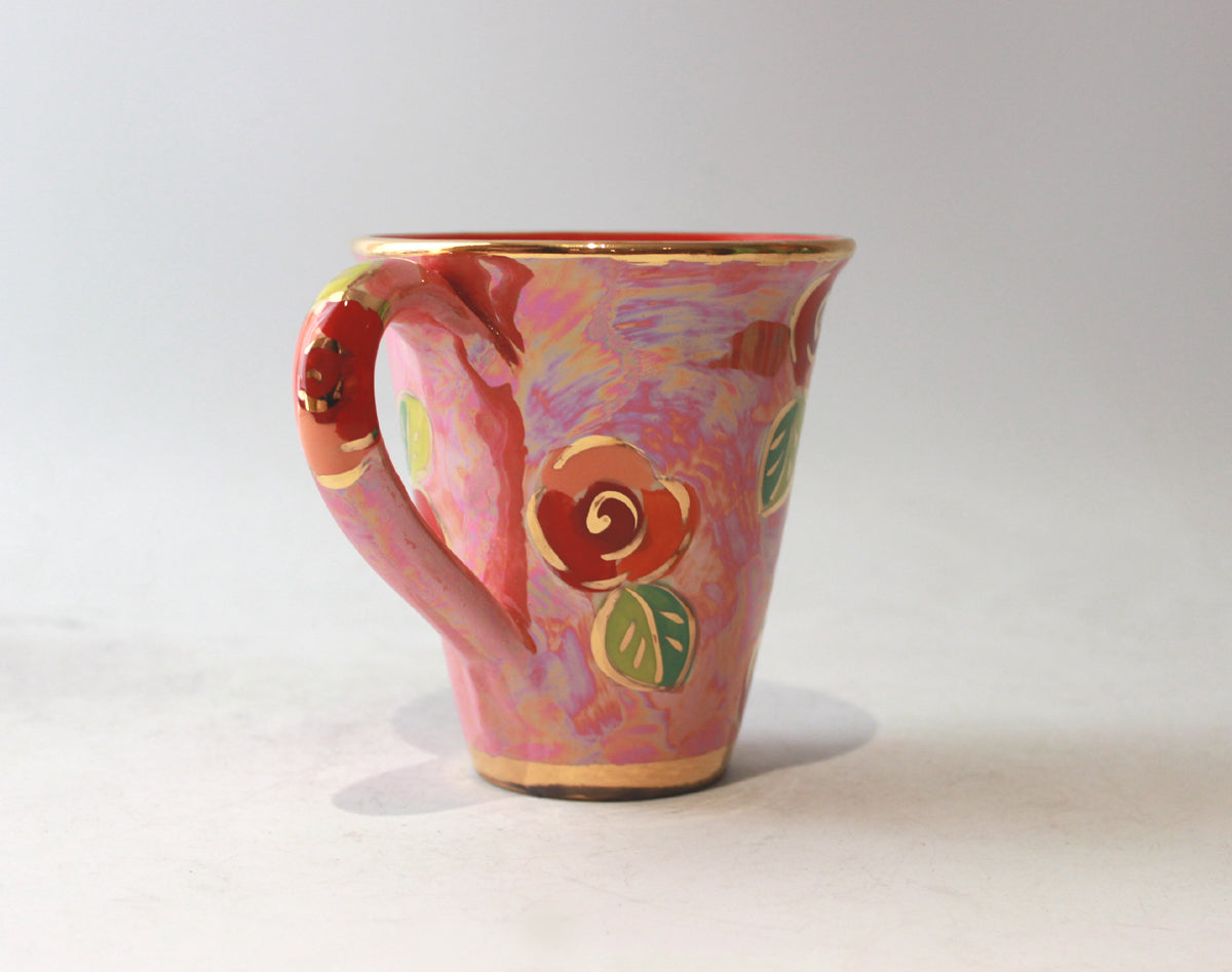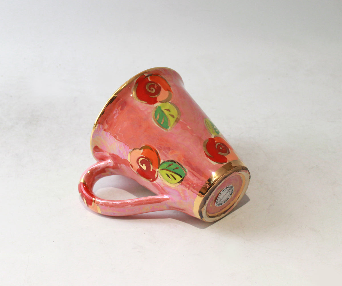 This New Shape Large Mug is sporting an all-new Mary Rose Young design, where individual Rosebuds sit on a pretty in pink mother of pearl background...the inside is a stark contrasting red, and the Mug is completed with accents of 24 carat gold! Mary Rose's Mugs stand around 4.25 inches tall...