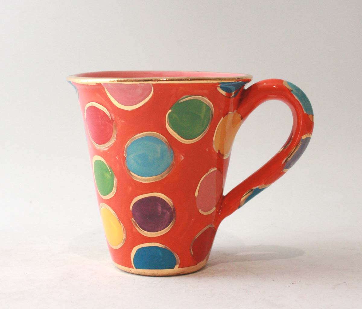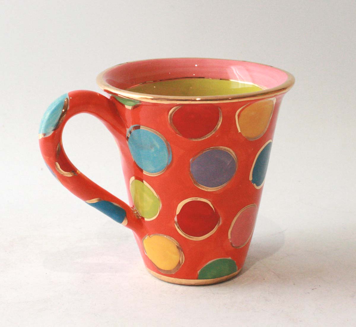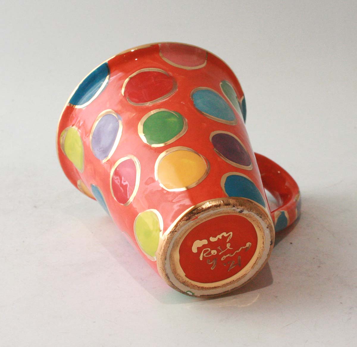 This classic Mary Rose Young Mug has been decorated in "Smartie" design, which here features colourful polka dots on an orange background with a colourful striped inside! It stands 4 inches tall and will certainly brighten up your morning cup of tea...