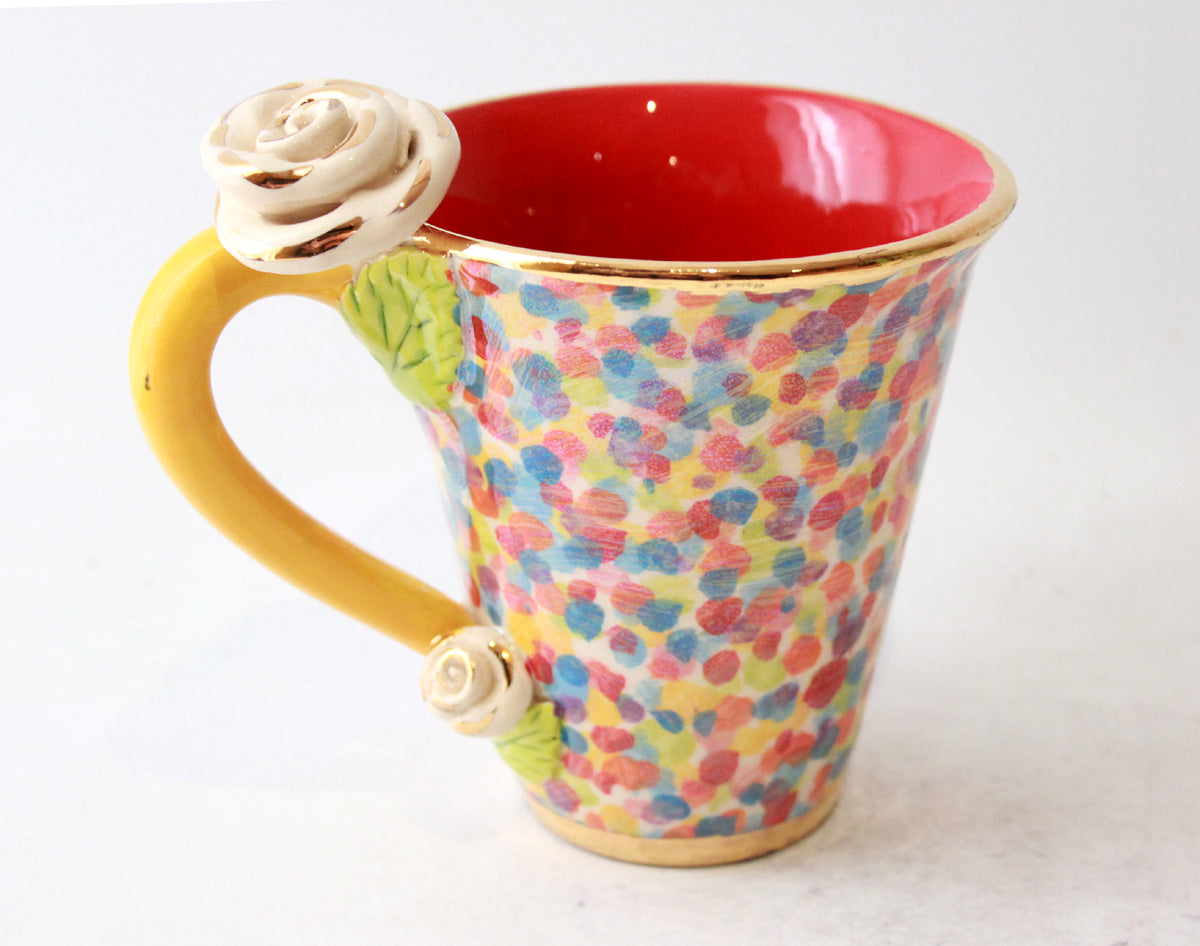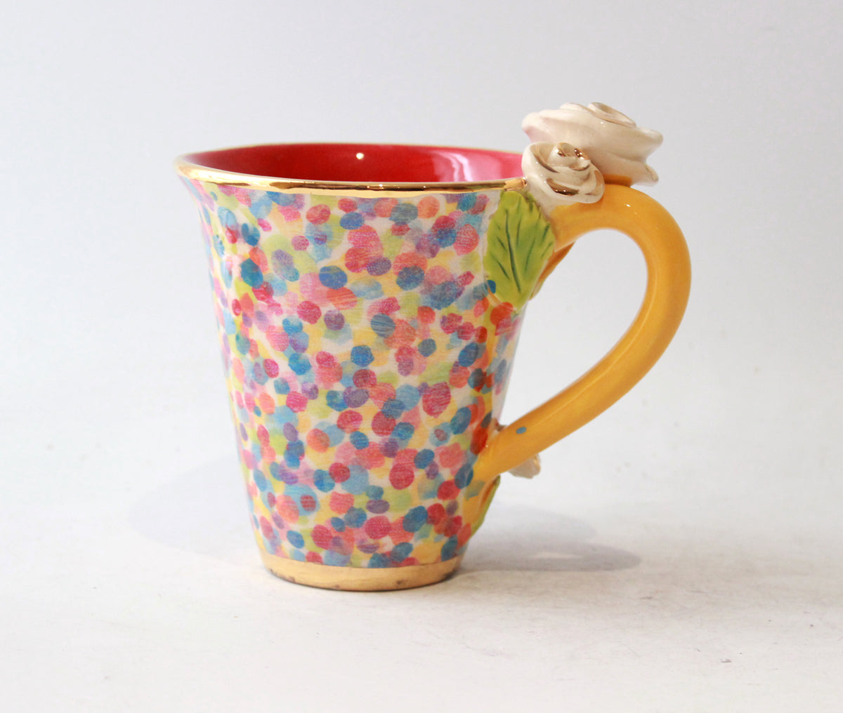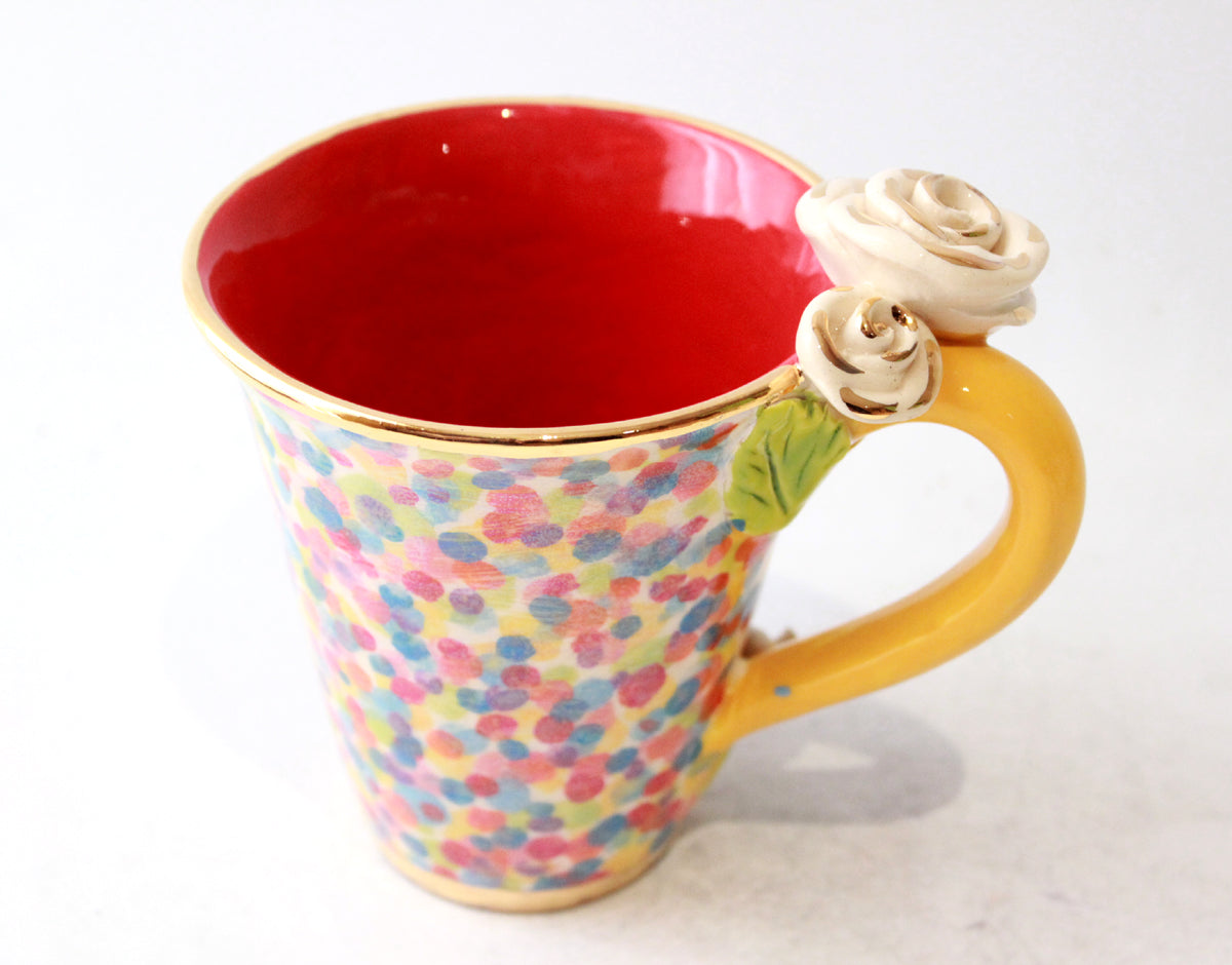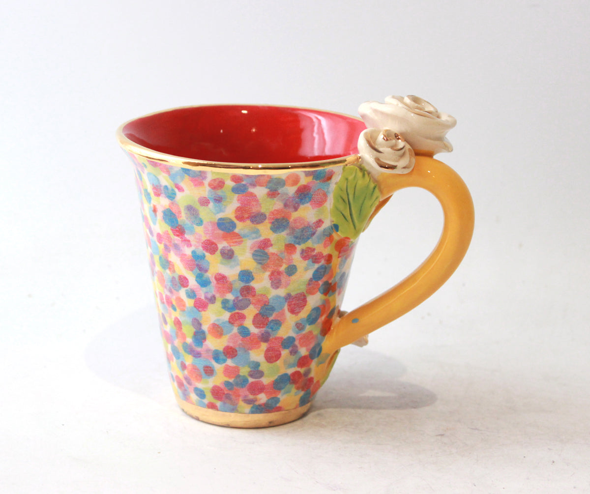 This New Shape Large Mug stands around 5 inches tall and has been decorated in Mary Rose's very festive "Confetti" design, with an eye-catching red inside, a bright yellow handle, and a cluster of white gold roses atop its handle!