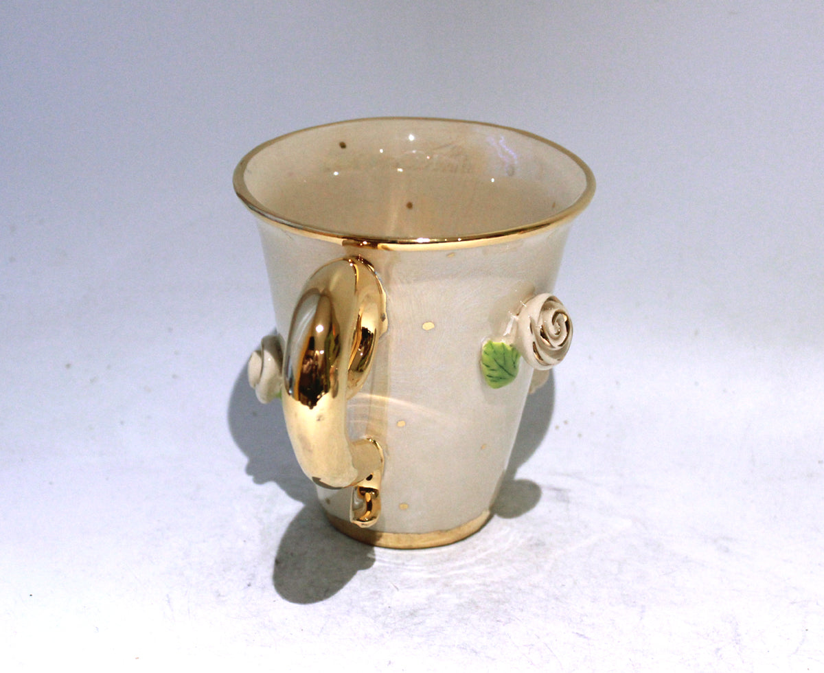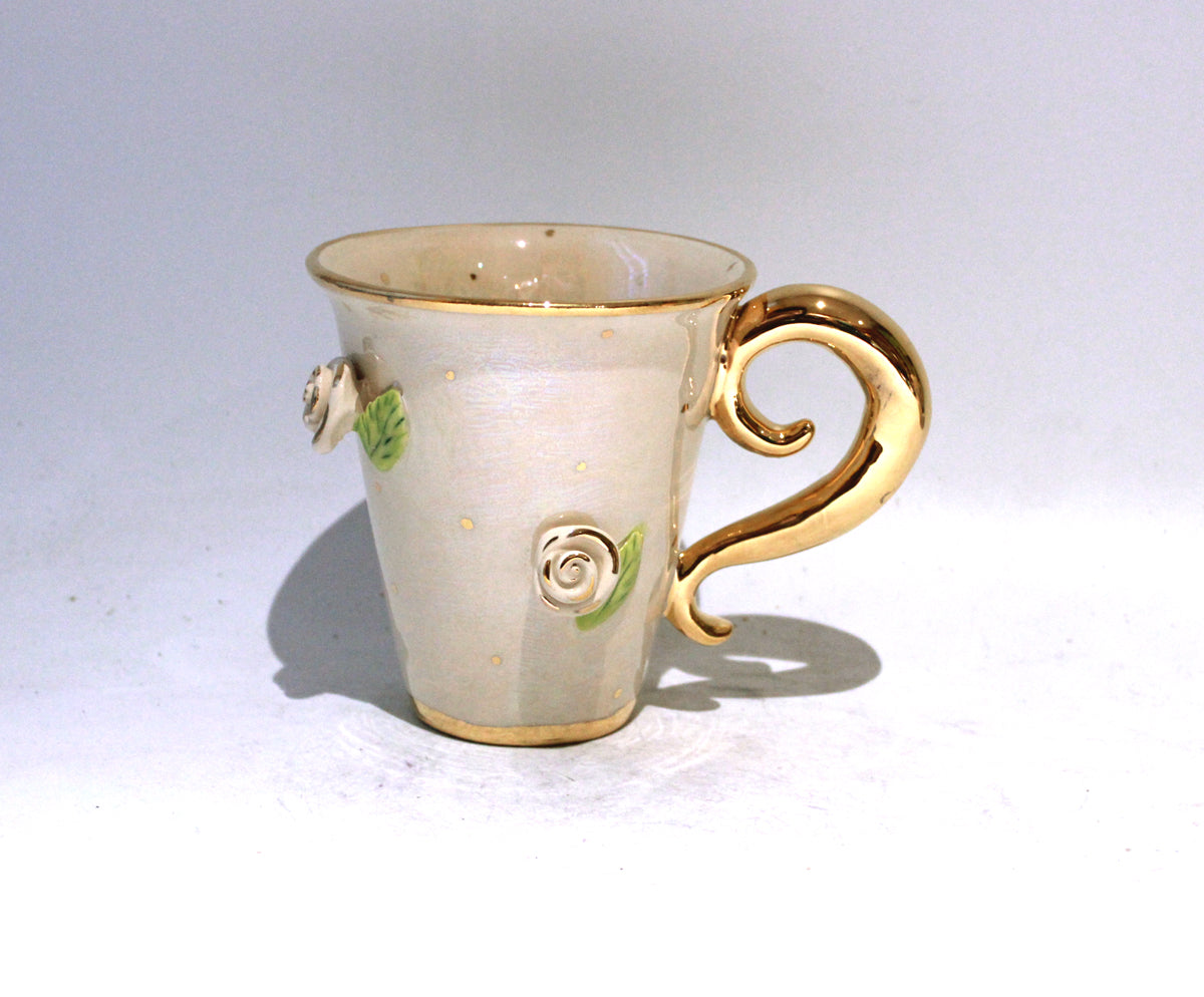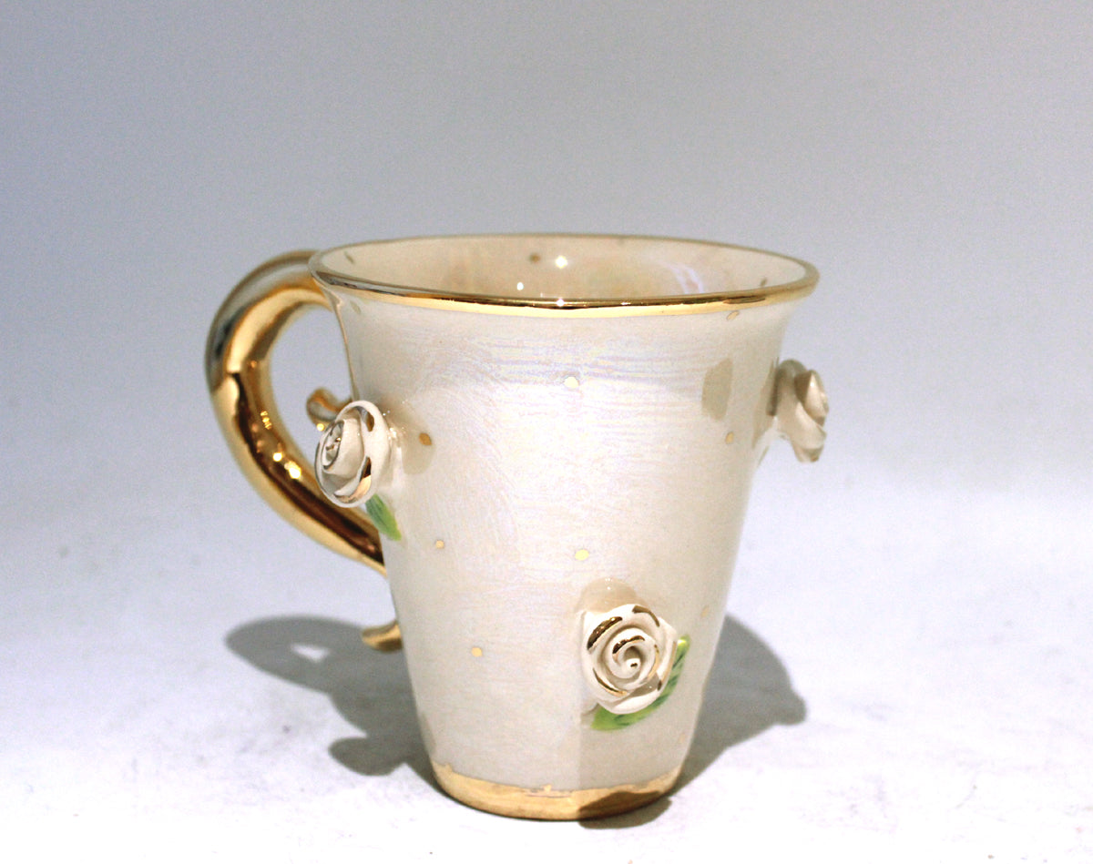 Mary Rose's Tea Mugs are the perfect size for a good helping of any beverage! This one has remained white, with a layer of iridescent Mother of Pearl and intricately painted 24 carat gold dots which give the most beautifully shimmering effect...it features handmade ceramic roses studded across its surface, and also a "Lady Gaga" handle which unsurprisingly has also been lavished in 24 carat gold!