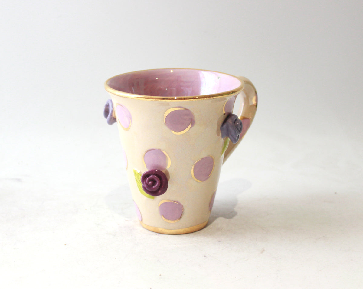 This New Shape Large Mug has been decked out "Mary Rose Young style"... the purple roses stuck onto its outside are decorated in different shades of purple and sit on a background of lilac polka dots! The inside is also painted in lilac with mother of pearl, and the mug stands around 4.75 inches in height