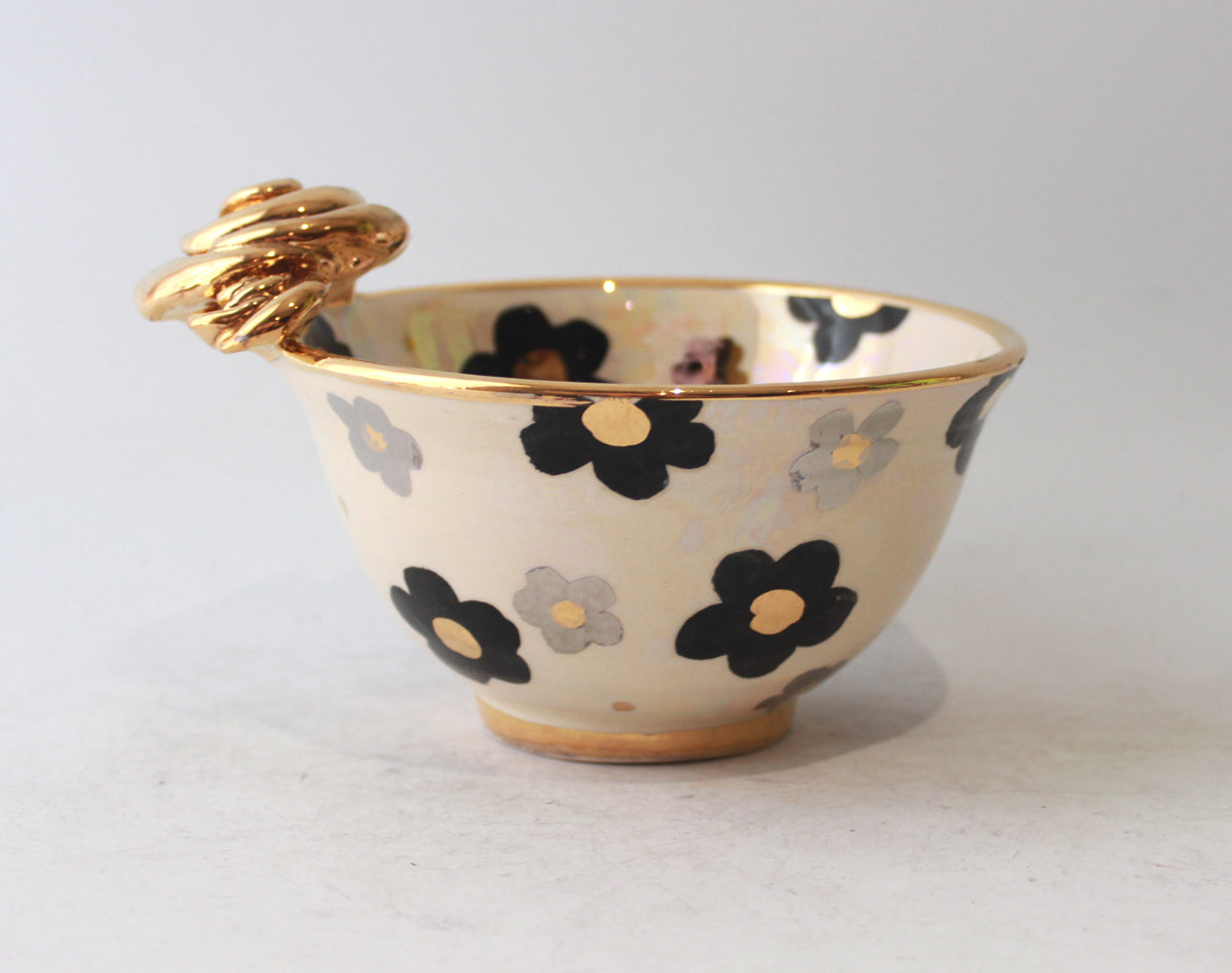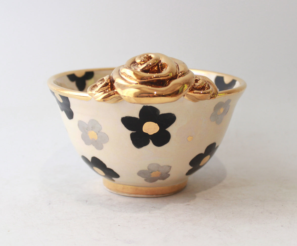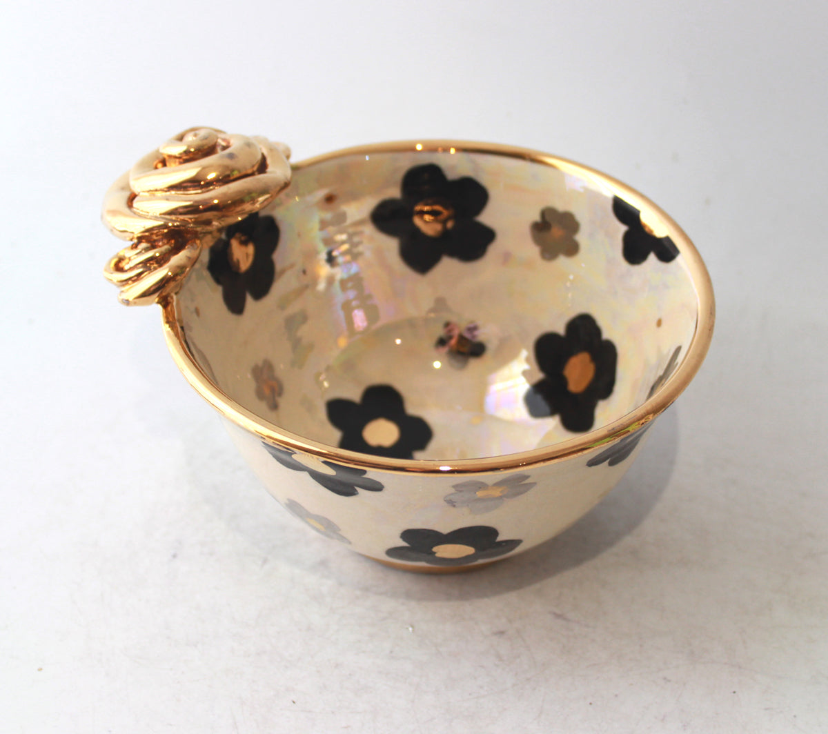 The Noodle Bowl gets its name from the classic steep-sided Japanese bowl, although the three ceramic gold roses planted on its edge certainly indicate a departure from its classic form! This one displays one of Mary Rose's newest designs, "Black and White Daisy", which features Black Daisies on an iridescent Mother of Pearl background with accents of silver and 24 carat gold...
