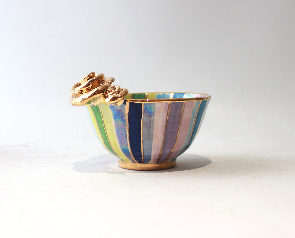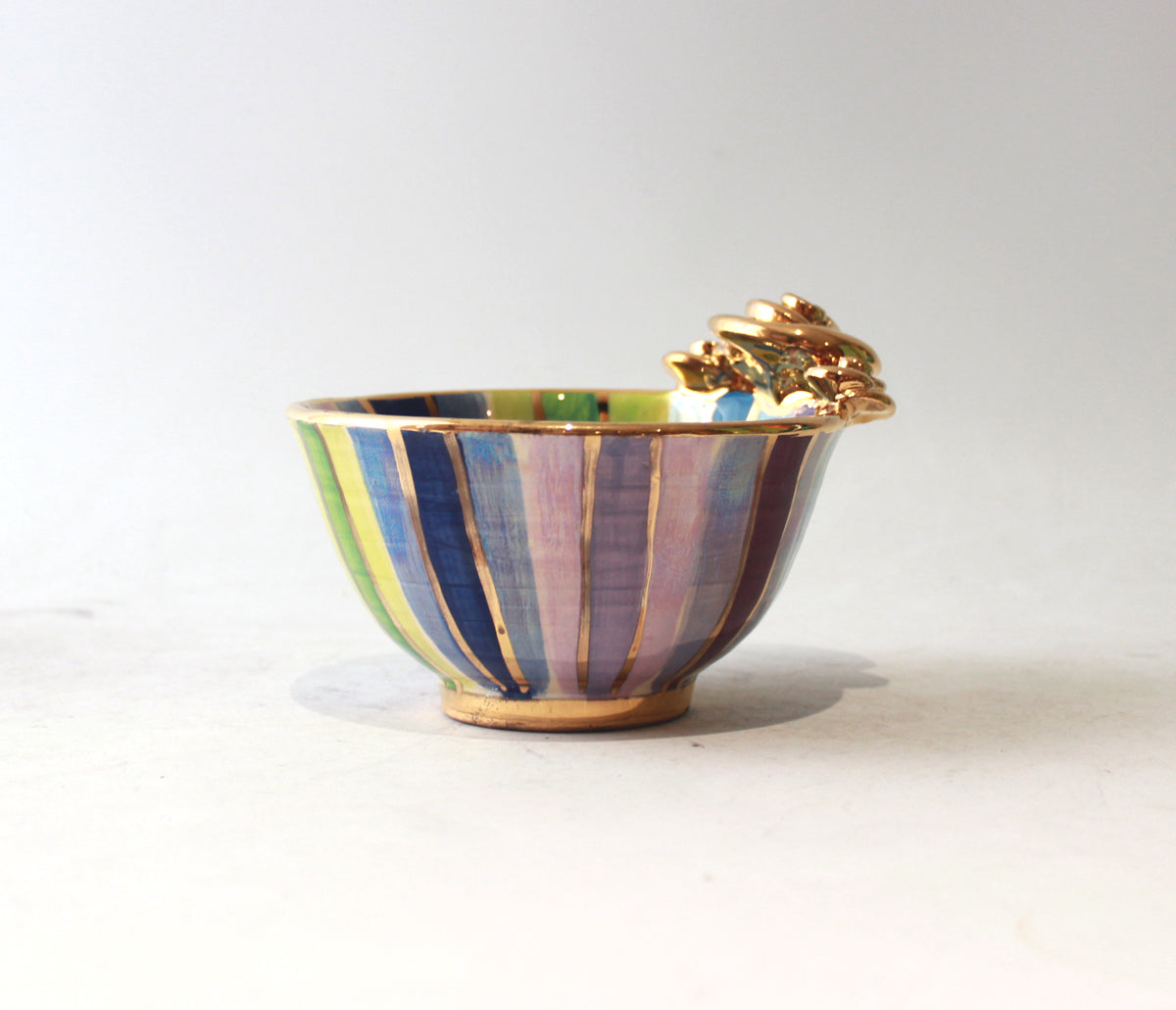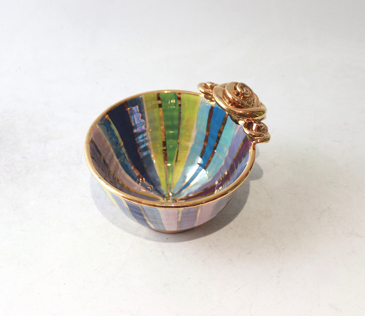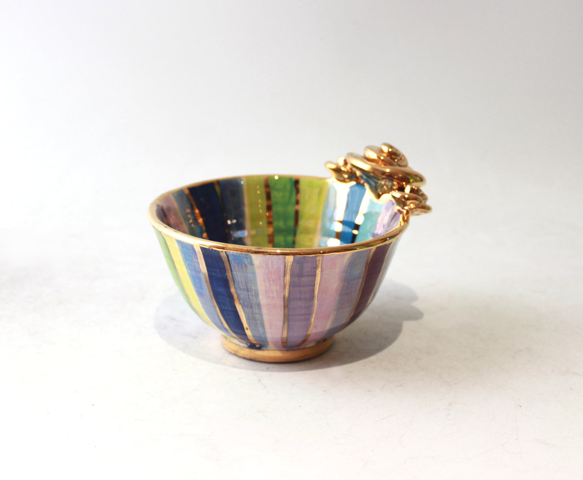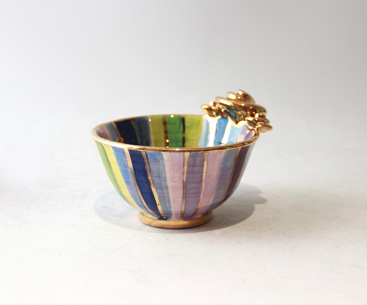 The Noodle Bowl gets its name from the steep-sided Japanese bowl, although the three ceramic gold roses planted on the edge of Mary Rose's versions certainly indicate a departure from the classic form! This one is painted in "Lustred Stripe", with accents of 24 carat gold...