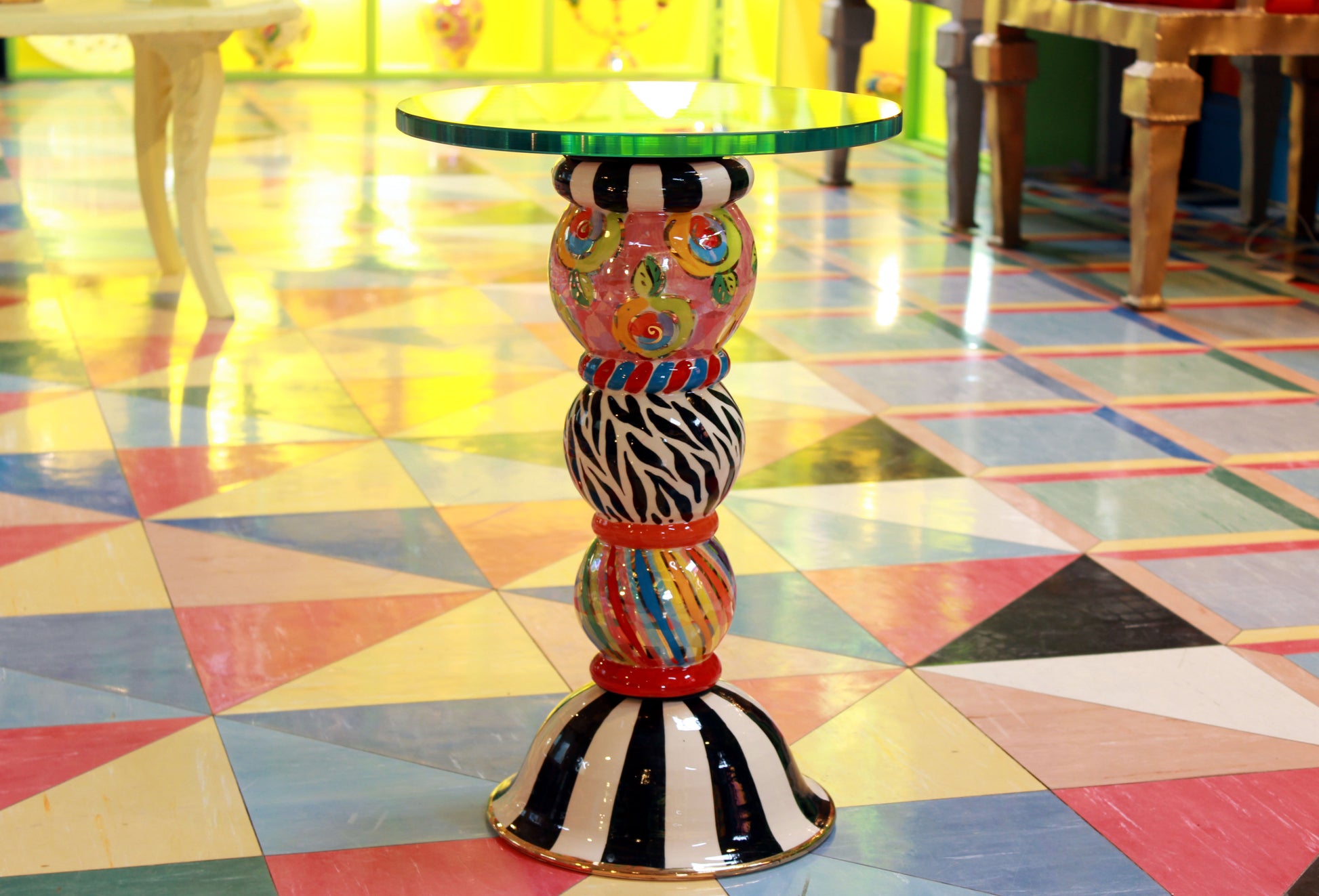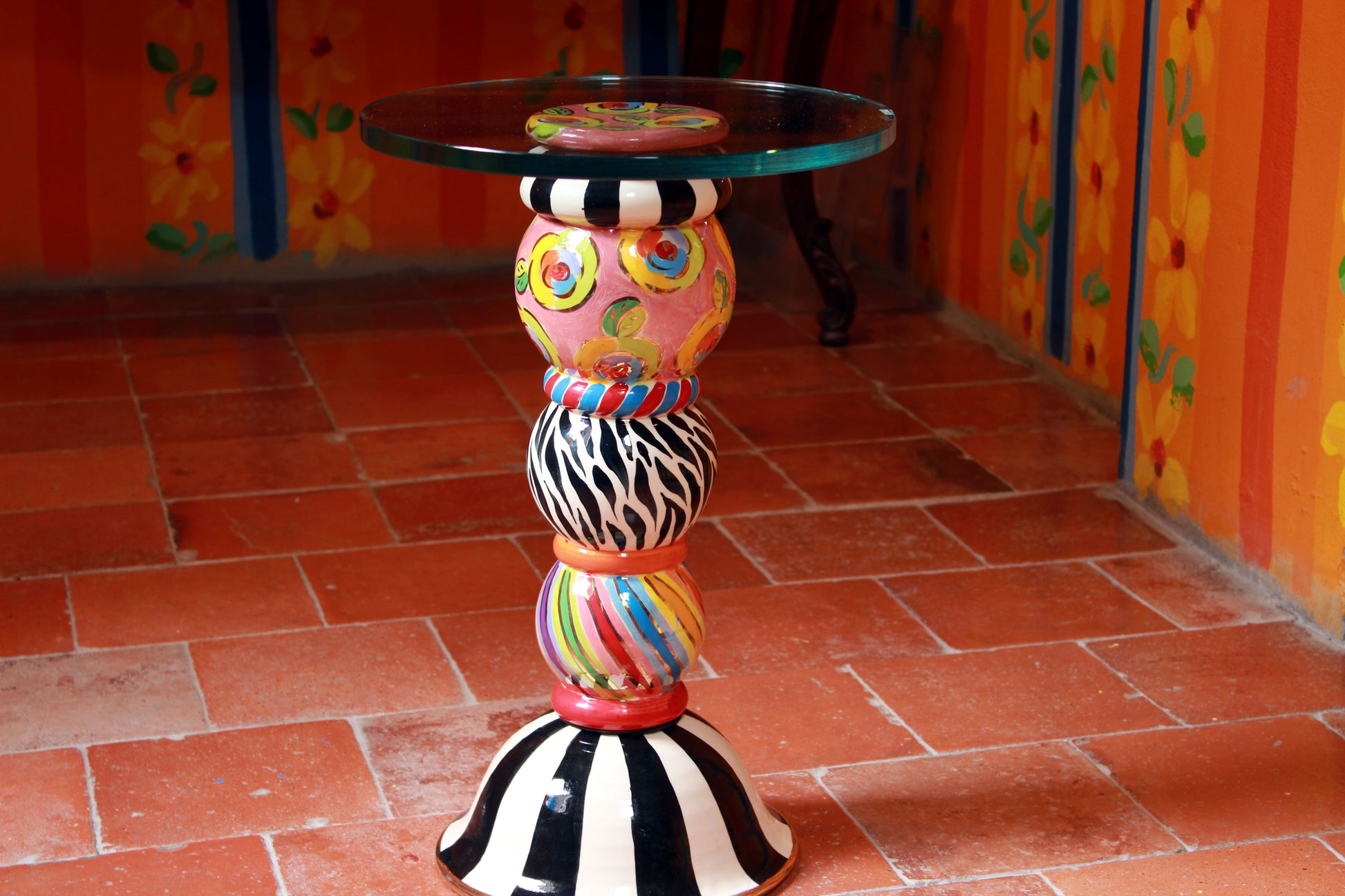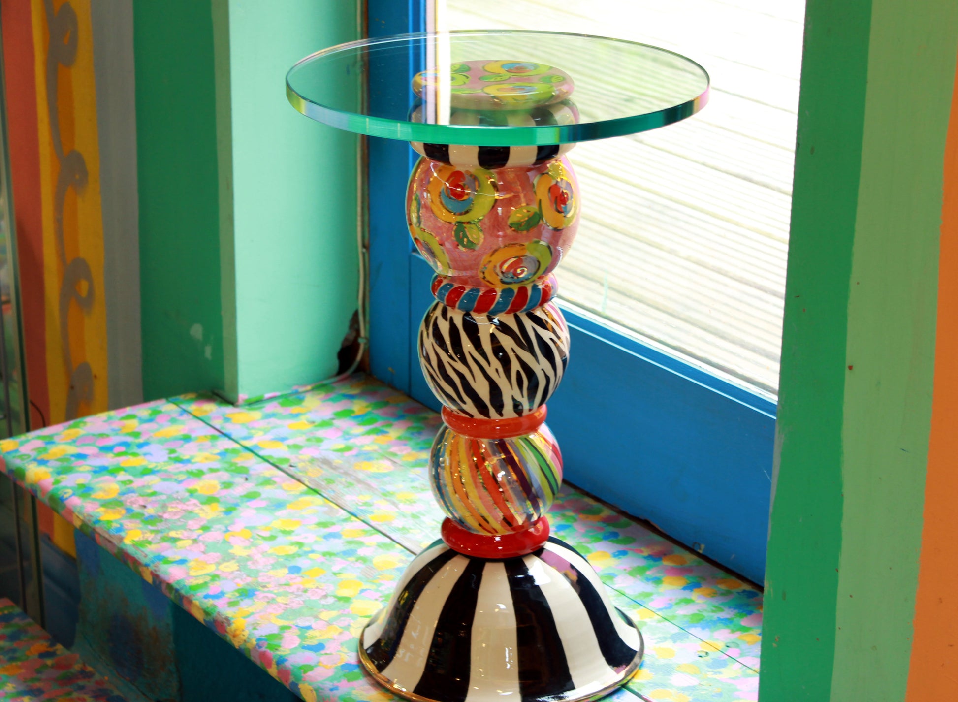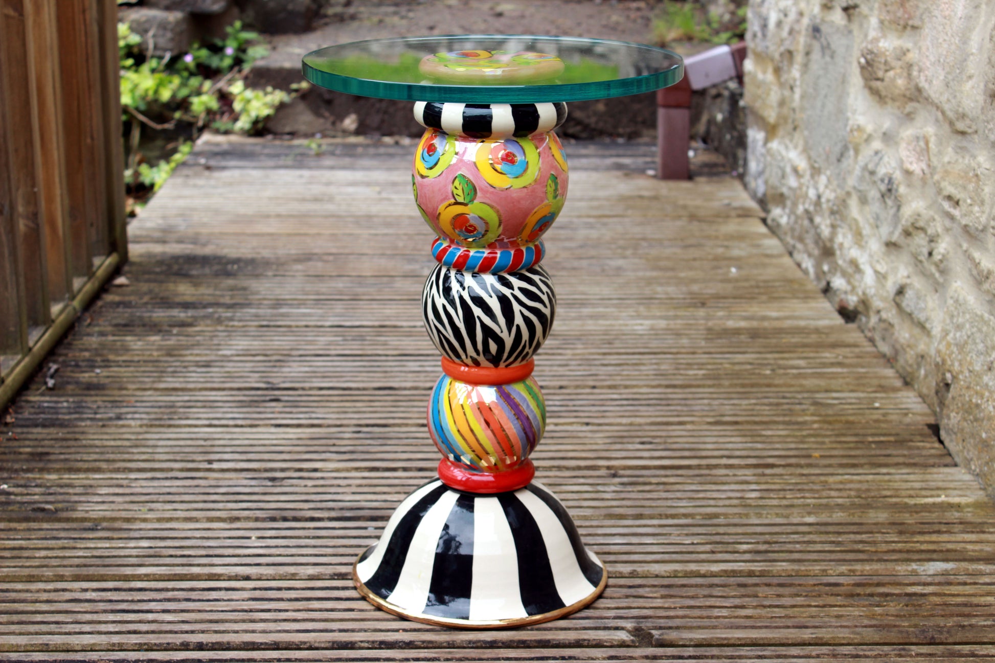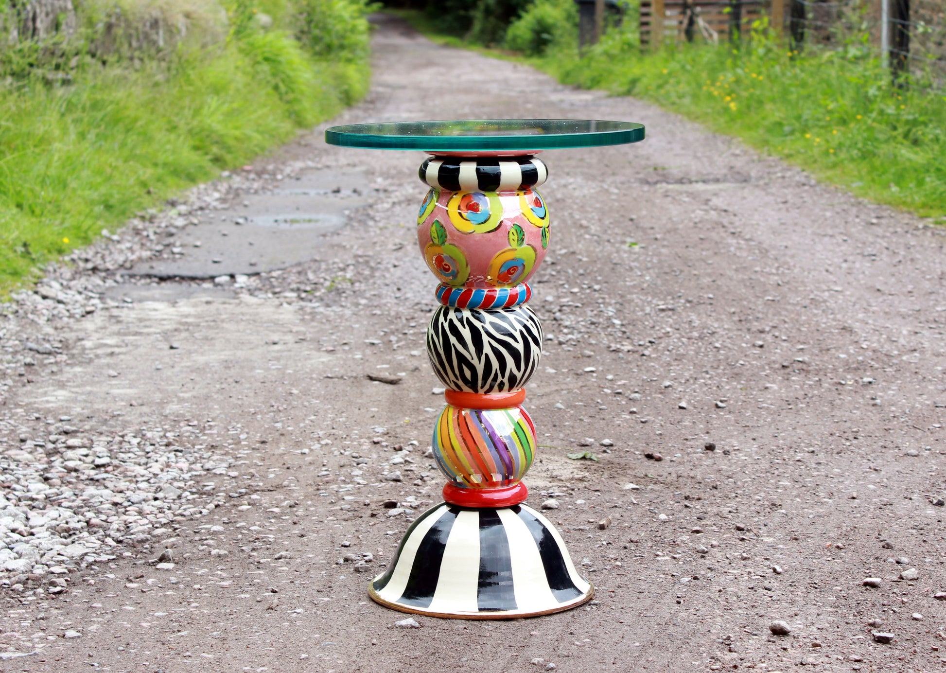 A petite glass topped table which will fit into any room and offer a high degree of noticeability! It has three components, the round base, the leg with its 3 globes and the pink top cover which can be seen through the glass. All pieces bolt together easily with the supplied long bolt cushioned by rubber washers. You can choose whether to order the glass top or whether to source that yourself locally from a glass supplier. If you order it from us you will have to fix it on but all you'll need will also be supplied. The price displayed includes the glass top. The table is 50 inches high. The diameter of the pictured table top is 13 inches....this could be somewhat larger if so required. You can write any instructions you like in the comments when ordering