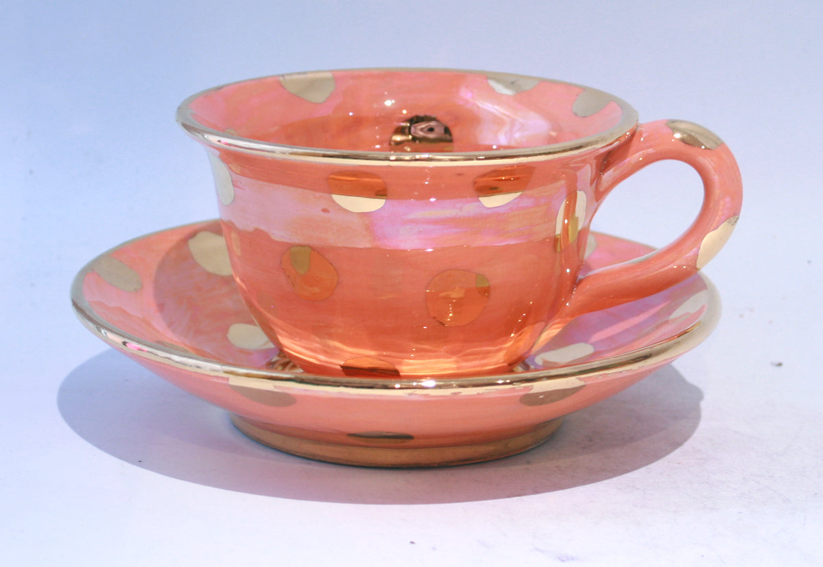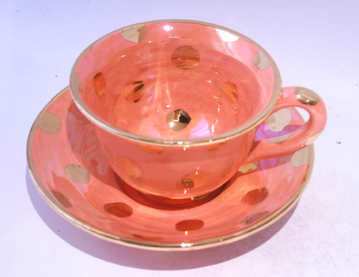 A classic tea time Cup and Saucer...the shape is more or less the same as the ones Mary Rose's grandmother used to make! It measures just over 4 inches in diameter, and is painted in an iridescent orange with gold dots