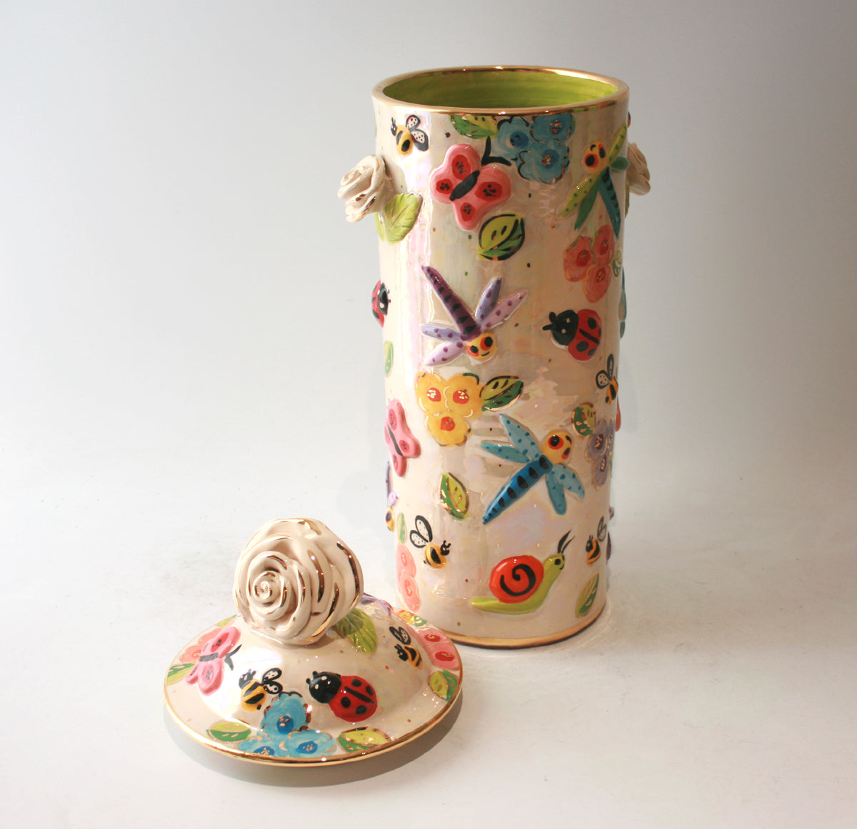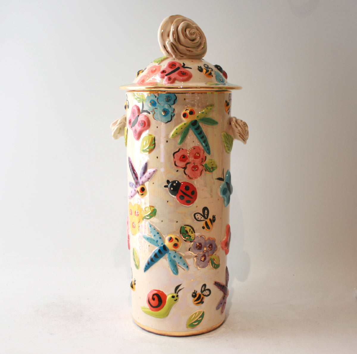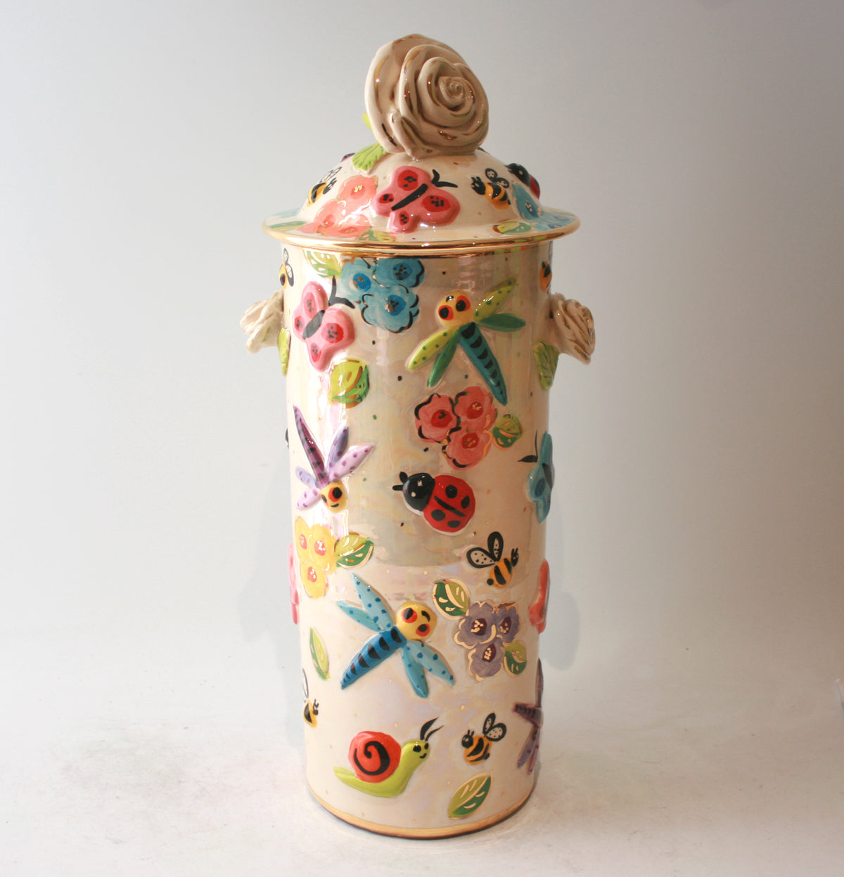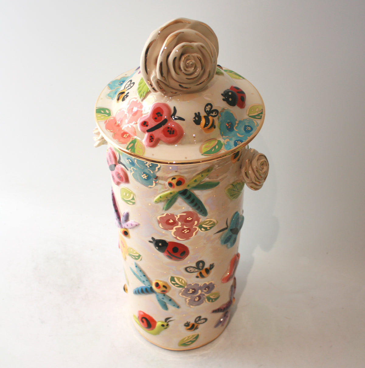 Mary Rose's Pasta Jars stand just under 18 inches tall and come complete with a ceramic lid; which on this one has a white and gold rose as its handle! The design is "Bugs" which crawl around a background of iridescence and coloured blooms and of course there are accents of 24 carat gold throughout the piece...