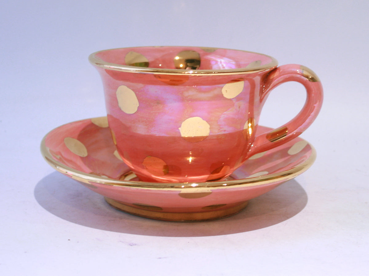 A classic tea-time Cup and Saucer...the shape is more or less the same as the ones Mary Rose's grandmother used to use! It measures just over 4 inches in diameter, and is painted in an iridescent pink with gold dots
