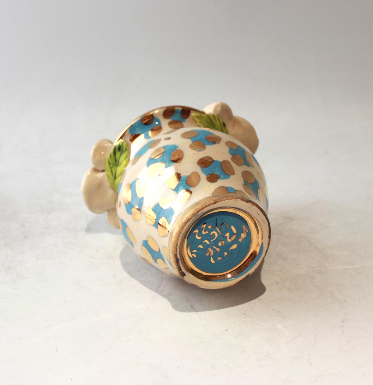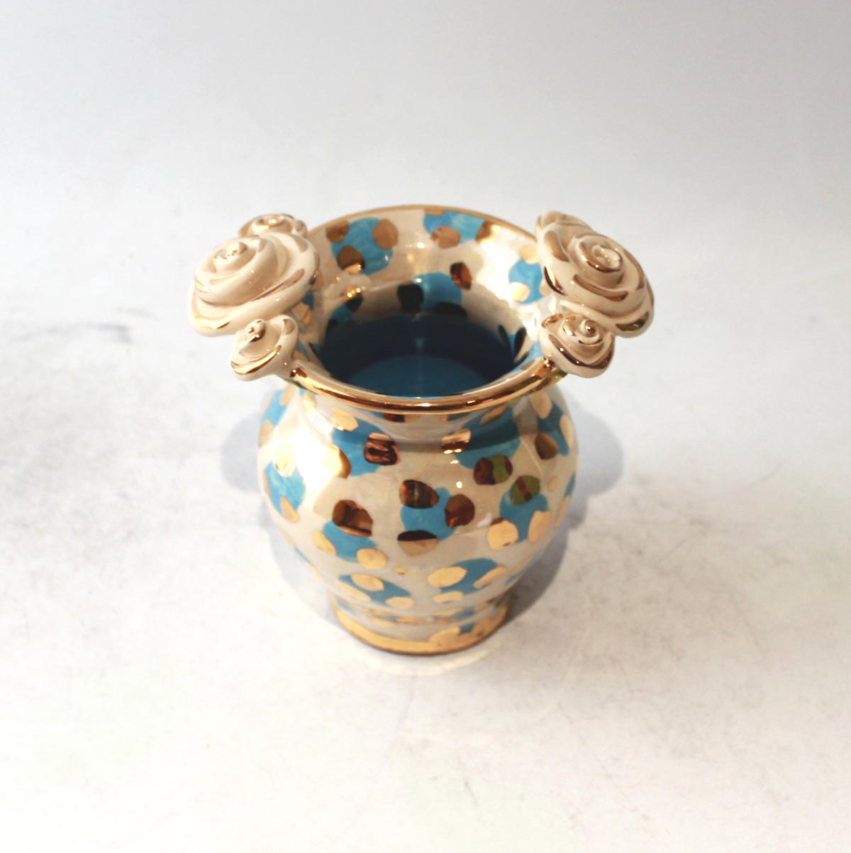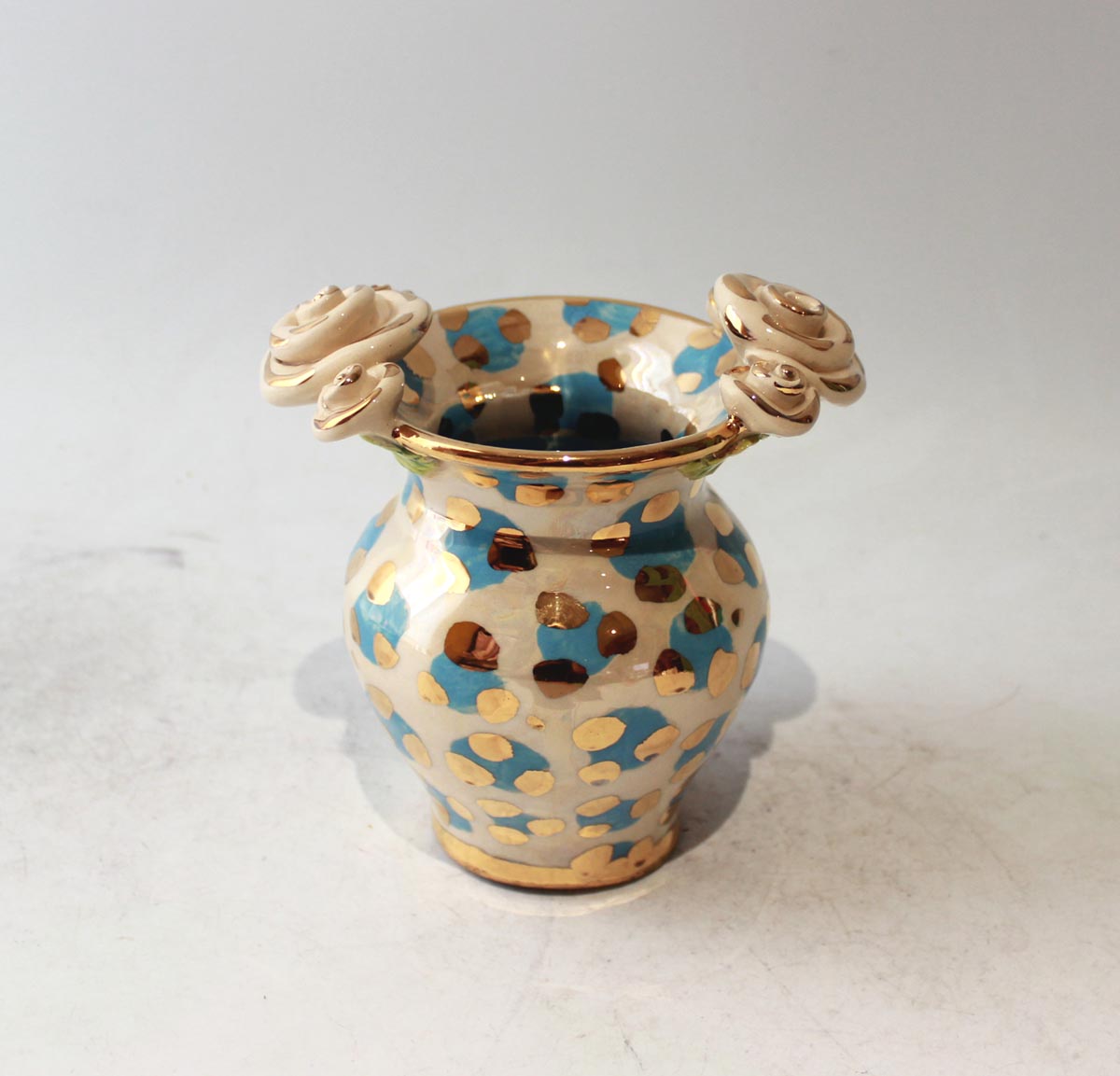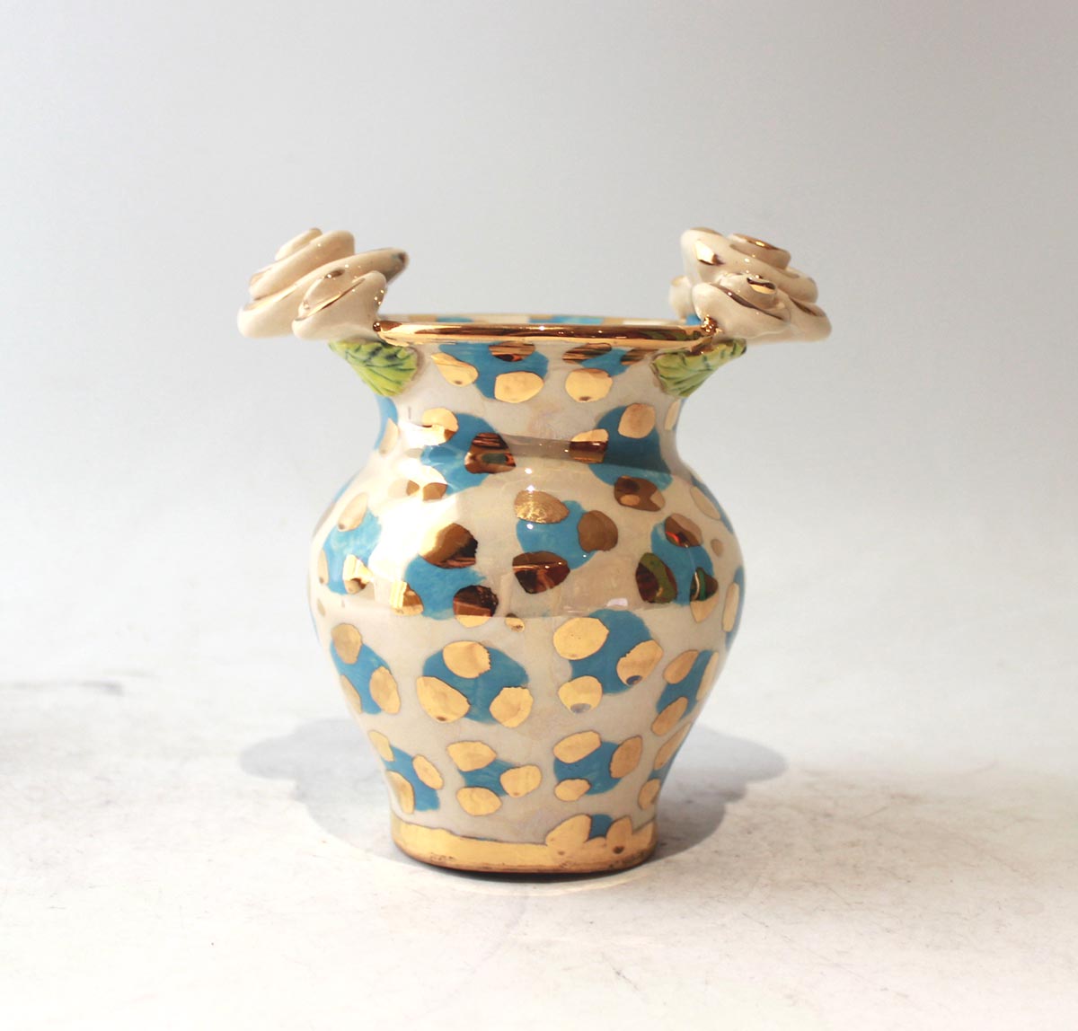 A Posy Vase stands around 5 inches tall and is the smallest member of the Fat Vase family...it features two clusters of ceramic roses on either side of its rim and this particular one is painted in "Blue Leopard" on a mother of pearl background with accents of 24 carat gold!