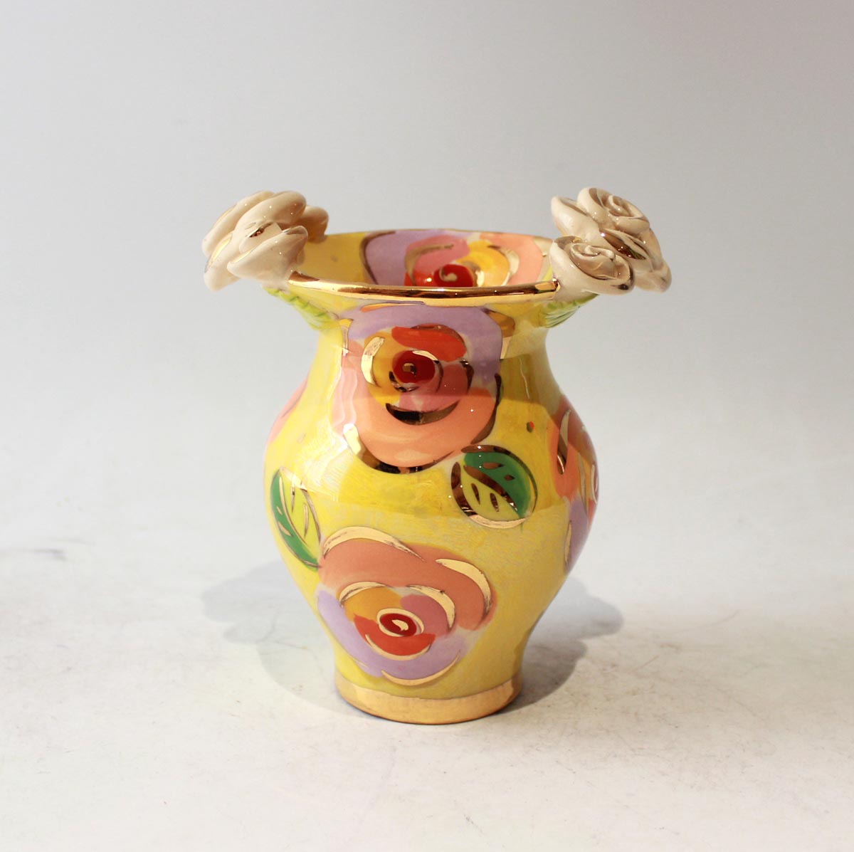 A Posy Vase stands around 5 inches tall and is the smallest member of the Fat Vase family...it features two clusters of ceramic roses on either side of its rim and this particular one is painted in "Gold New Rose" on a bright yellow background!