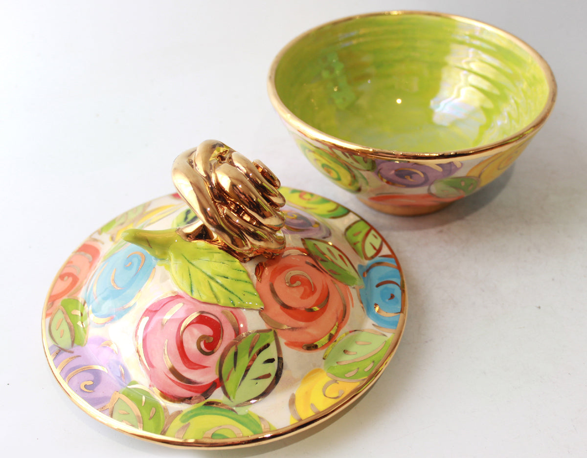 A Powder Box made by Mary Rose is a lidded piece which you'd most likely find on a dressing table...however, it will draw attention to itself wherever you choose to put it! It is painted in "Pastel Block Rose" on an iridescent background with a ceramic 24 carat gold rose atop its lid...
