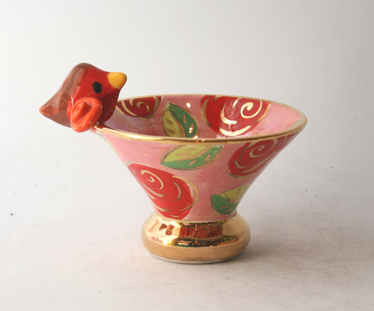Mary Rose's Candy Dishes stand around 2.5 inches high and can be the perfect receptacle for whatever you choose! This one is painted in "Rose Red" and features a little Robin on the side of its rim...