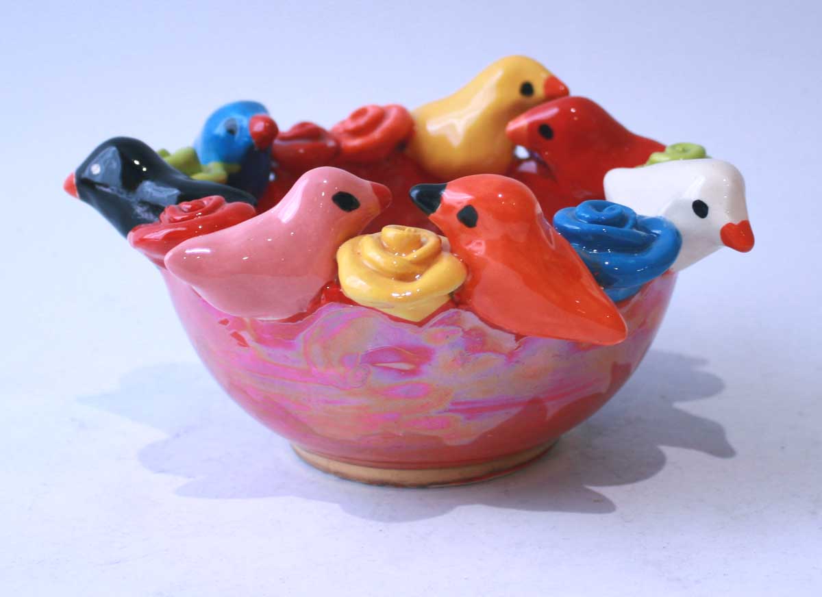 This 4 inch bowl features several little ceramic Robins that have been stuck on its rim, we think they look as if they are having some sort of private conversation to which we can only observe...the bowl is painted in Shimmering Red and will definitely steal the show!