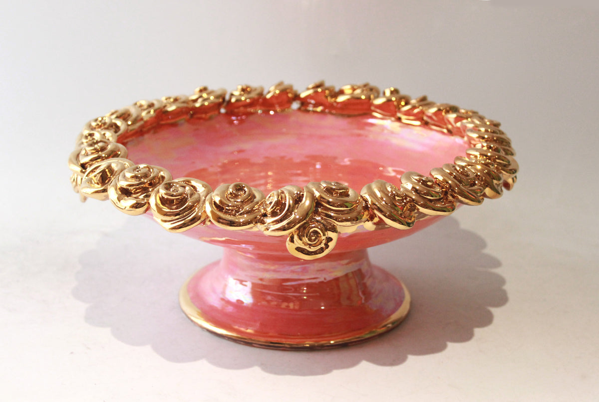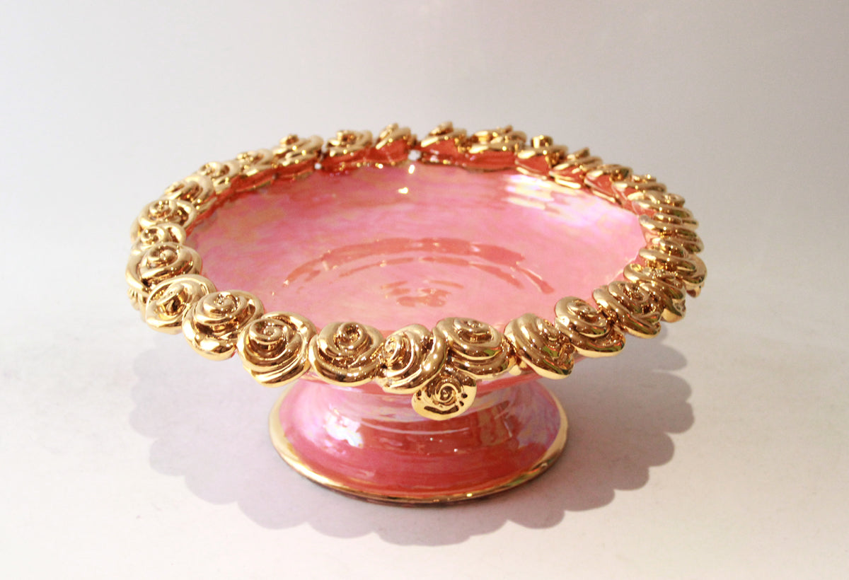 This Rose Encrusted Cakestand is painted in the prettiest pink, which shimmers so beautifully due to the intricately painted layer of Mother of Pearl resting upon it...its rim is adorned with ceramic gold roses, all handmade by Mary Rose, giving a magical effect! It stands around 11 inches in diameter