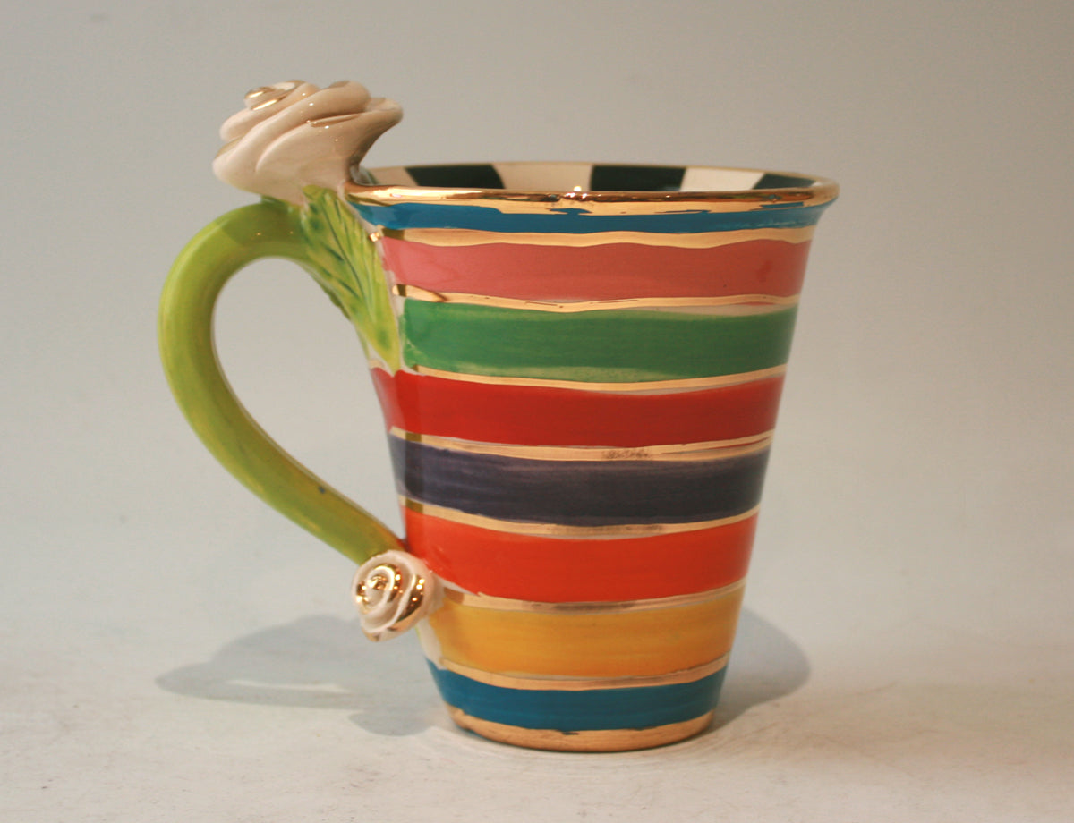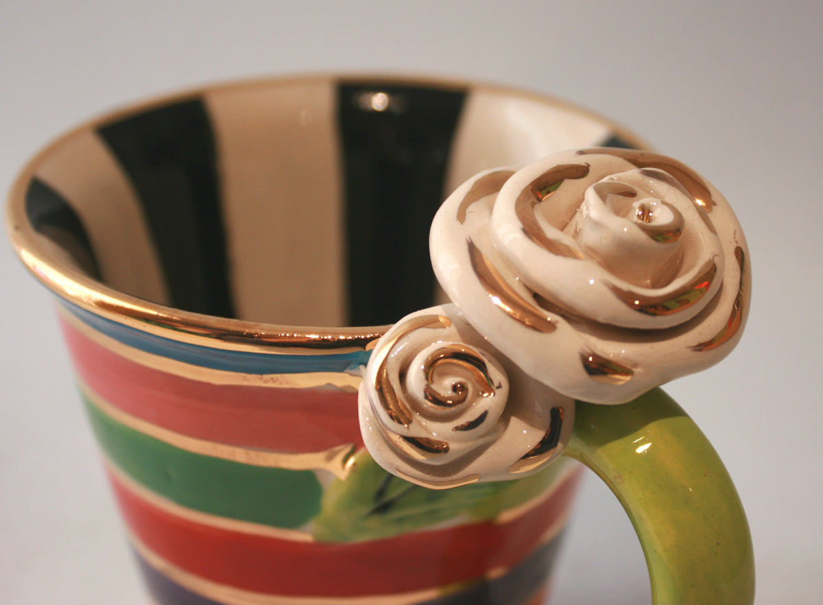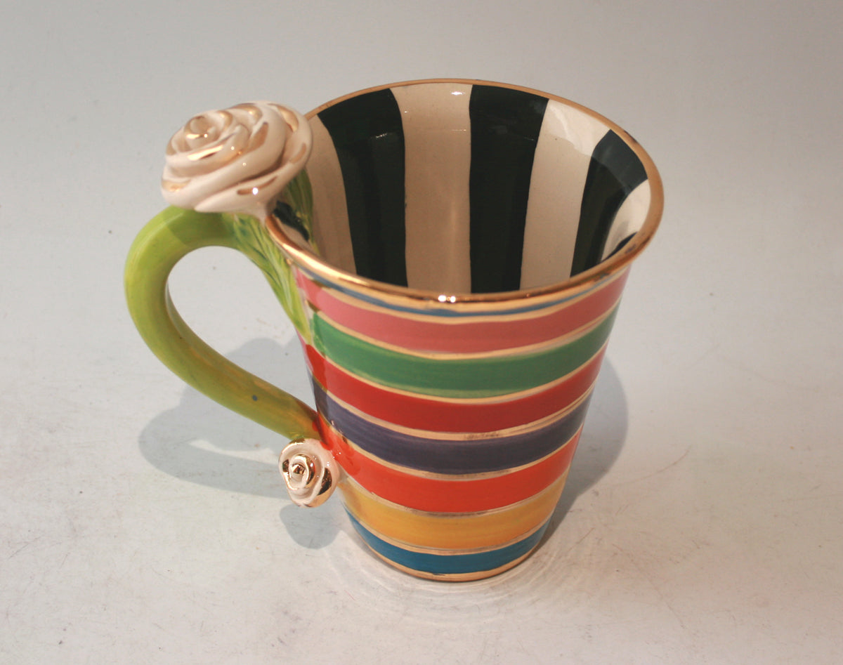 Mary Rose's Rose Handled Mugs stand around 5 inches in height, and this one is painted in "Banded Stripes"; colourful rings of colour separated by 24 carat gold with a little ceramic rose atop its handle just for good measure!