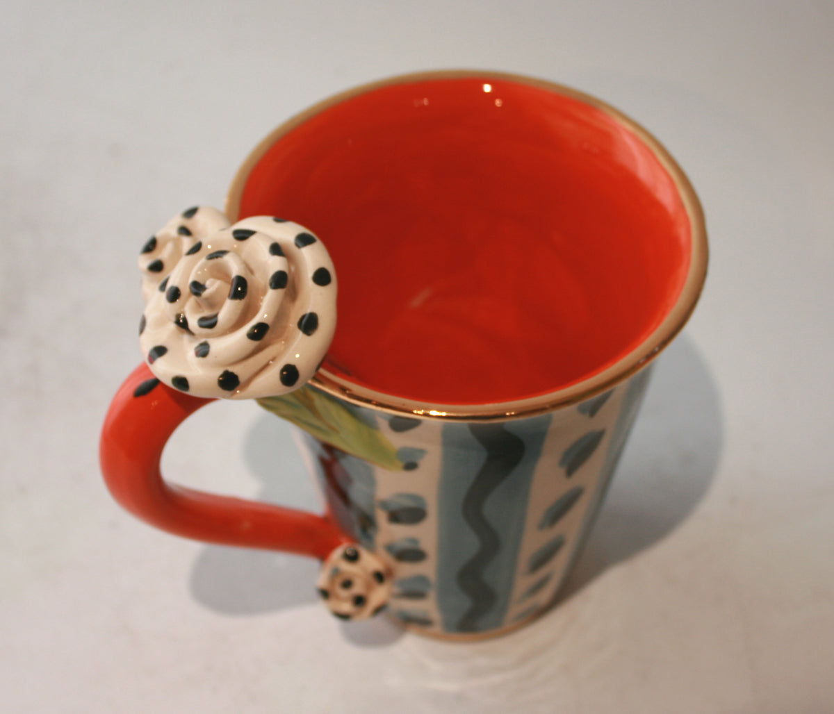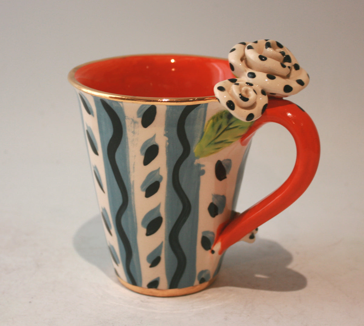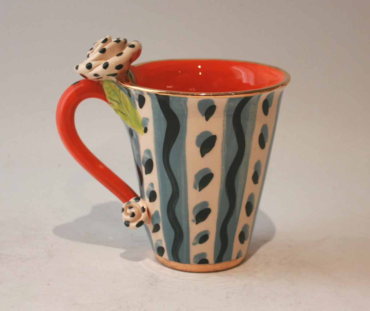 A beautiful example of one of Mary Rose's Rose Handled Mugs...this one is painted in "Black and White Pastel Stripes", with the rose atop the handle looking slightly different in polka dots! The inside is bright orange to match its handle and the entire mug stands around 5 inches tall...