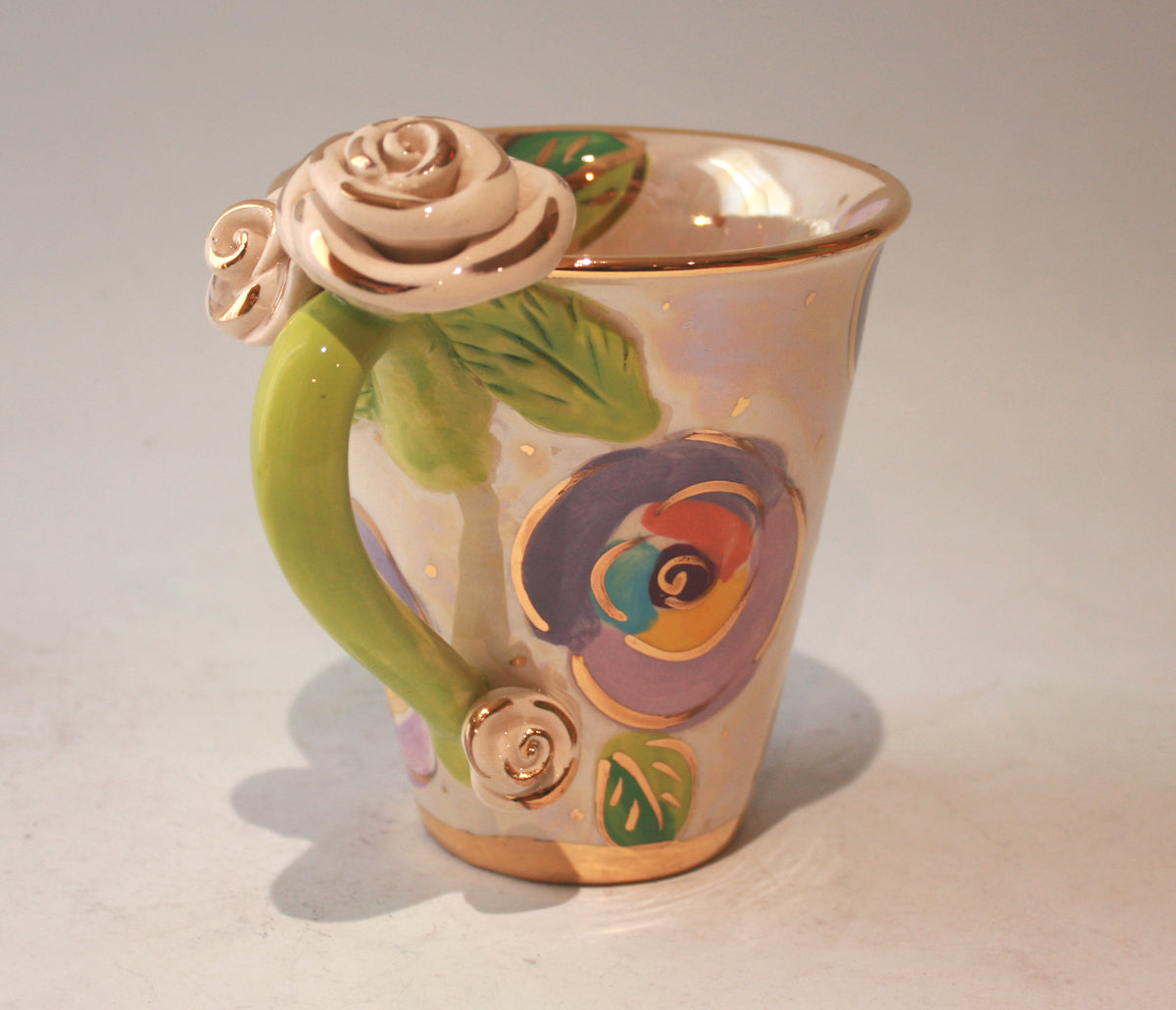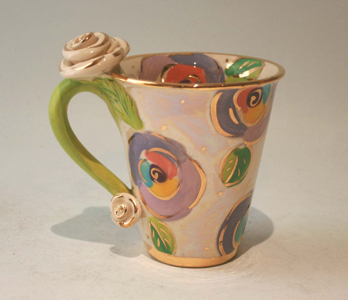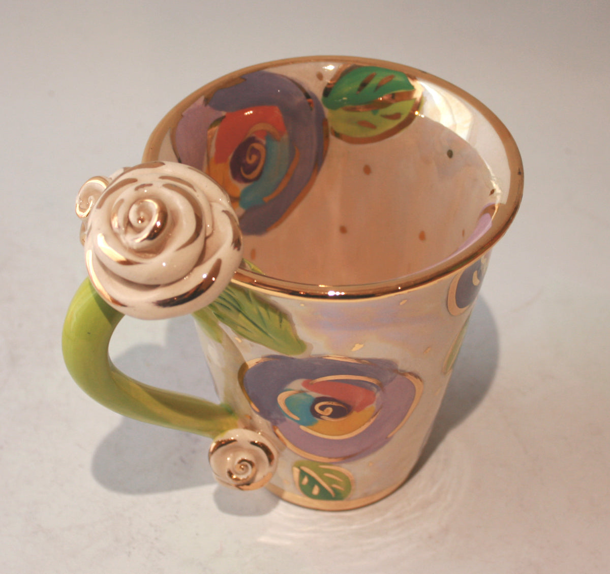 Mary Rose's New Shape Large Mug stand around 5 inches tall, and this particular one is painted in "Gold New Rose" on a background of iridescent white and gold polka dots, with a majestic white gold rose atop its green handle...