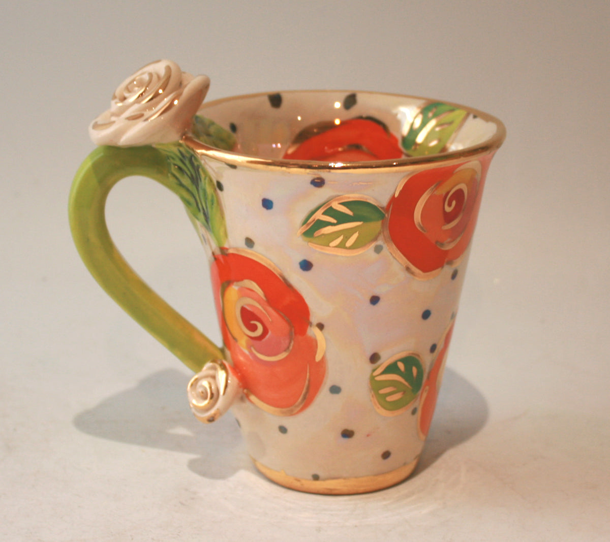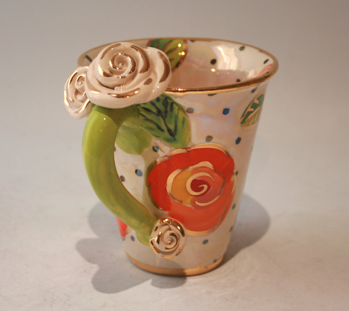 Mary Rose's Rose Handled Mugs stand around 5 inches tall, and this one is painted in "Orange Gold New Rose" on a background of polka dots on iridescence, with accents of 24 carat gold and green leaves that match its green handle...a classic Mary Rose Young mug that will certainly add some glamour to your morning coffee!