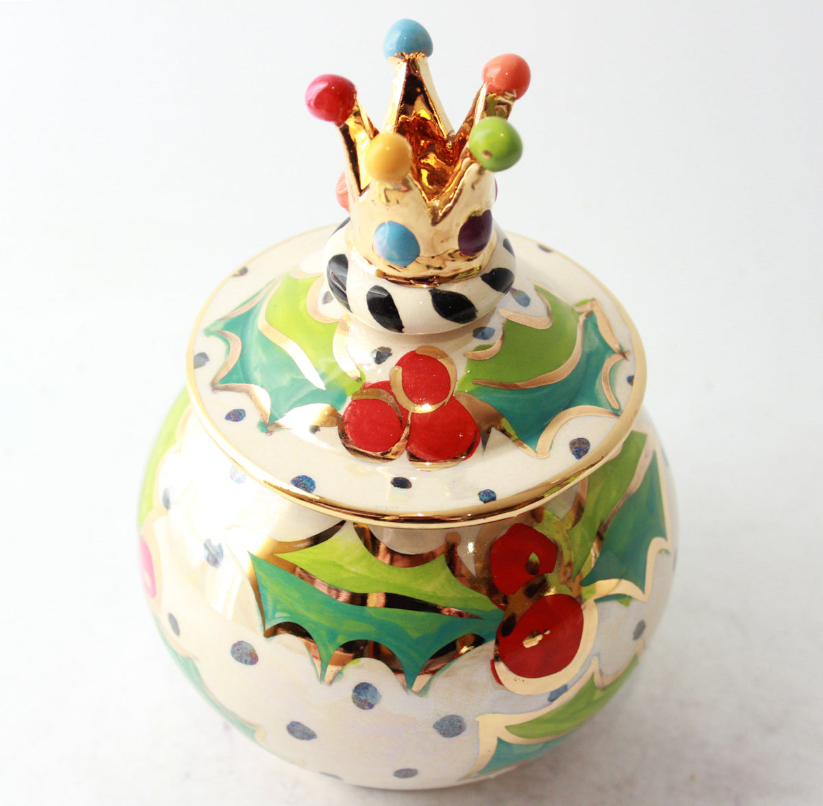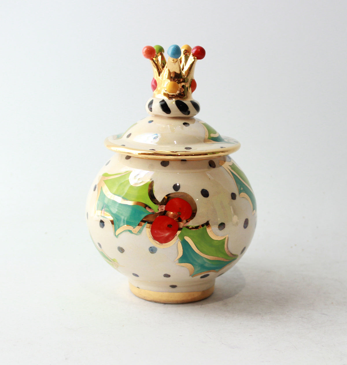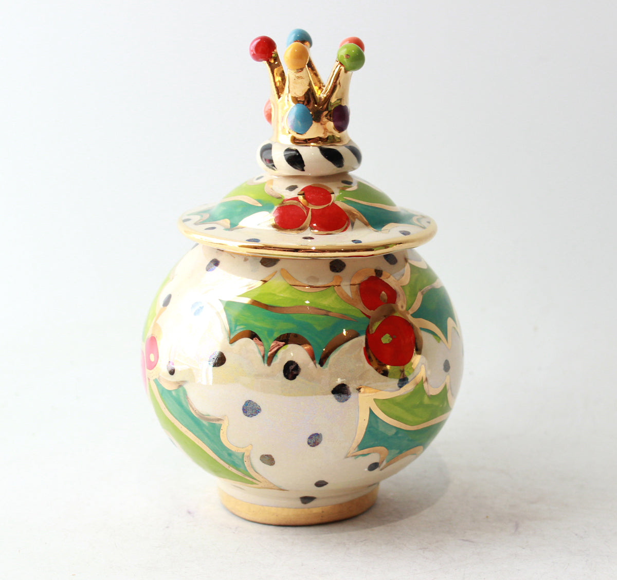 Standing just over 6 inches tall, this wonderfully pot-bellied Tea Caddy would be the perfect receptacle for anything you choose! It is adorned with a ceramic gold crown atop its lid, and painted in "Holly", where the famously festive flora sit on a background of polka dots on iridescence, lovingly accented with 24 carat gold...