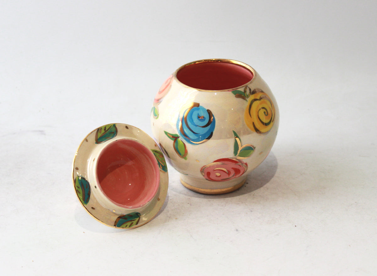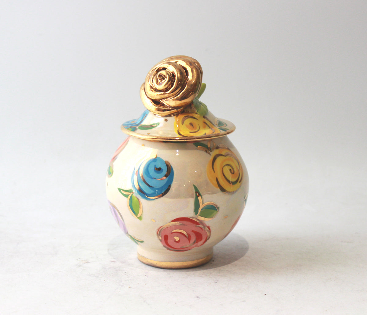 Standing just under 6 inches tall, this Rose Lidded Tea Caddy is wonderfully pot-bellied and painted in "Rosebud" design; where colourful roses are scattered across an iridescent Mother of Pearl background and flecked with accents of 24 carat gold...