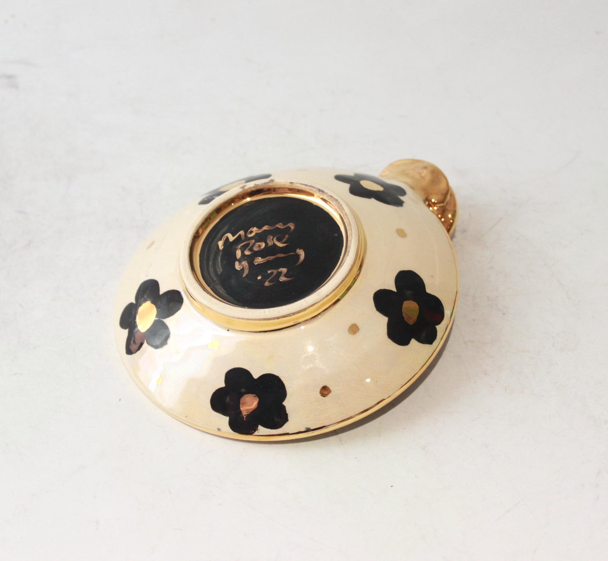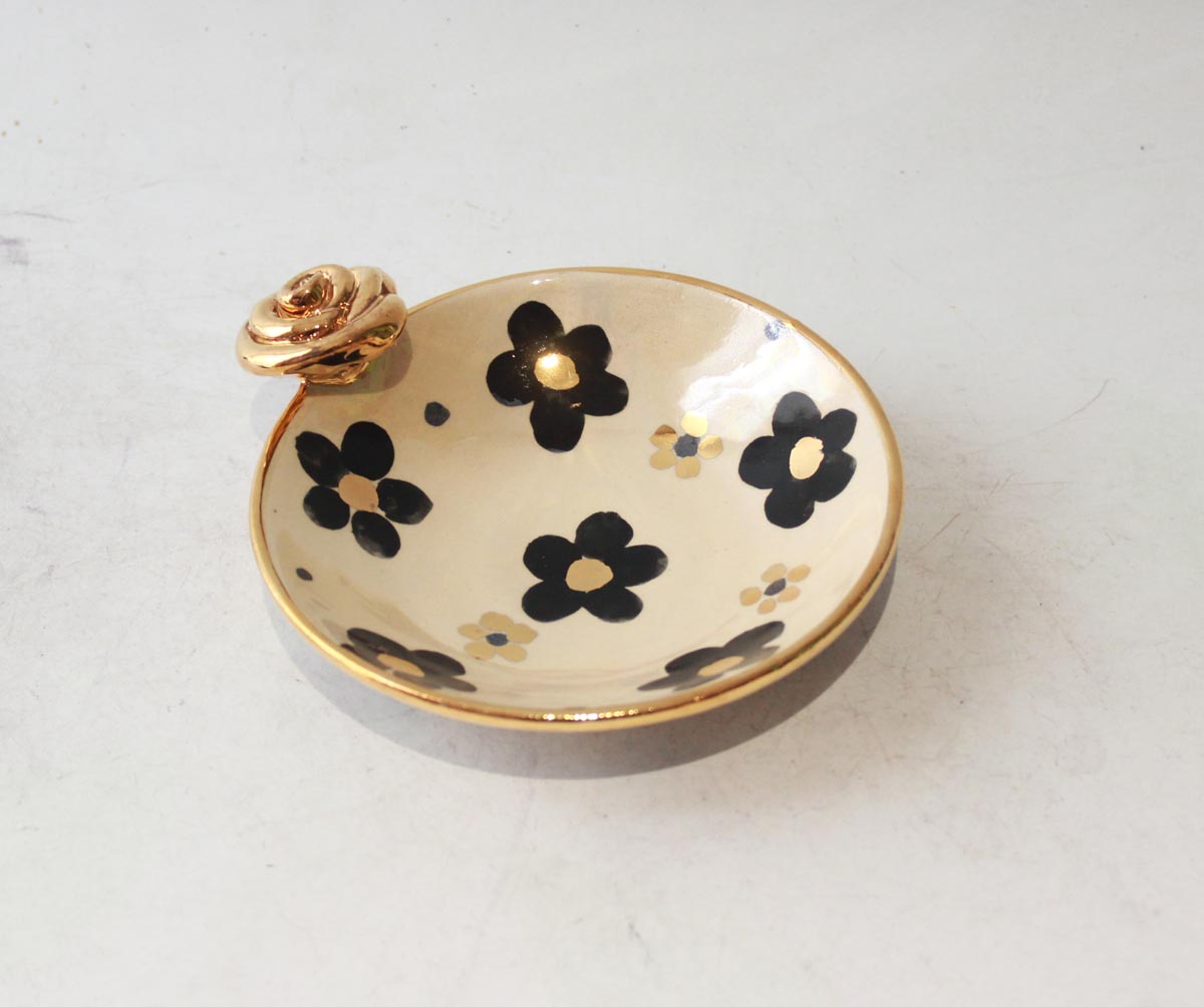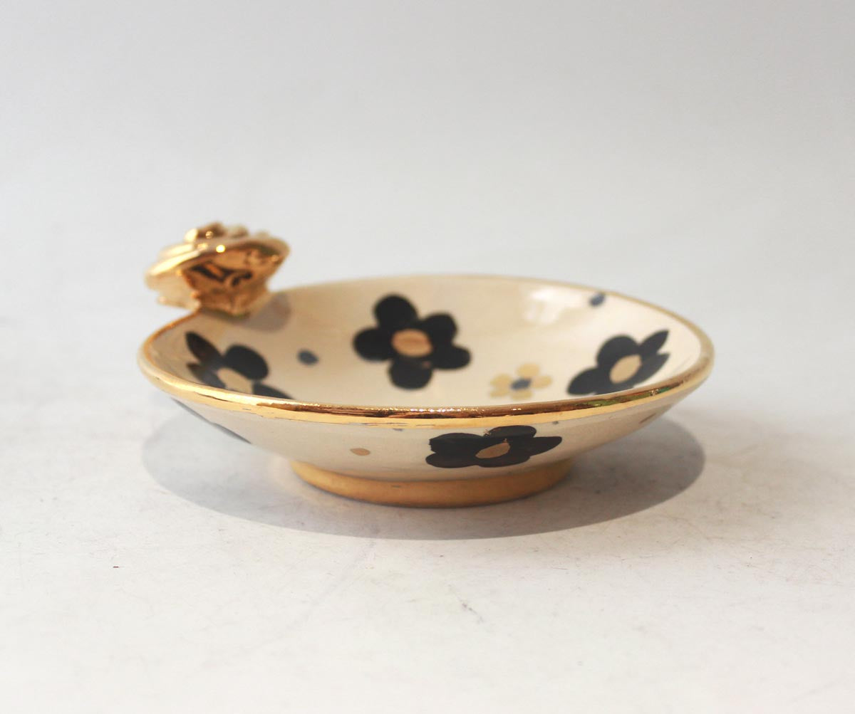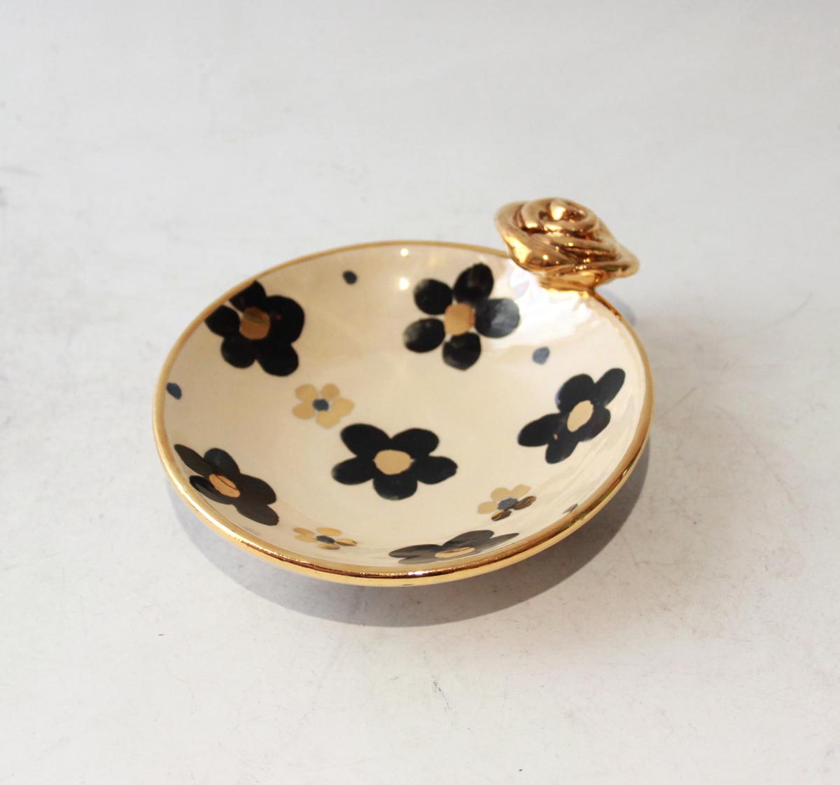 Mary Rose's Saucers measure around 4 inches in diameter and feature a little ceramic rose on their rim...despite their size they carry all the whimsical charm that makes her work so special! This one is painted in "Black and White Daisy" with accents of 24 carat gold