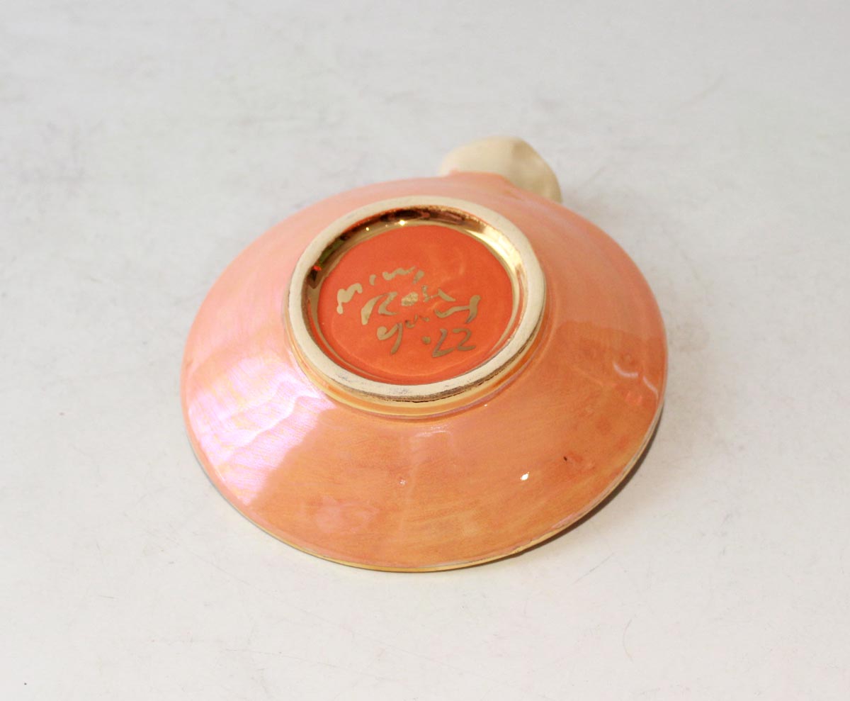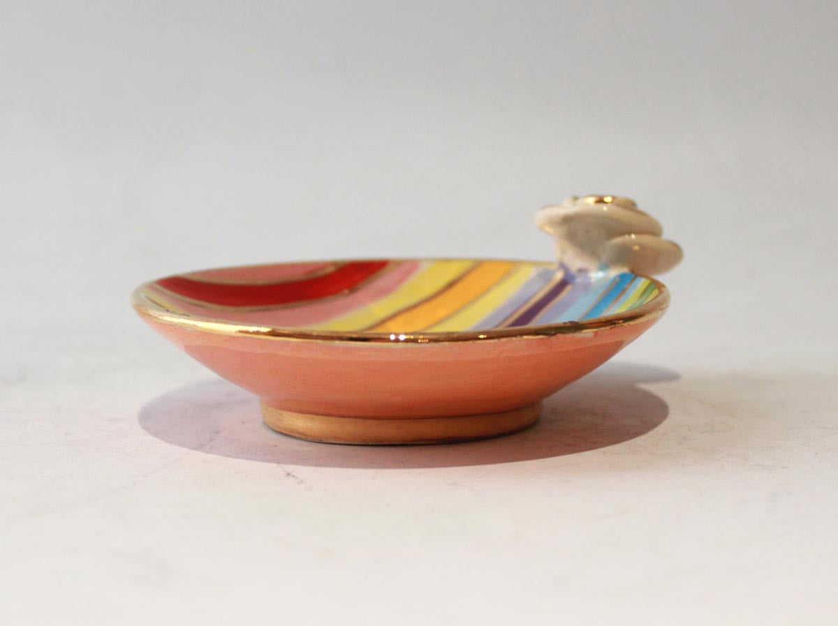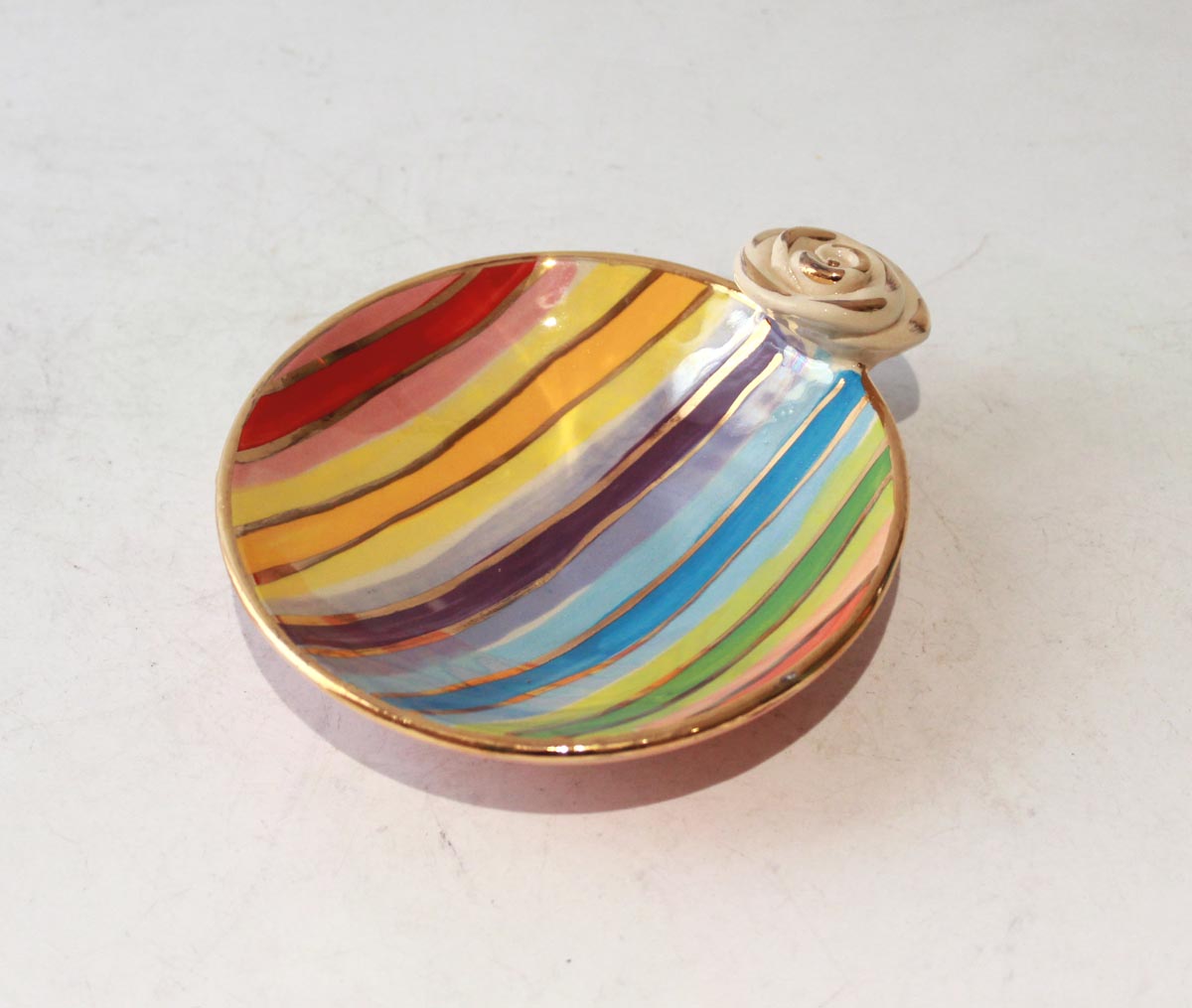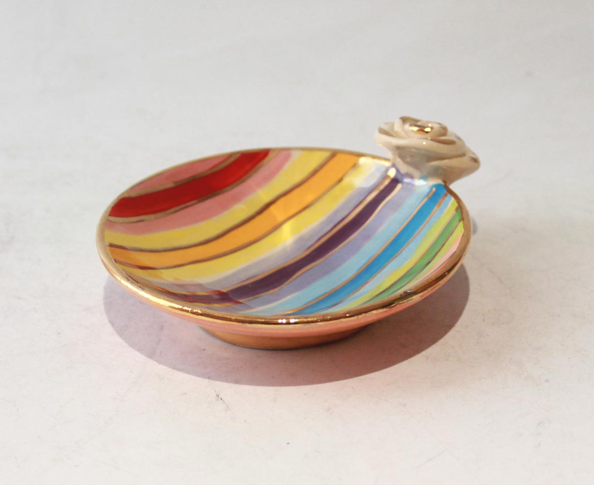 Mary Rose's Saucers measure around 4 inches in diameter and feature a little ceramic rose on their rim...despite their size they carry all the whimsical charm that makes her work so special! This one is painted in "Lustred Stripe" design with accents of 24 carat gold