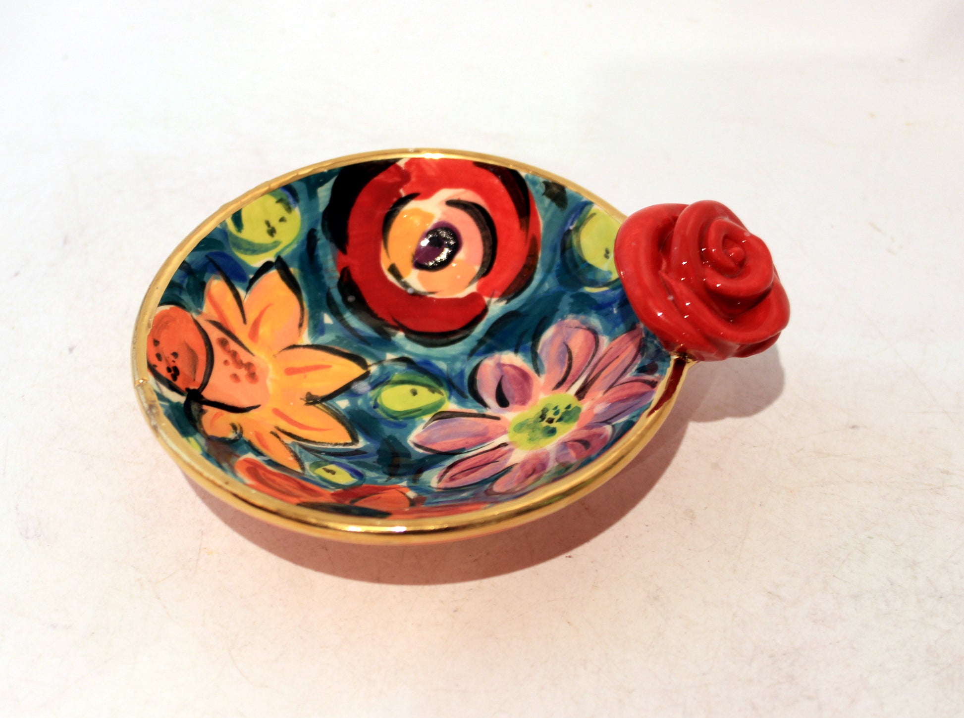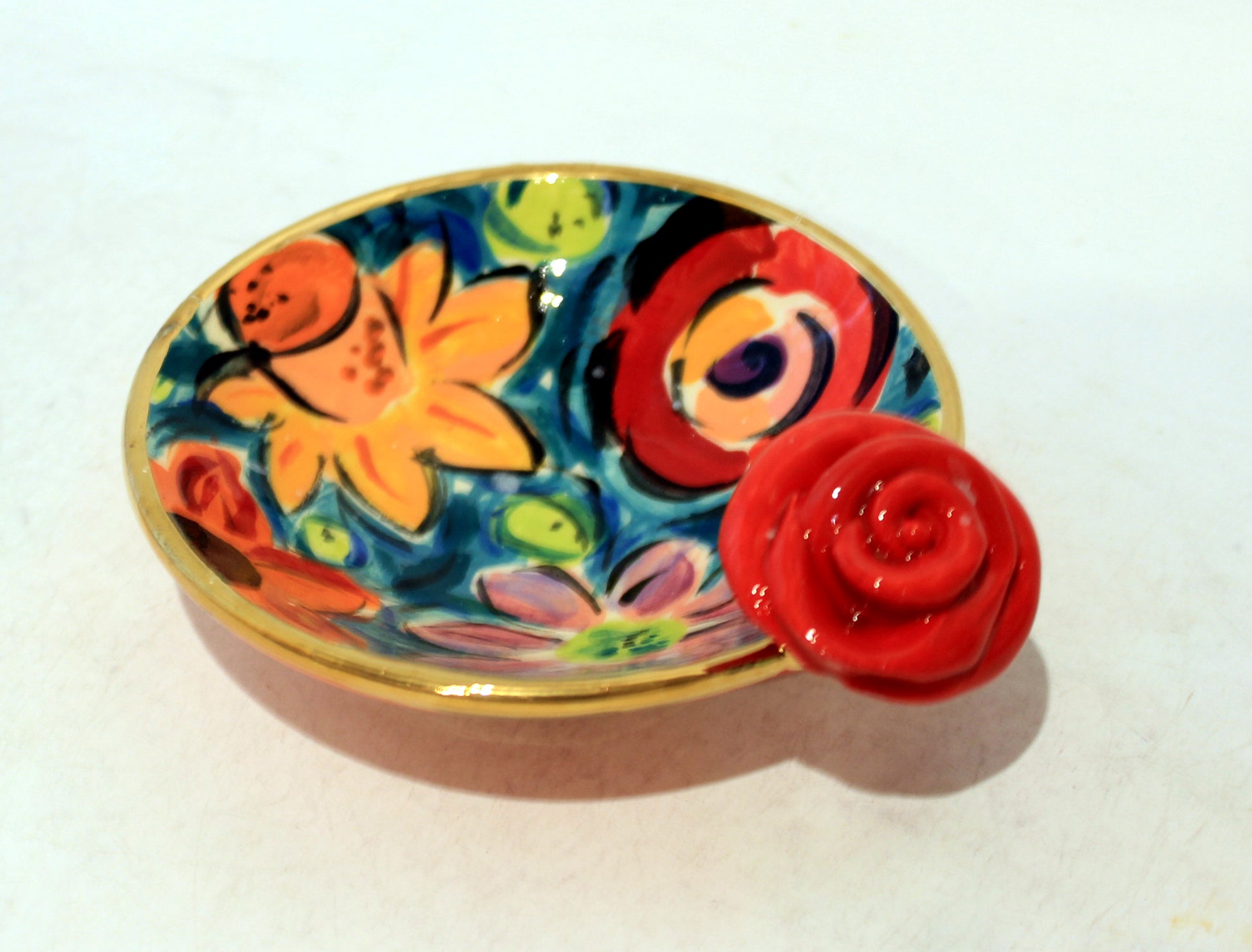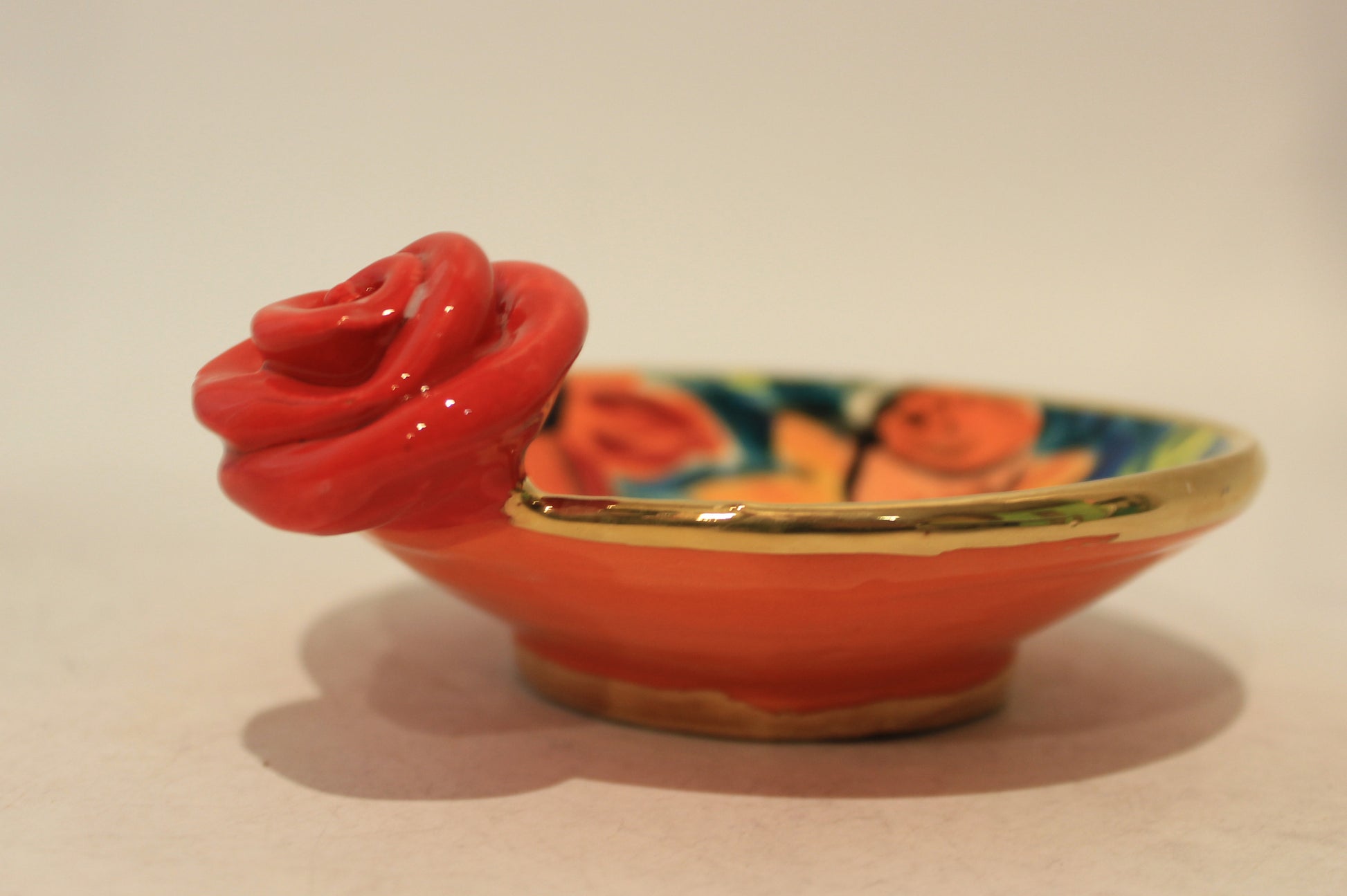 A Rose Saucer is a tiny dish meant as a treasure for a pottery lover. It's a shallow bowl with a single Rose applied to the rim. This design is typical Mary Rose flower blooms with a background of dark greens which seem to look like wild undergrowth