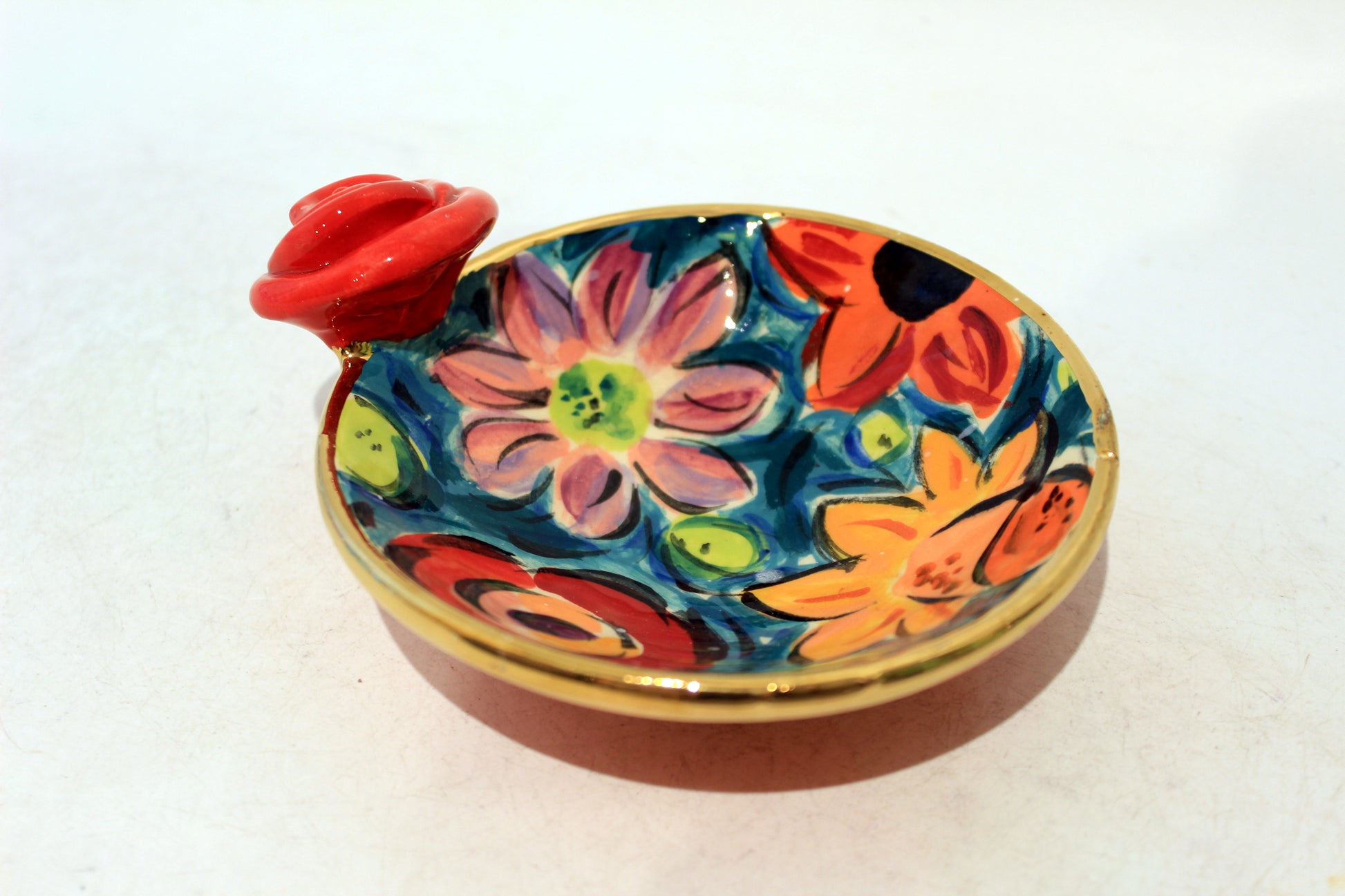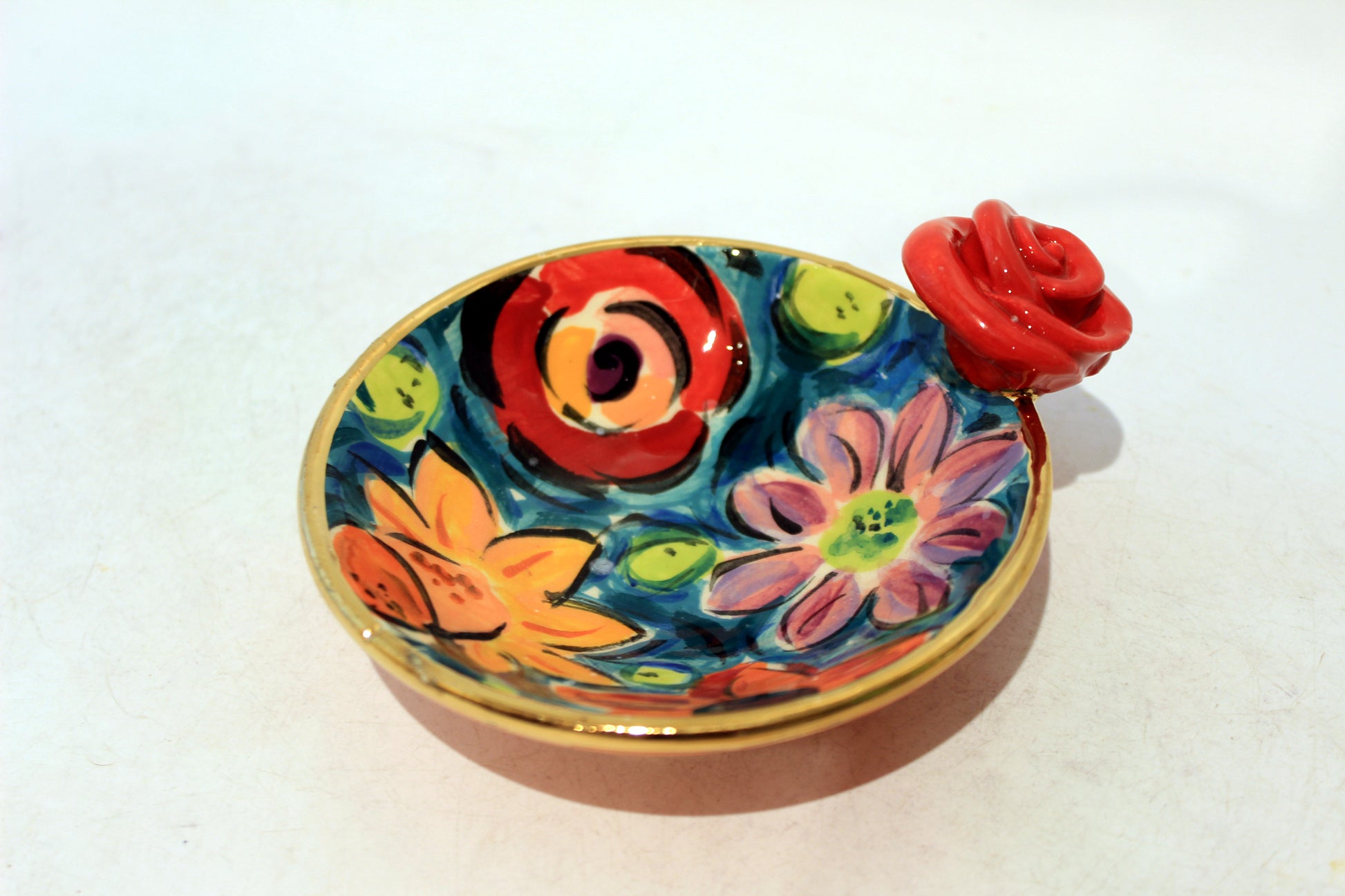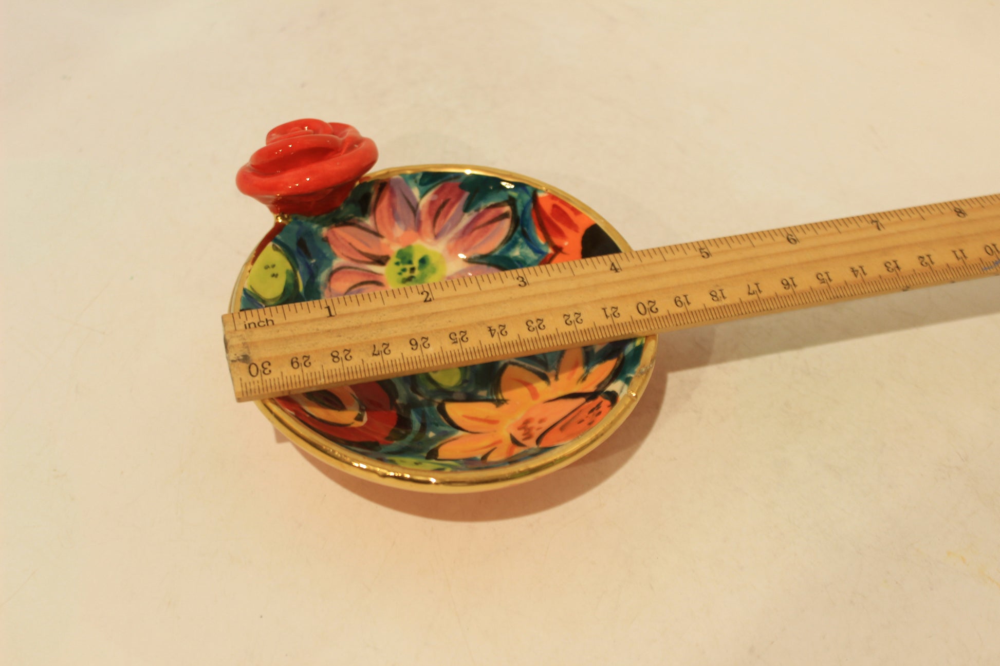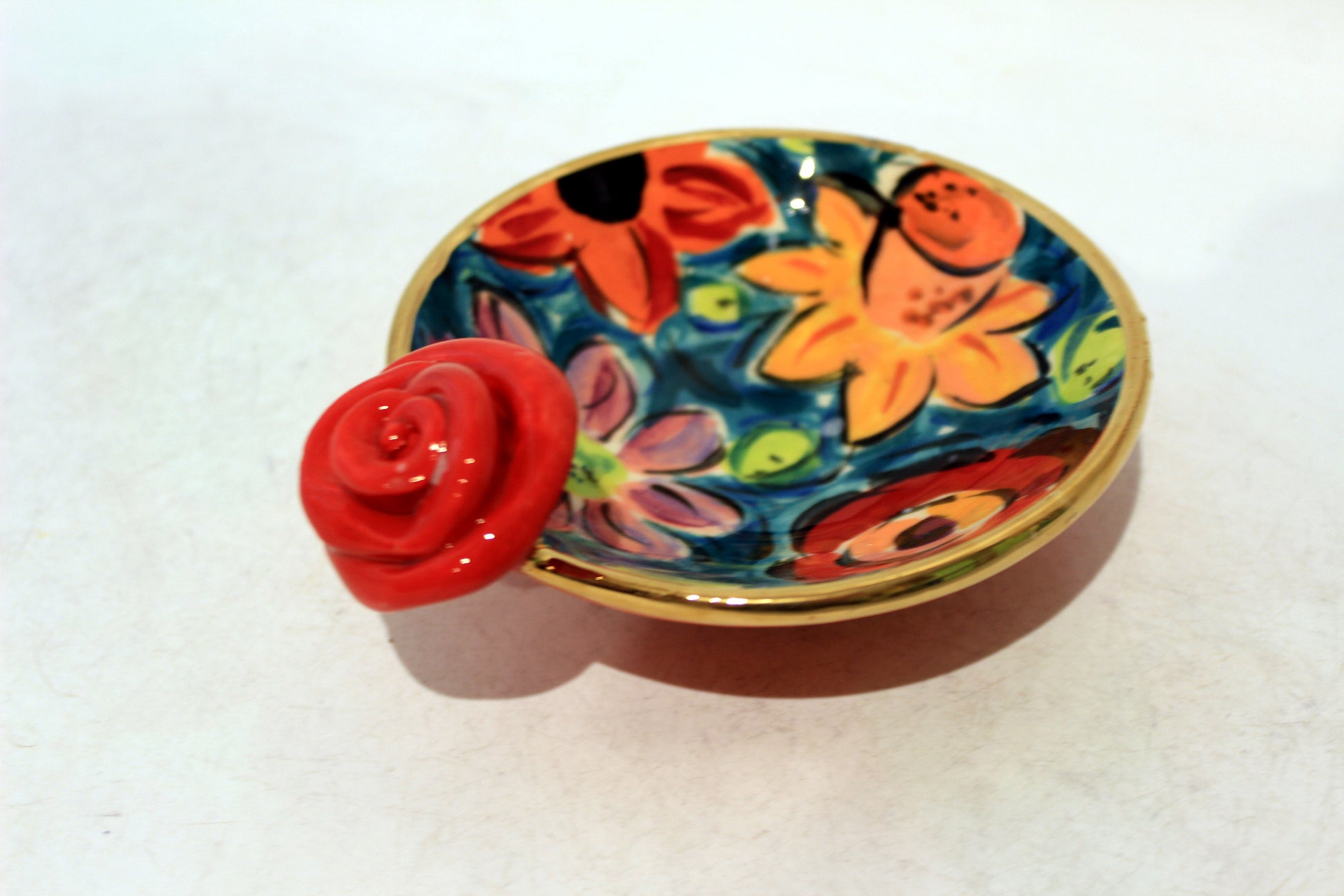A Rose Saucer is a tiny dish meant as a treasure for a pottery lover. It's a shallow bowl with a single Rose applied to the rim. This design is typical Mary Rose flower blooms with a background of dark greens which seem to look like wild undergrowth
