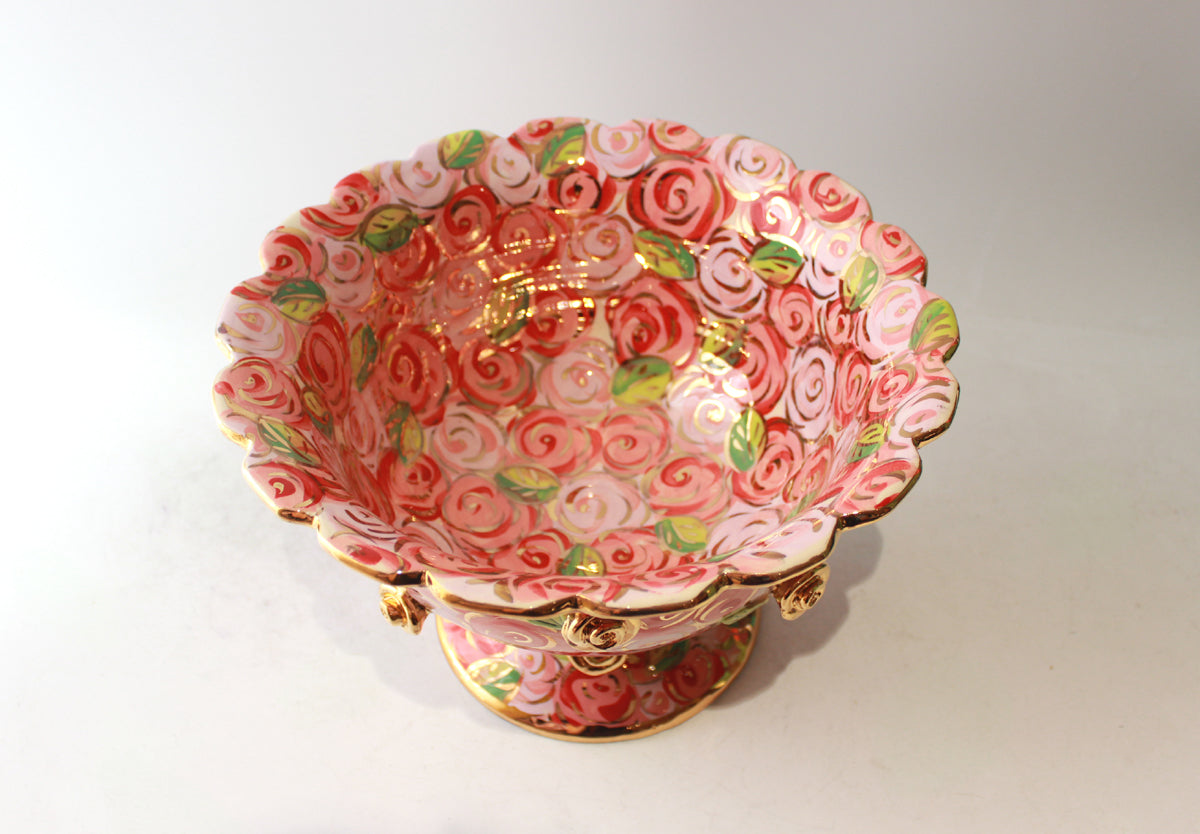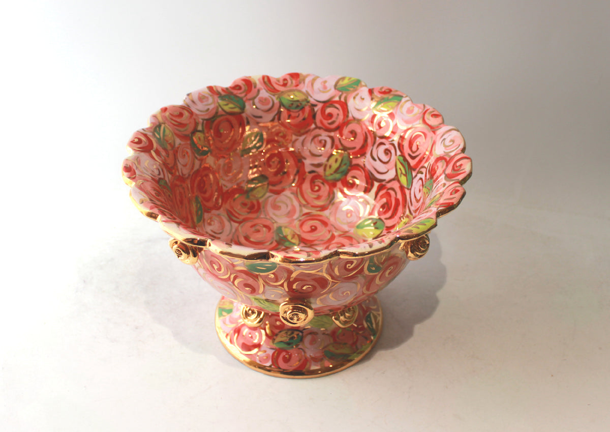 Mary Rose's Punch Bowls measure around 12 inches in diameter and make wonderfully fun containers for Punch or indeed simply beautiful display pieces...this one is painted in "Pink Rosebush", has a "Fluted" rim, and features many intricate ceramic roses which have been studded all over its surface...