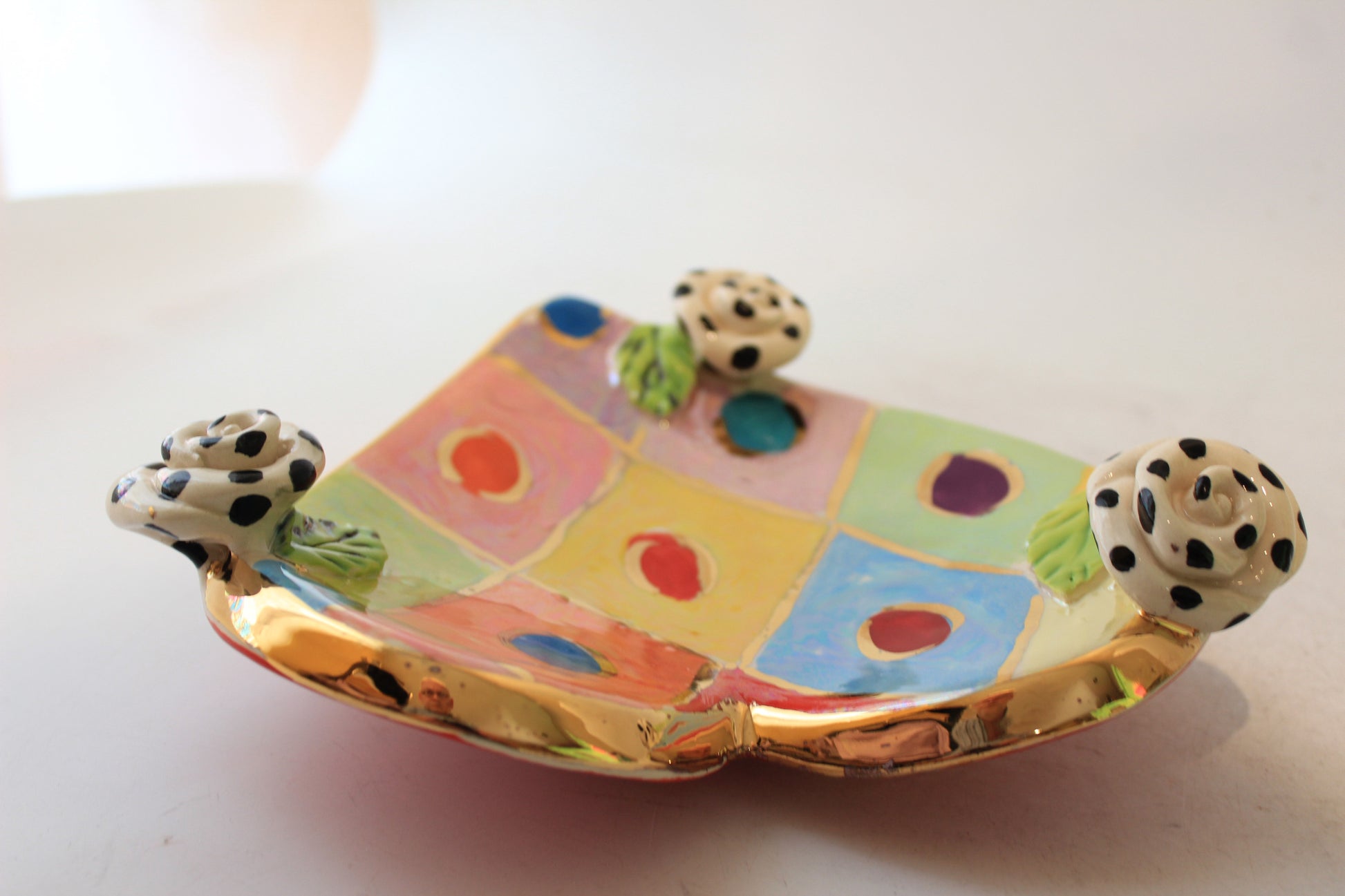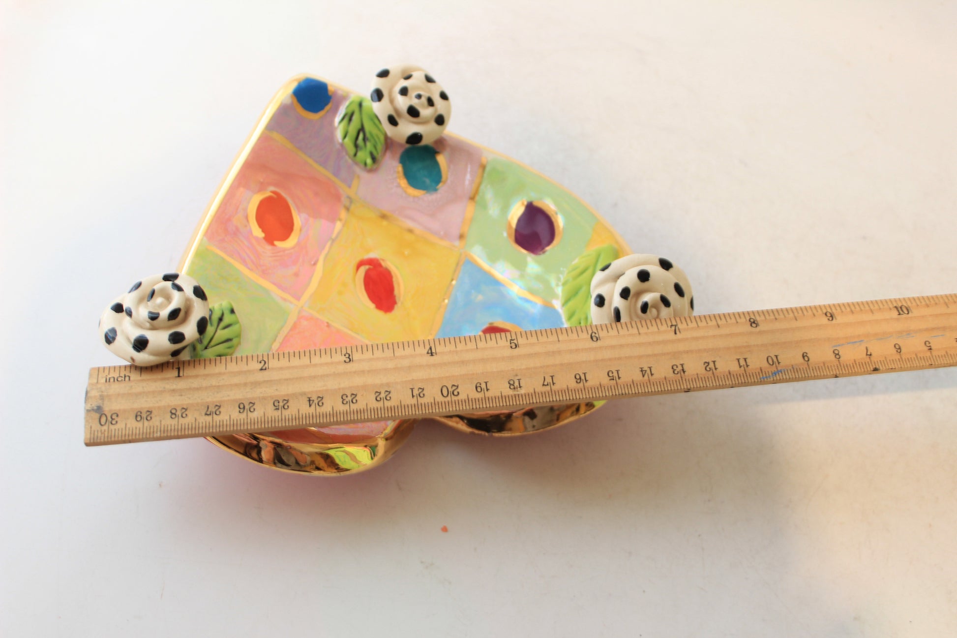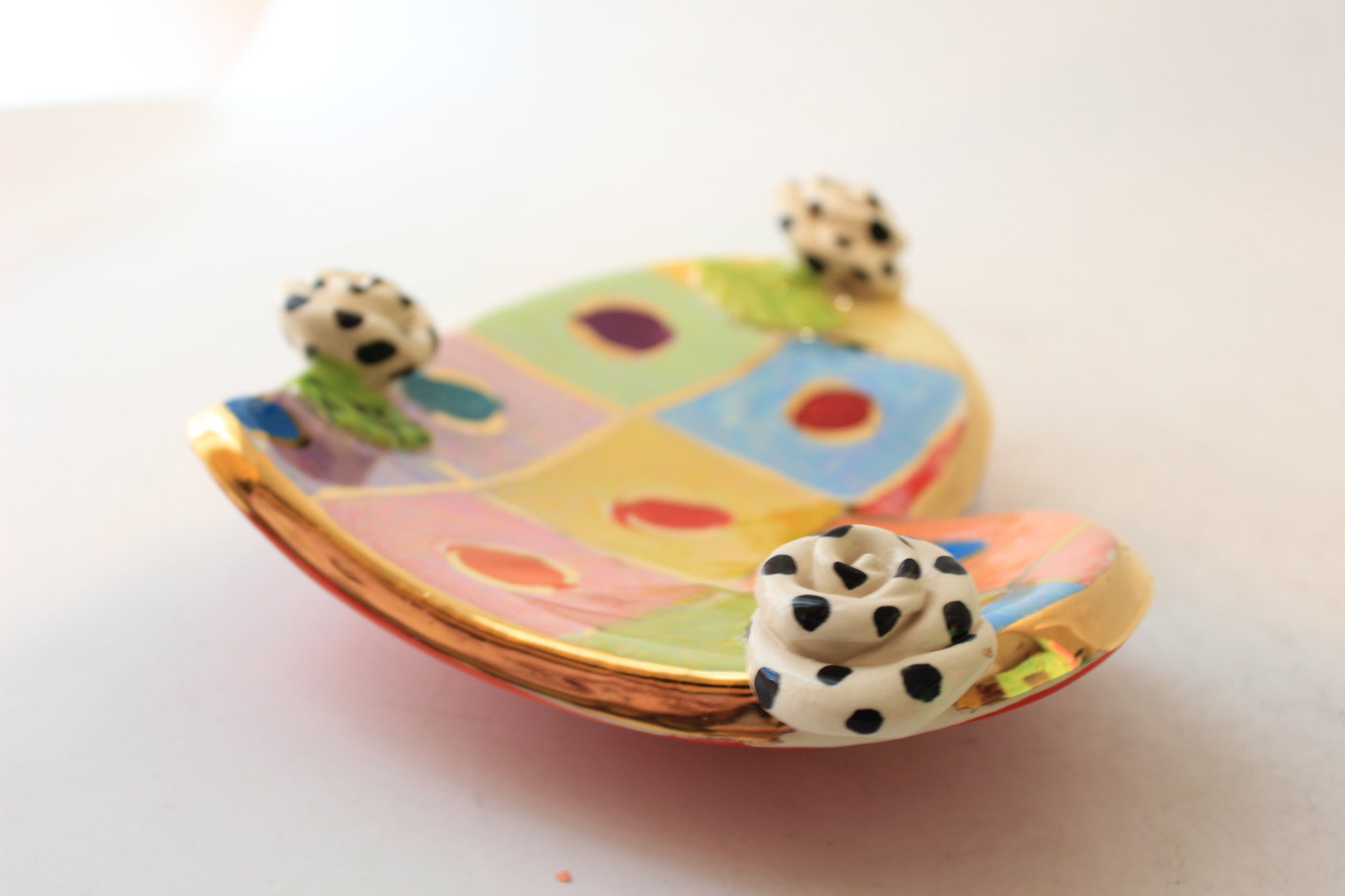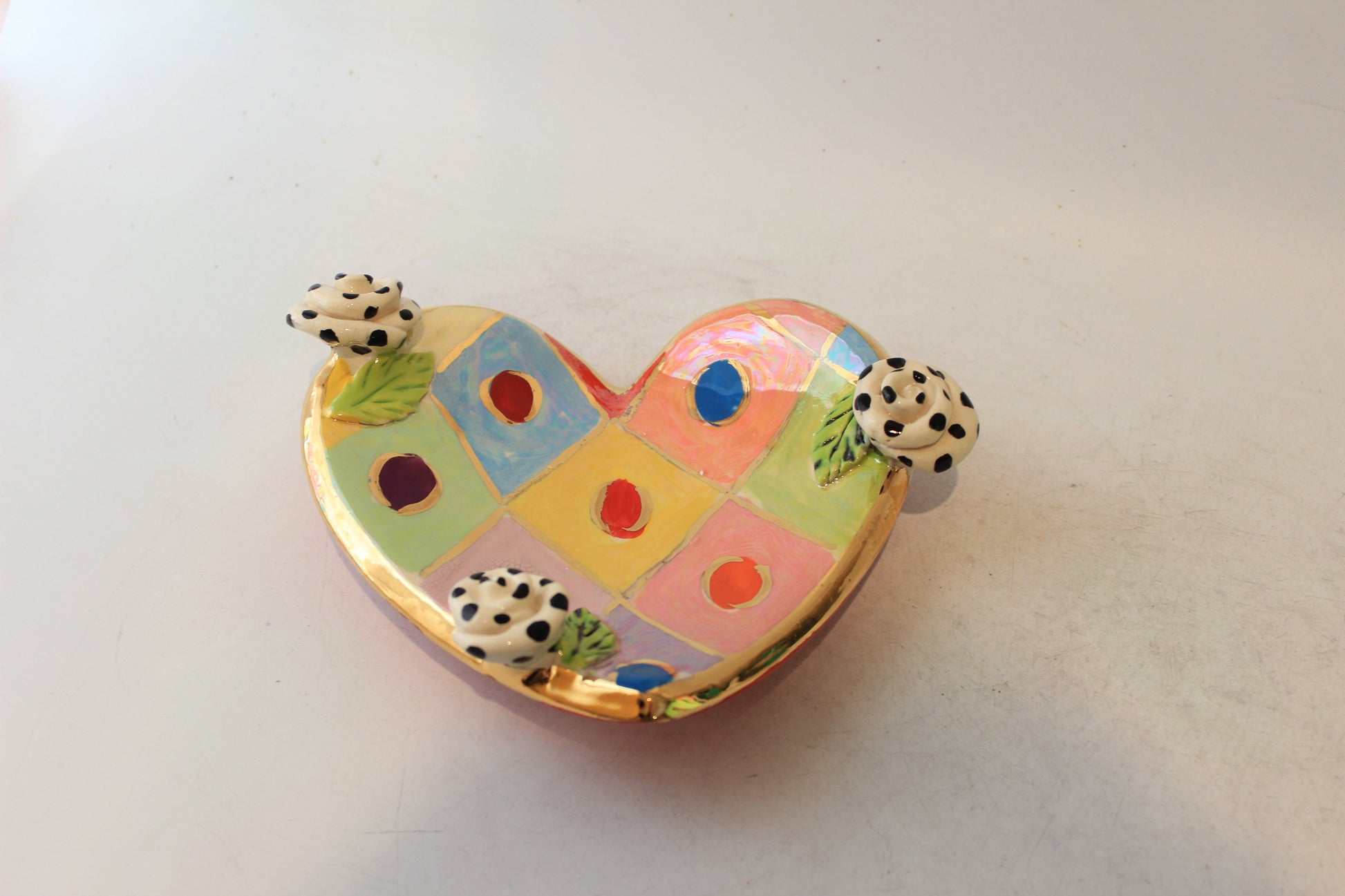 The Heart Shaped Soap Dish is springing extra roses, and they're white roses with little black polka dots. This is a variation on the heart dish theme and one which will help keep a slippery bar of soap on the dish instead of slithering away all over the bathroom. The design is diamonds