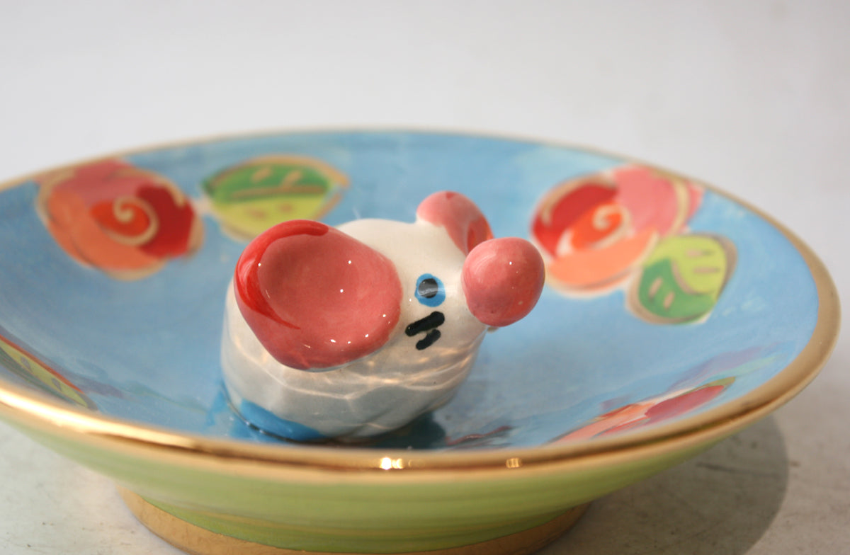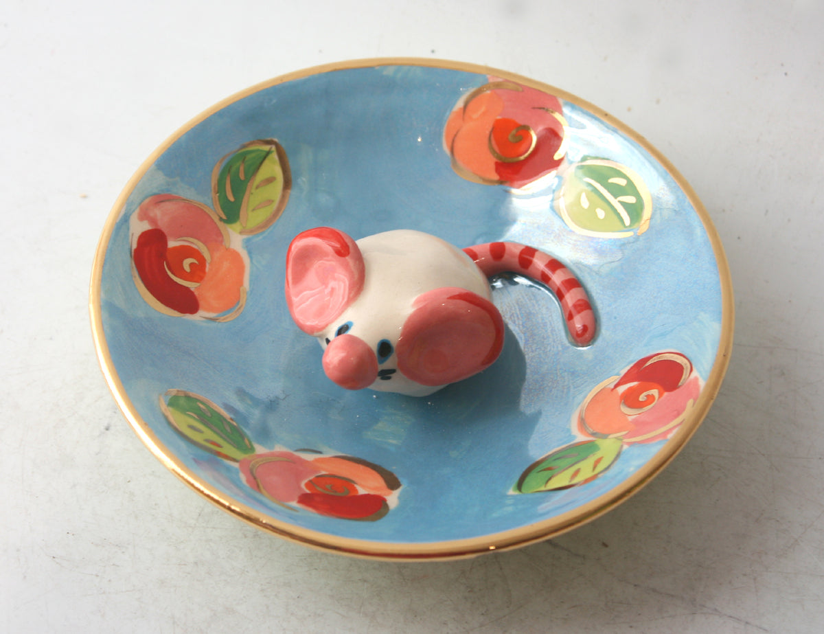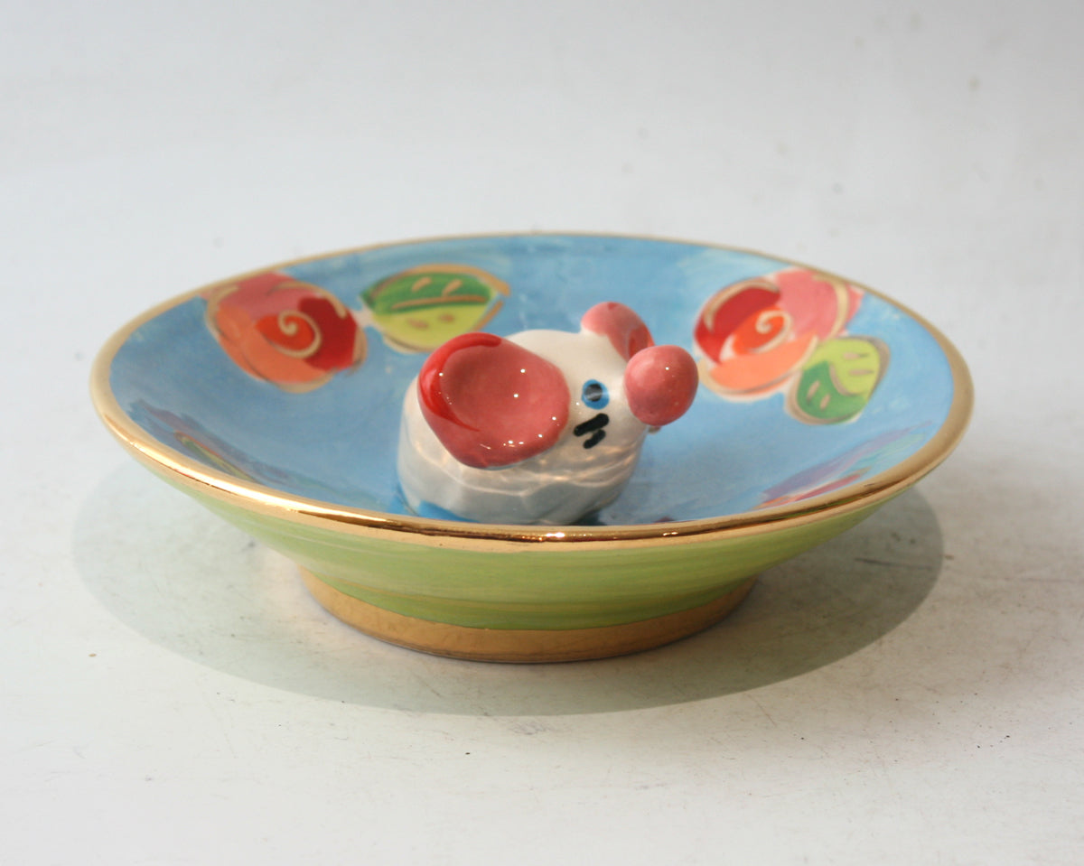 This Mary Rose Young Saucer seems to have obtained an uninvited guest! It is painted in Gold New Rose on a beautiful blue, and features a little ceramic mouse sitting happily in its centre...
