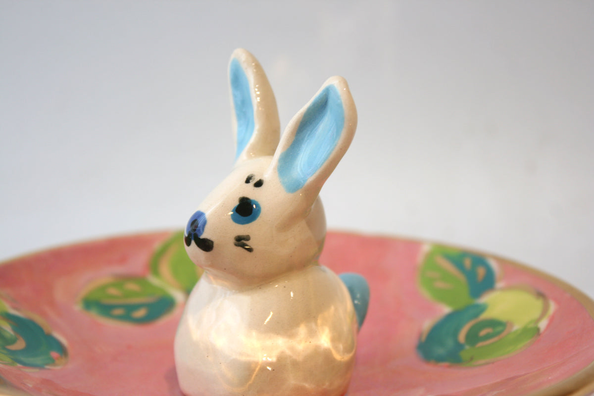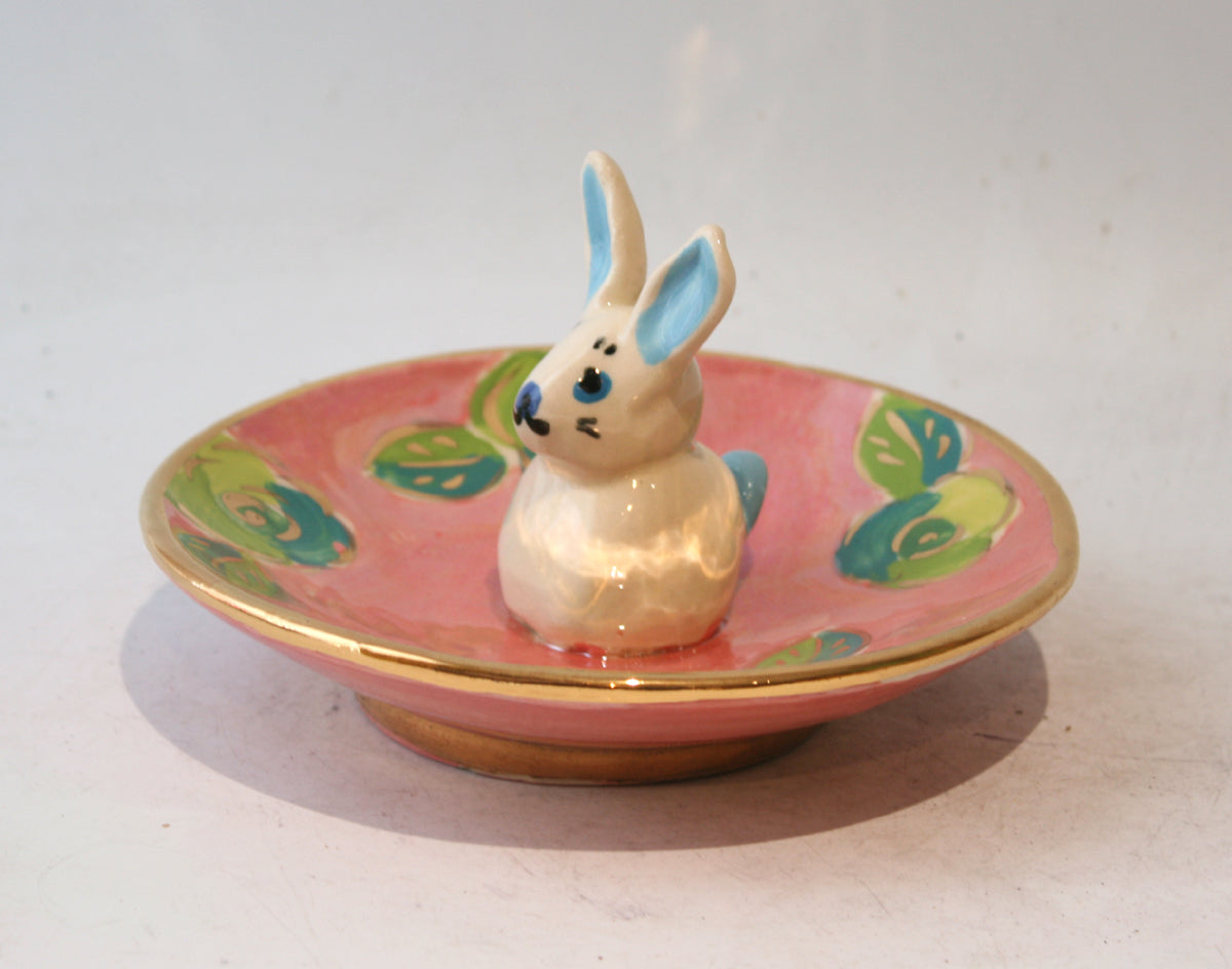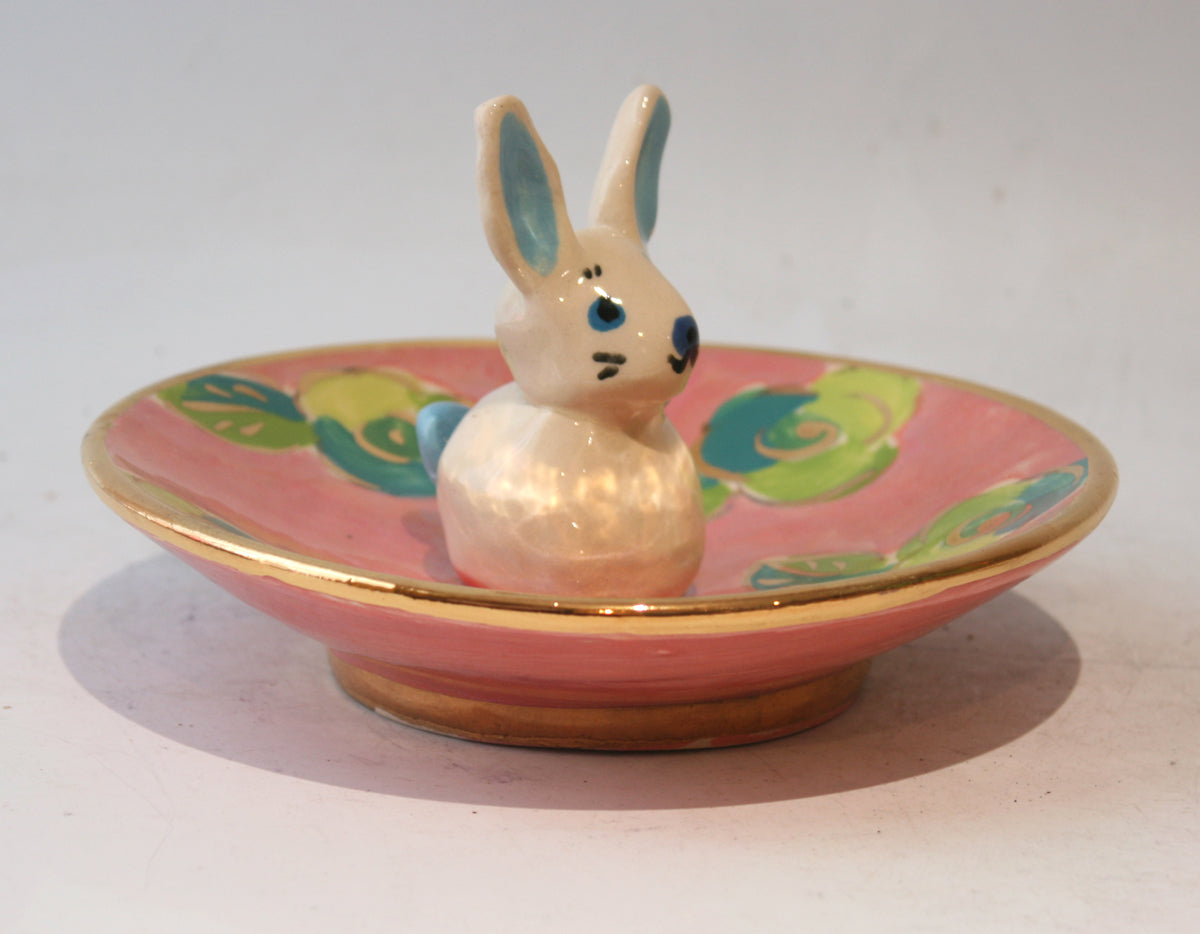 This little Saucer seems to have encountered an uninvited guest! It is painted in Gold New Rose on a pretty pink background, and also features an intricate ceramic white Rabbit in its centre...