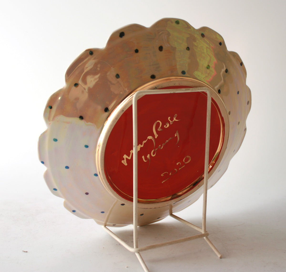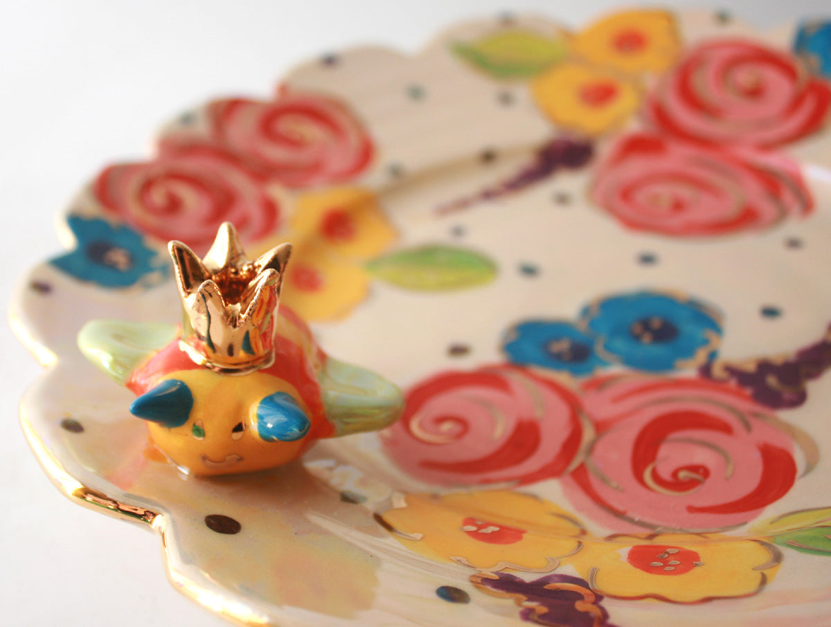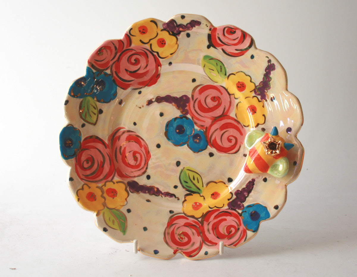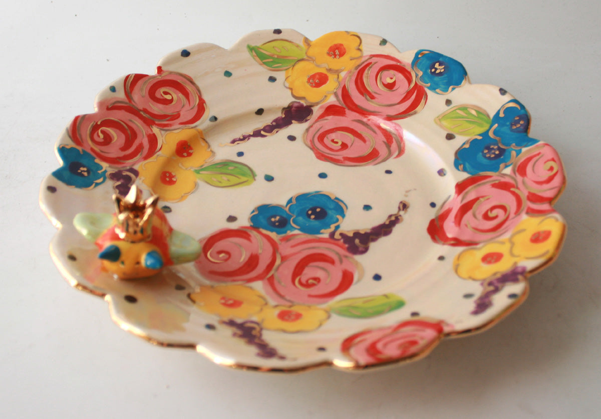 Measuring just over 9 inches in diameter, this joyful little plate could just be your new presentation piece! It's painted in "Vintage Floral", and features a friendly little ceramic bee....