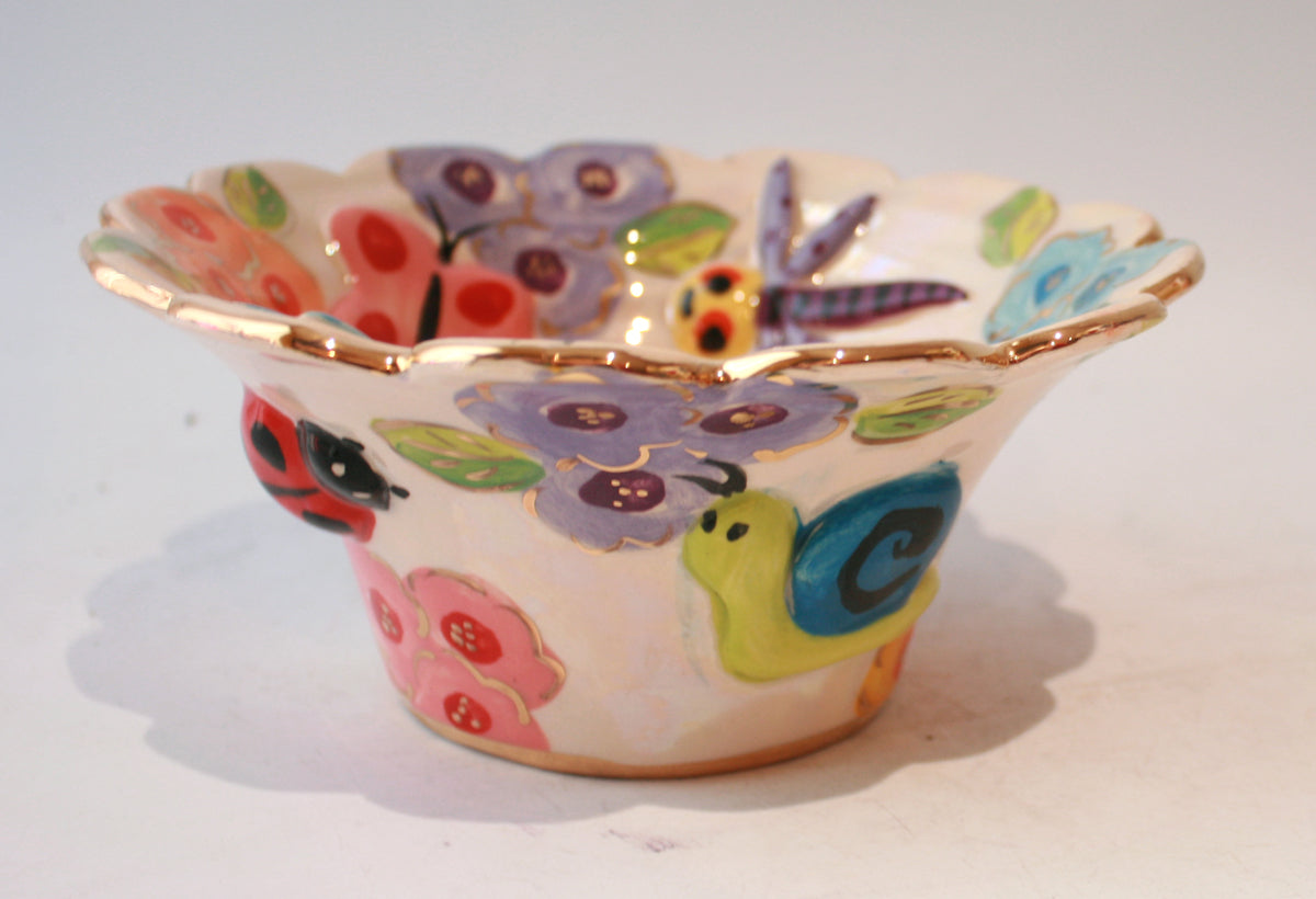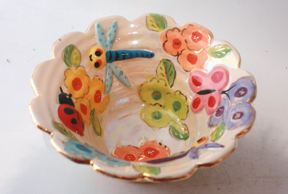 This Small Flared Serving Bowl is painted in a new Mary Rose Young design, "Bugs", which features adorable ceramic creatures roaming around pastel blooms on an iridescent background. It has a scalloped gold rim and measures around 8 inches in diameter...