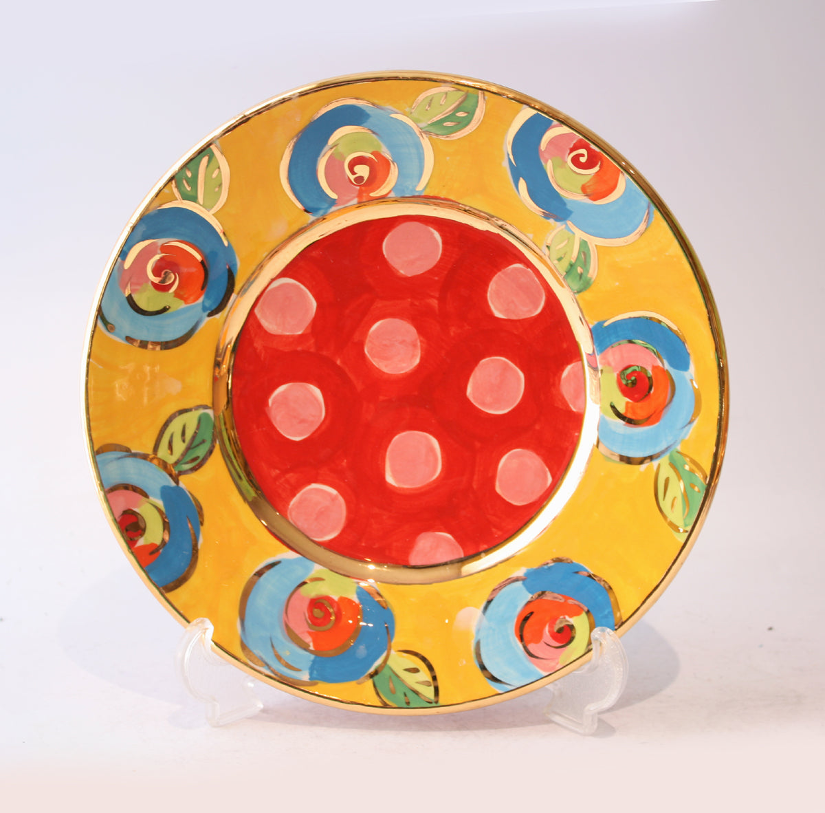 Mary Rose's Side Plates measure just under 9 inches in diameter and are the perfect companion to any meal...This one is painted in Roses on Yellow on its outer edge with "Dotty Red" in the centre and is eminently use-able; though you may have trouble finding the food once its been put onto the plate!