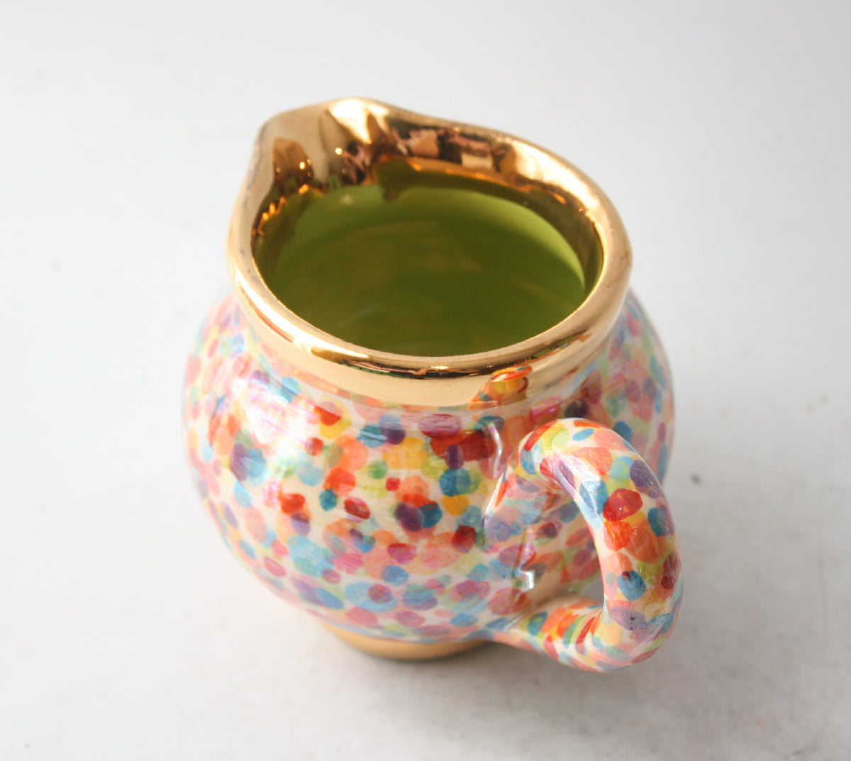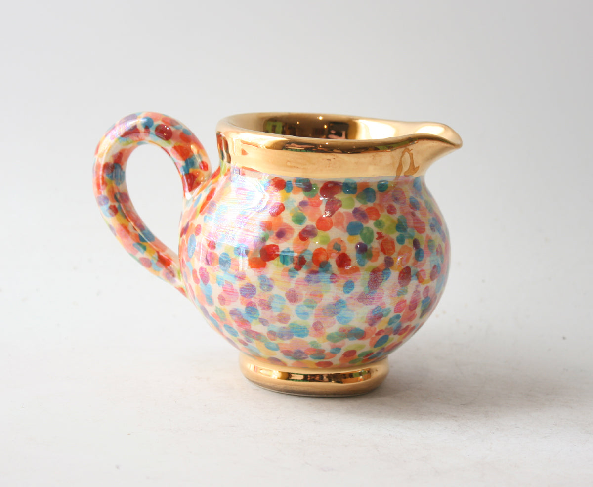 A small Barrel Jug made by Mary Rose stands around 4 inches high and has a delightful pot-bellied shape...this one is decorated in "Confetti" design, with accents of 24 carat gold throughout!