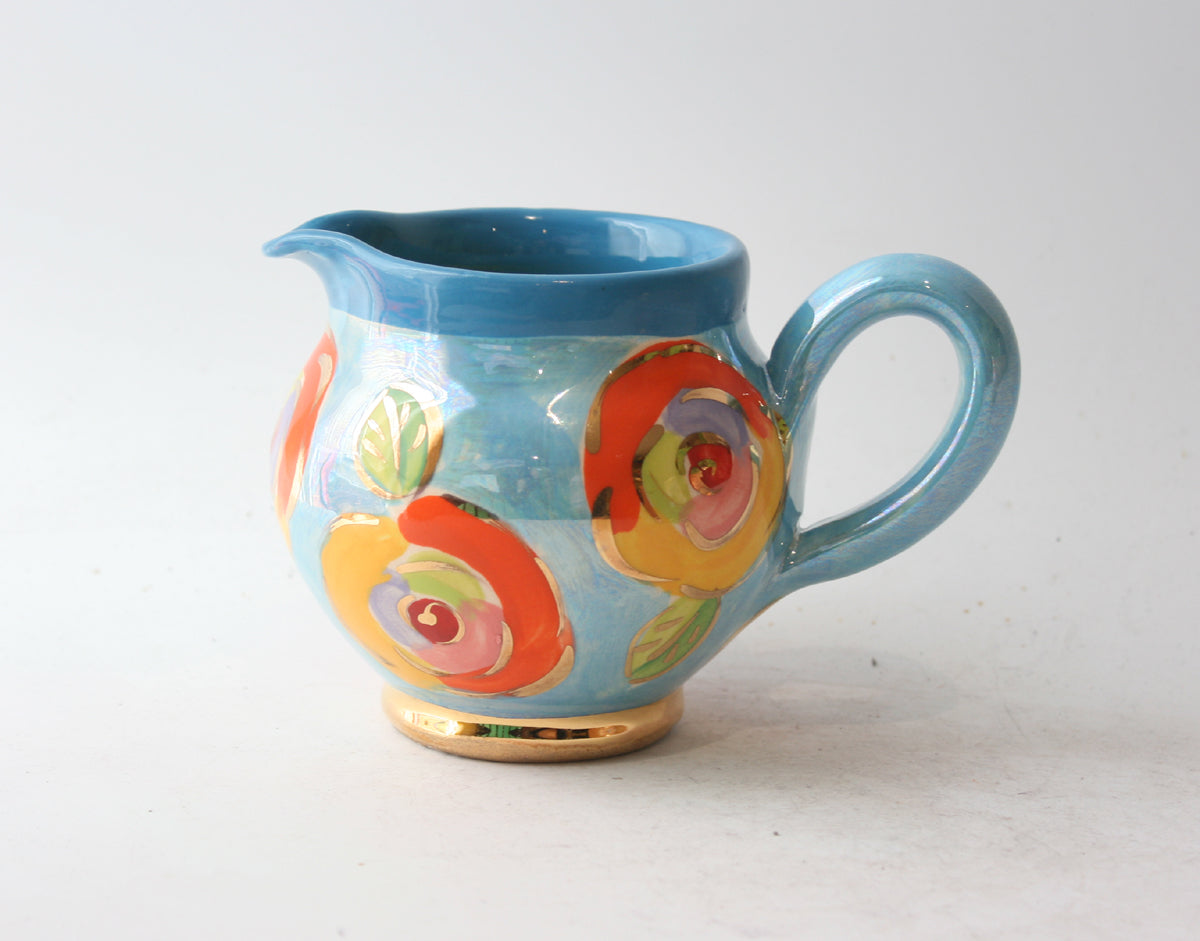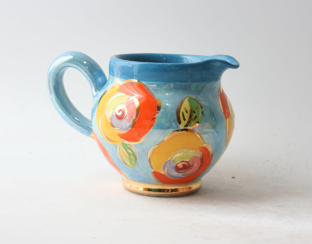 A small Barrel Jug made by Mary Rose stands around 4 inches high and has a delightful pot-bellied shape...this one is painted in "Gold New Rose" on a beautiful pearlescent blue and has accents of 24 carat gold throughout!