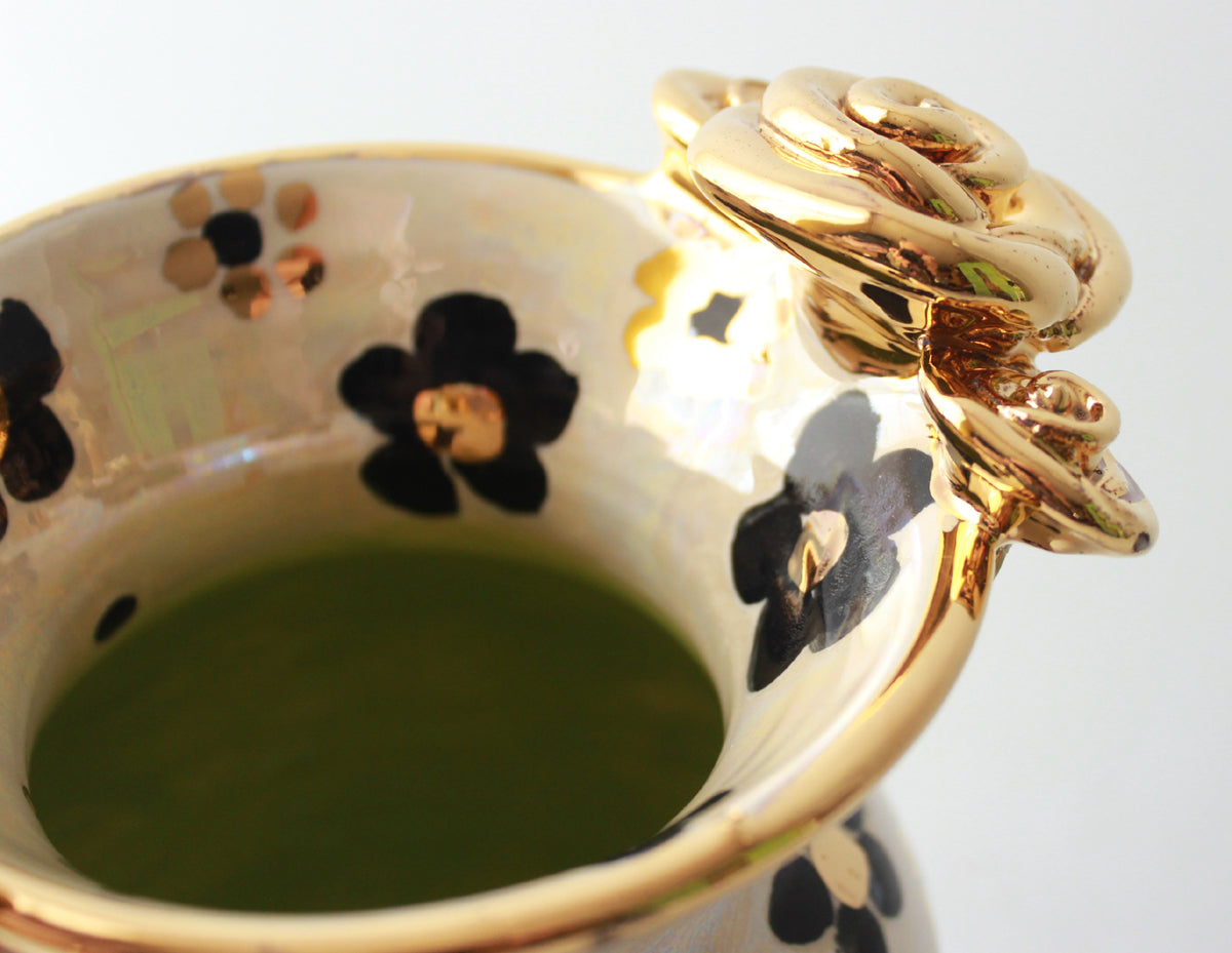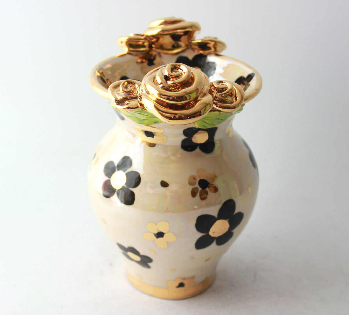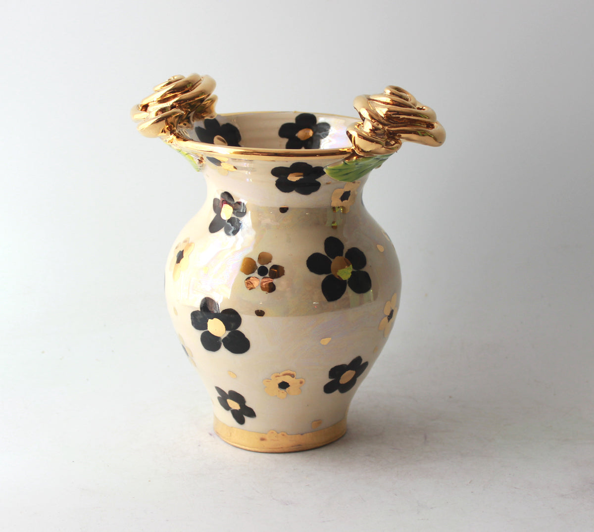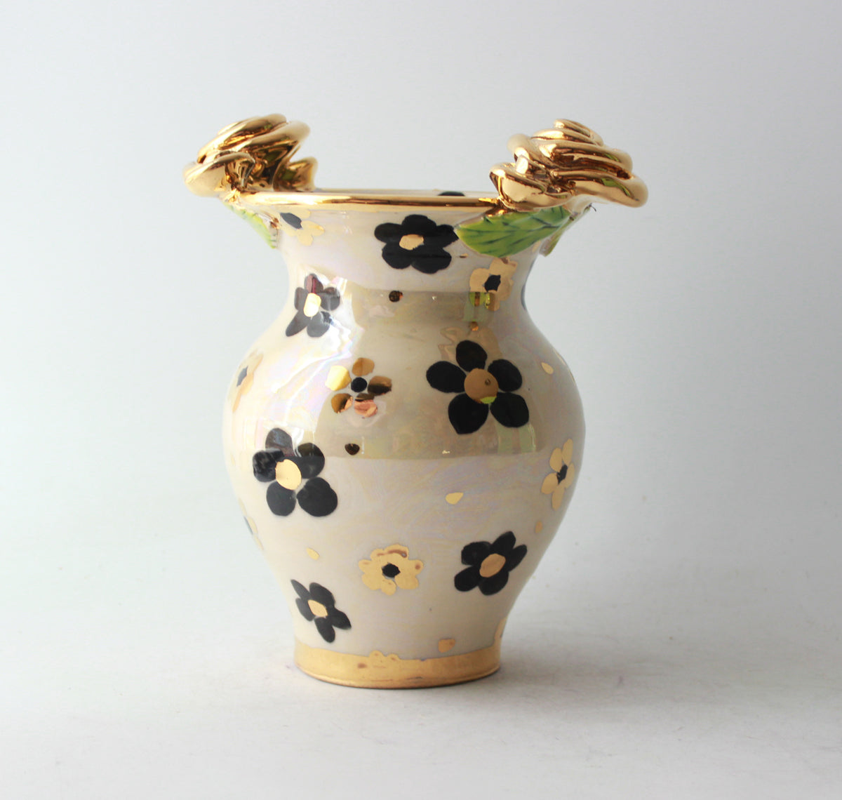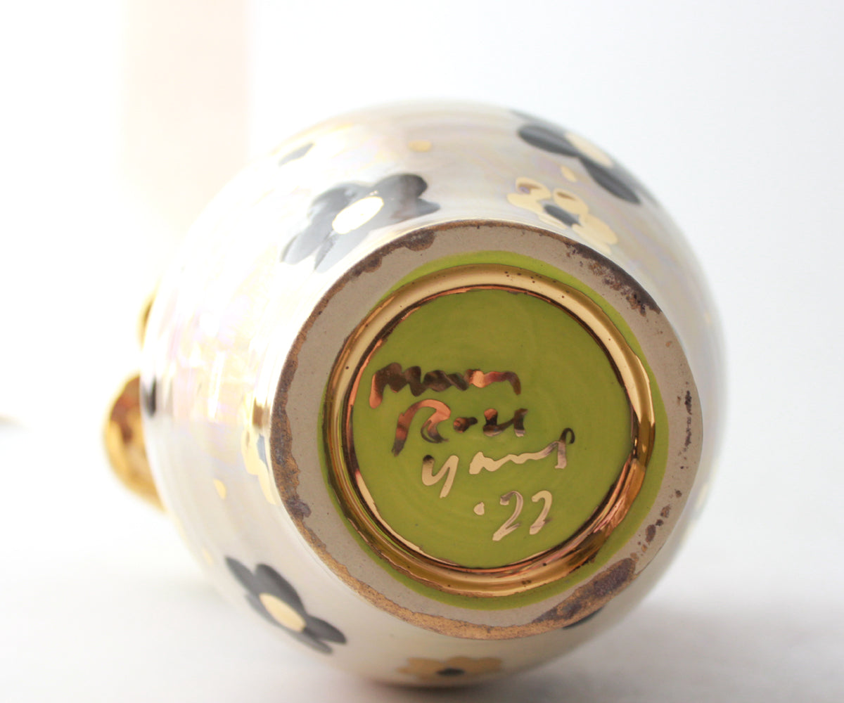 This Small Fat Vase stands around 6.5 inches tall and showcases one of Mary Rose's newest designs, Black and White Daisy, which features black daisies with accents of 24 carat gold on an iridescent background...