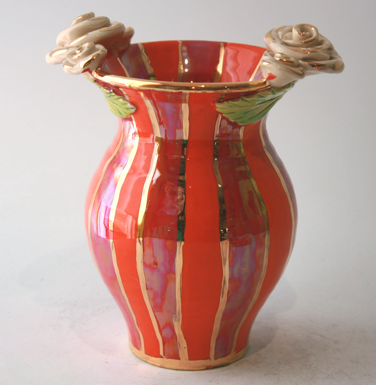 Mary Rose's Small Fat Vases stand around 6.5 inches tall and have an adorable "pot-bellied" shape...this one is painted in a new for 2020 design "Orange and Red Stripe", which features a beautiful iridescence painted over the red and we think really catches the eye!